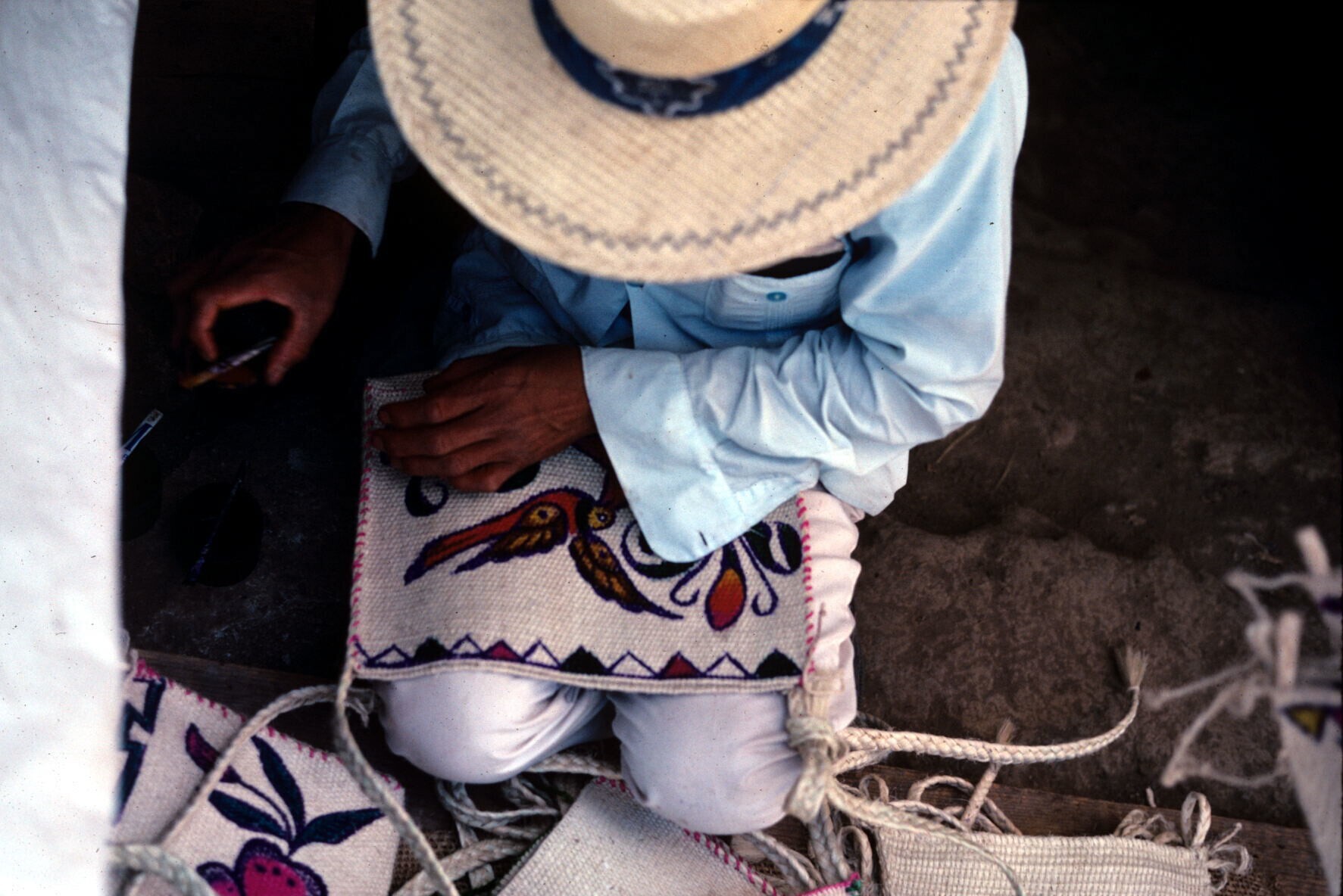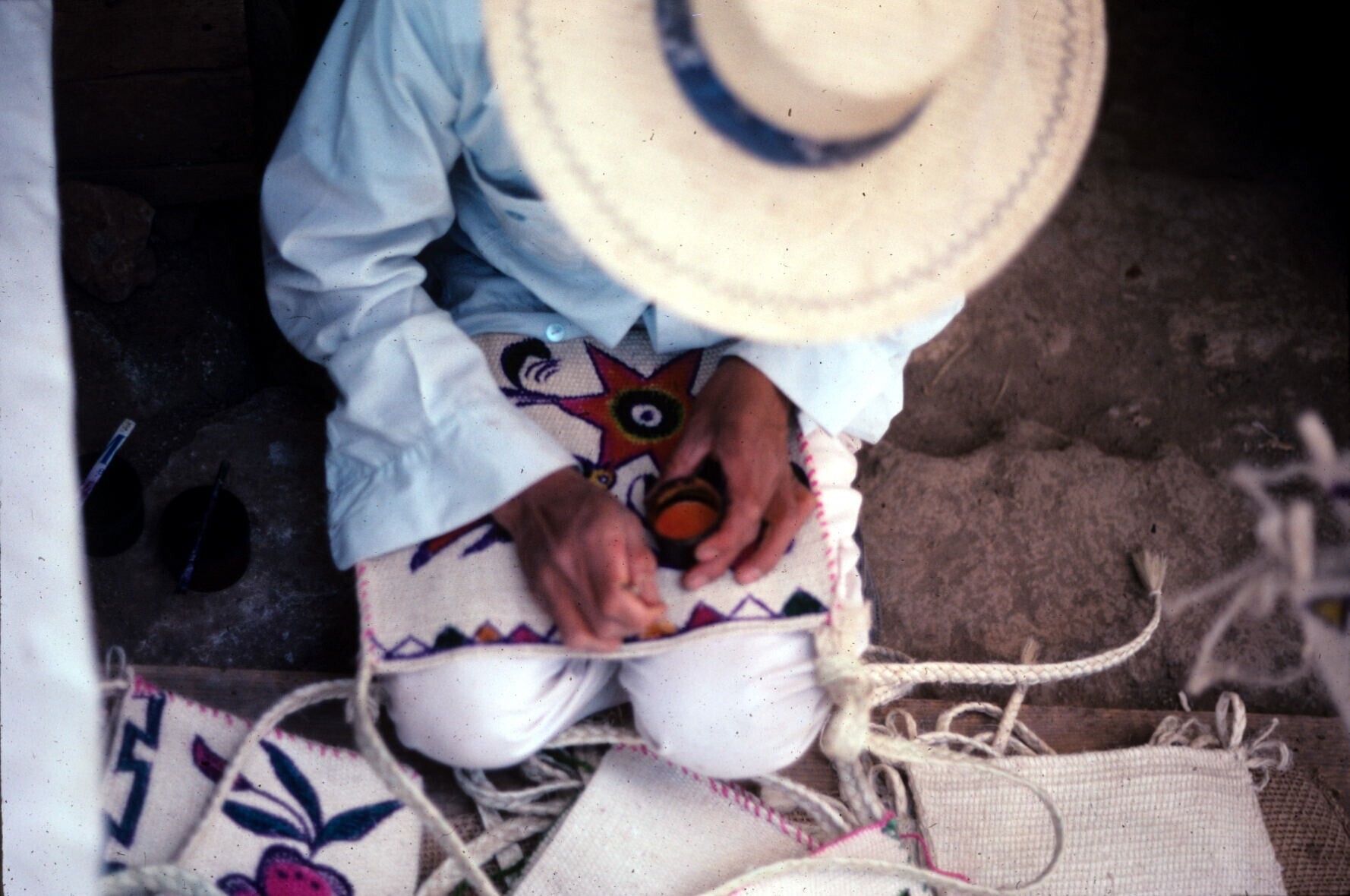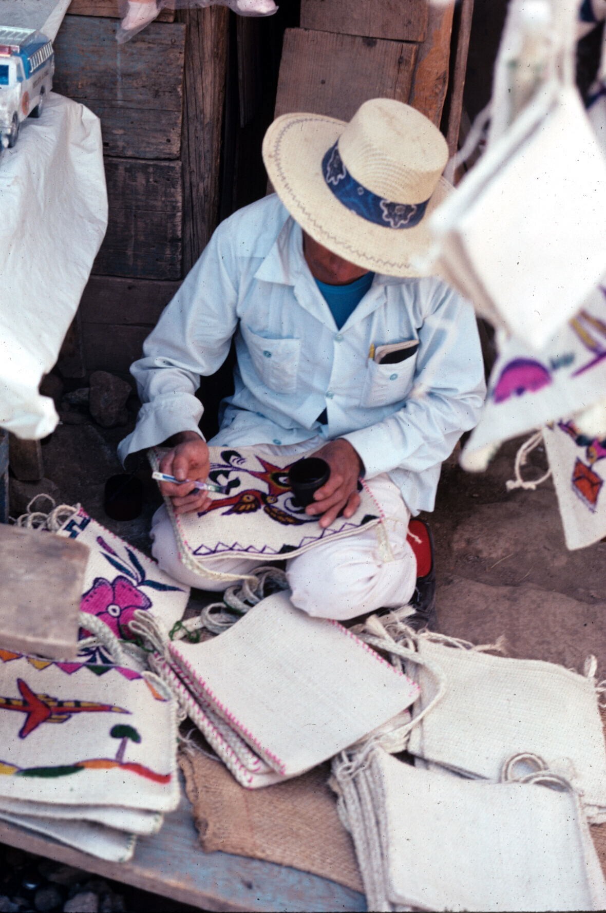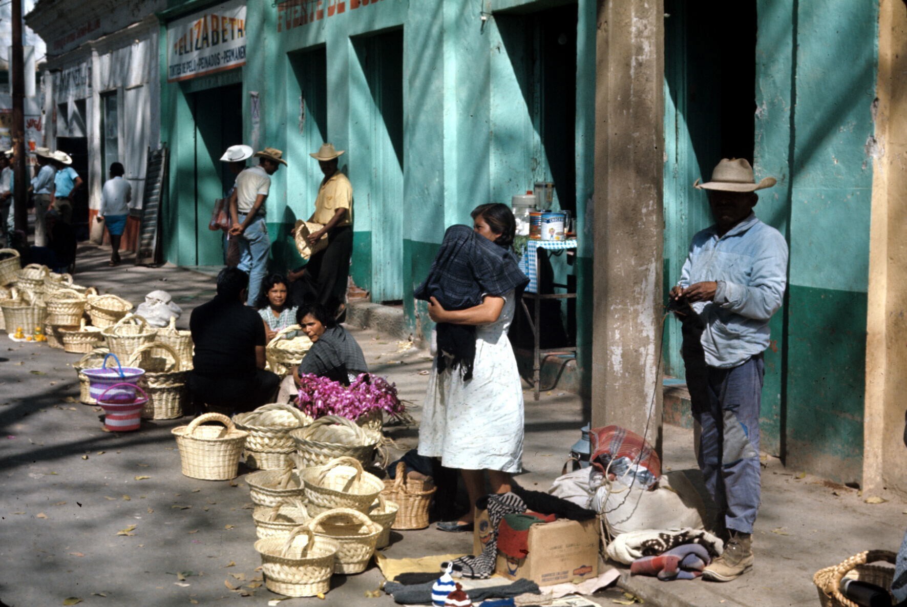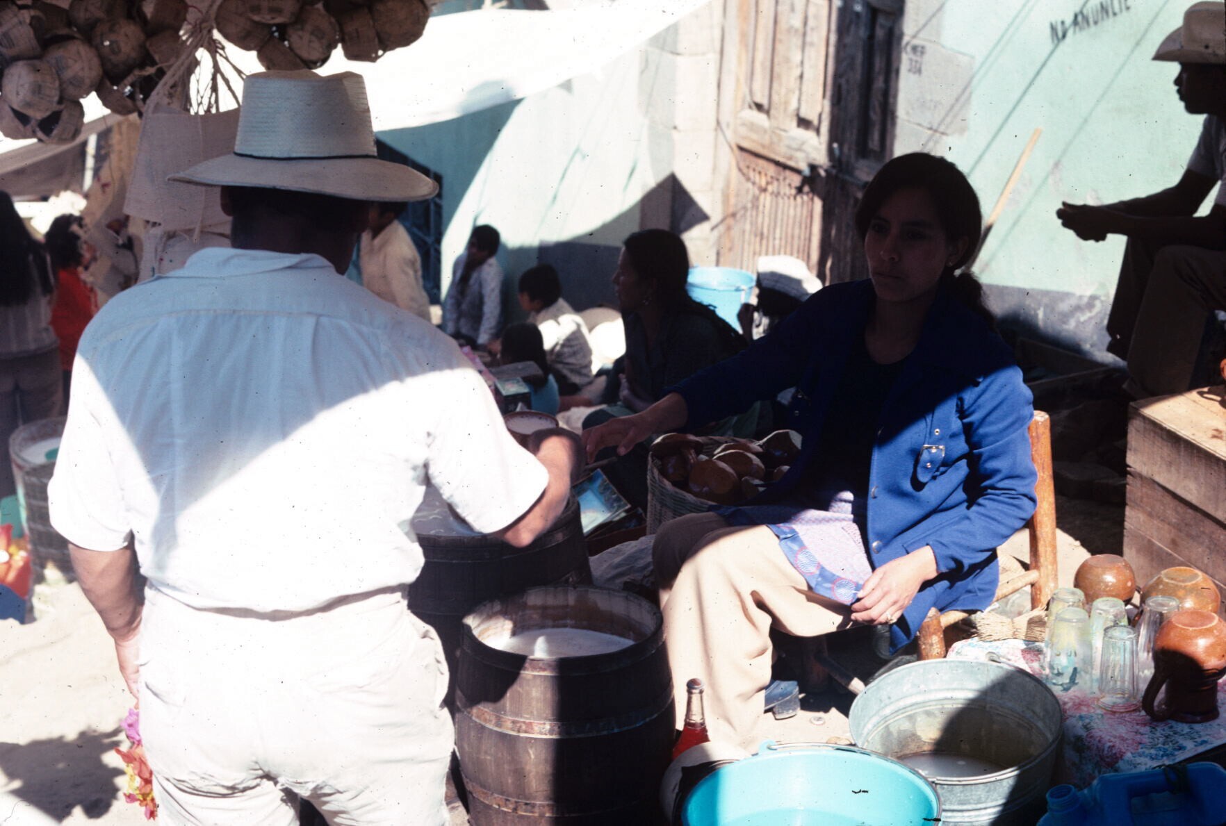 'ixtle'(agave)vezeltassen en pulqueverkoopster op markt