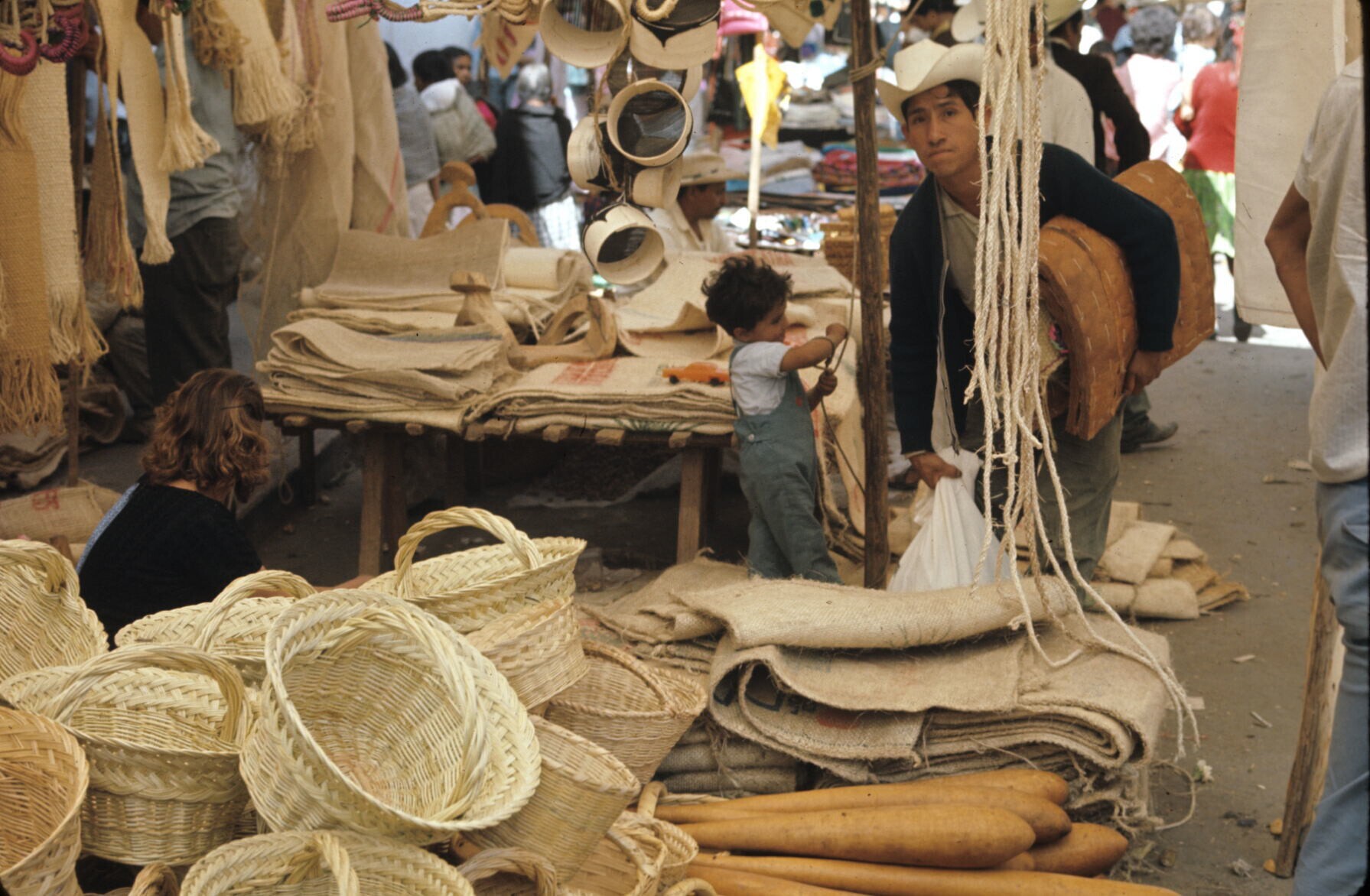 manden, matten en touwen op markt; "acocotes" (zuigk...