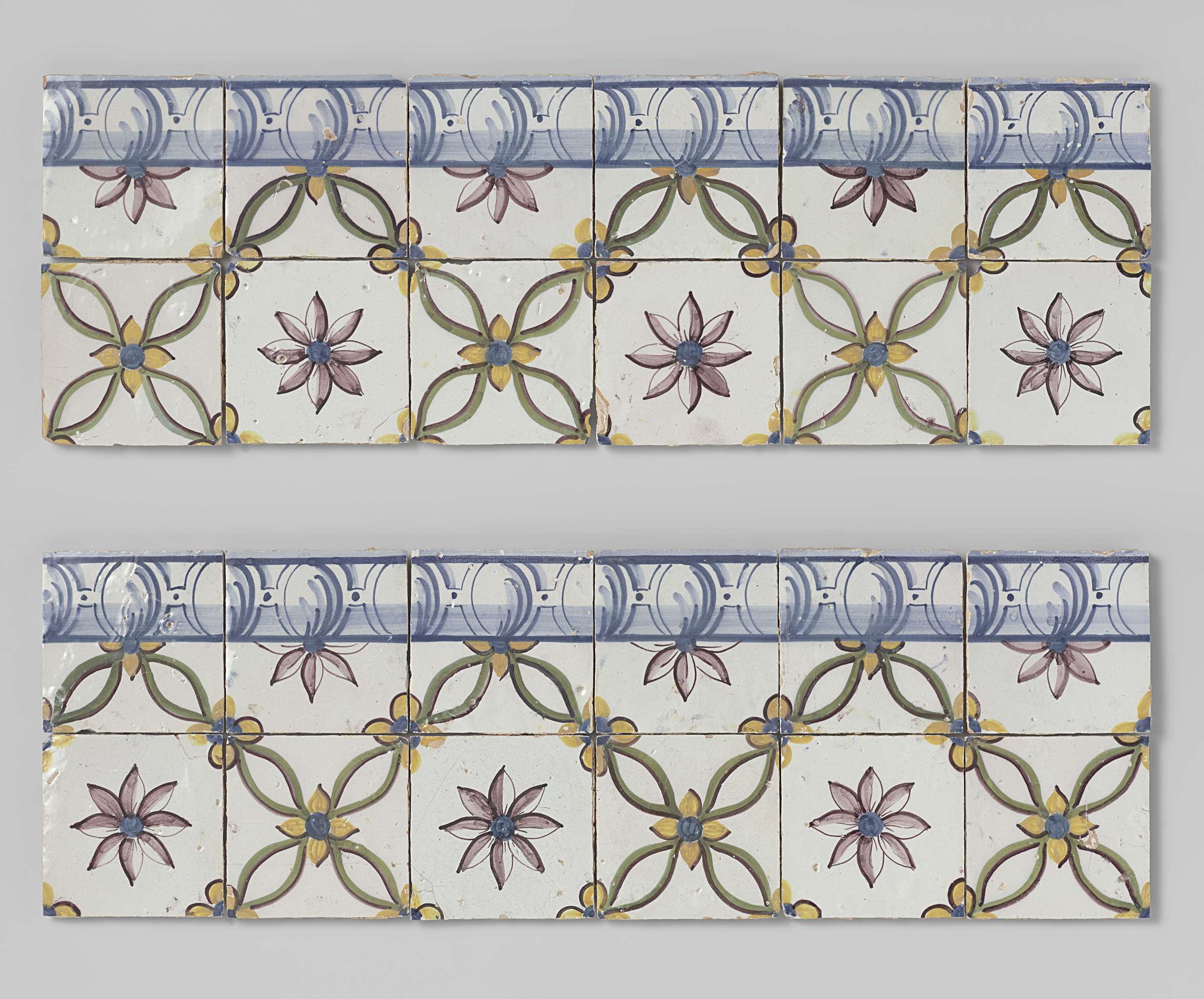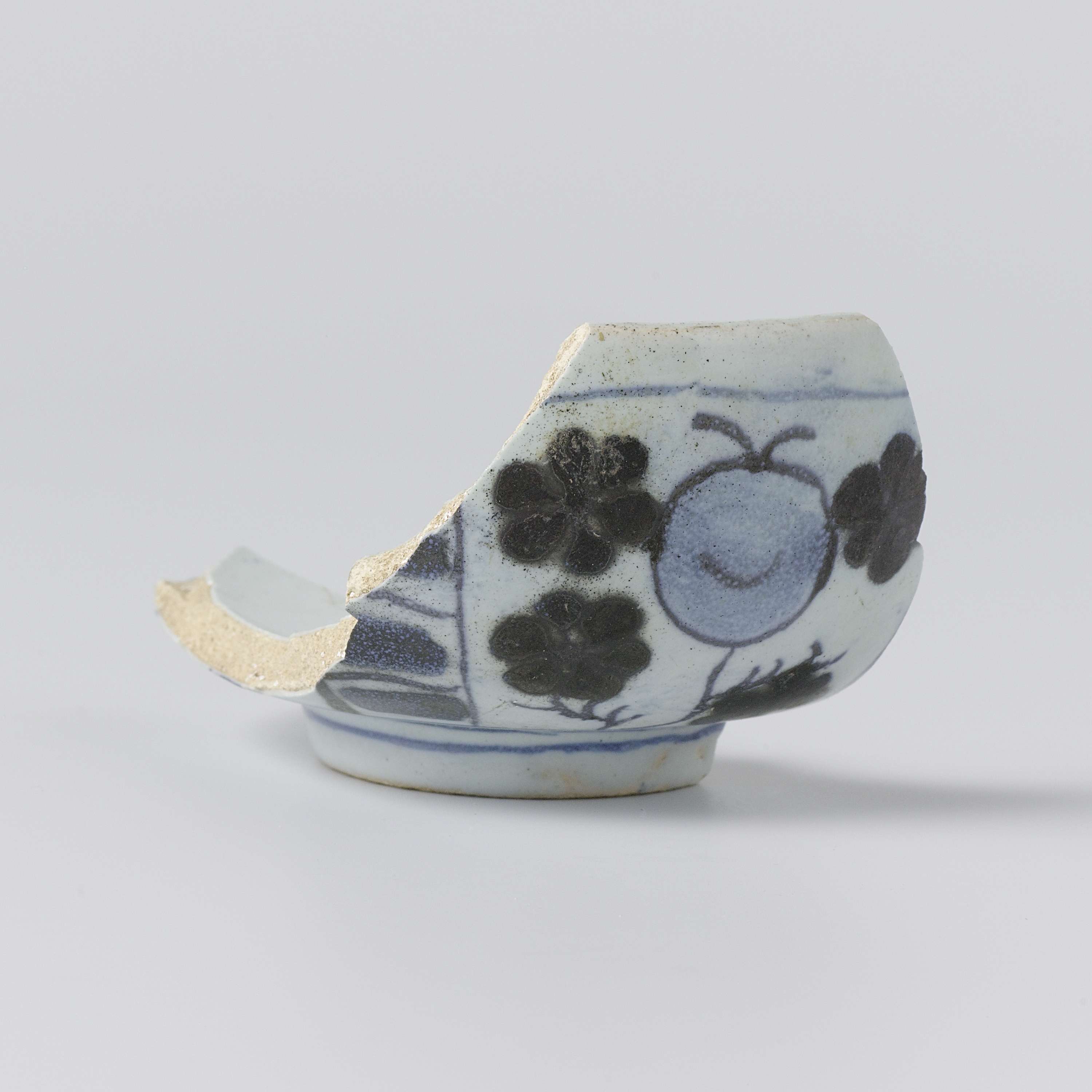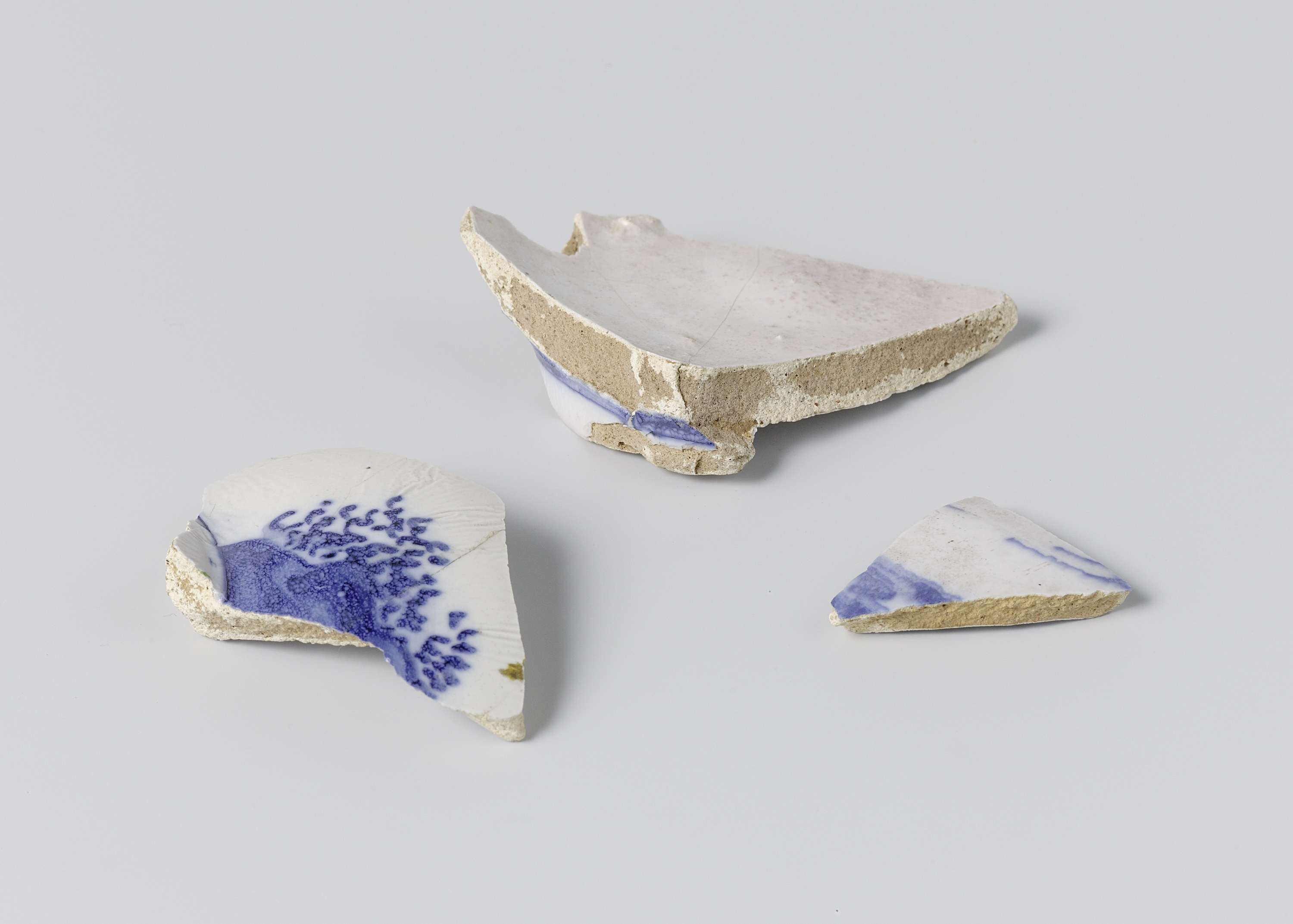 Fragment, drie stuks, van een in blauw beschilderde ...