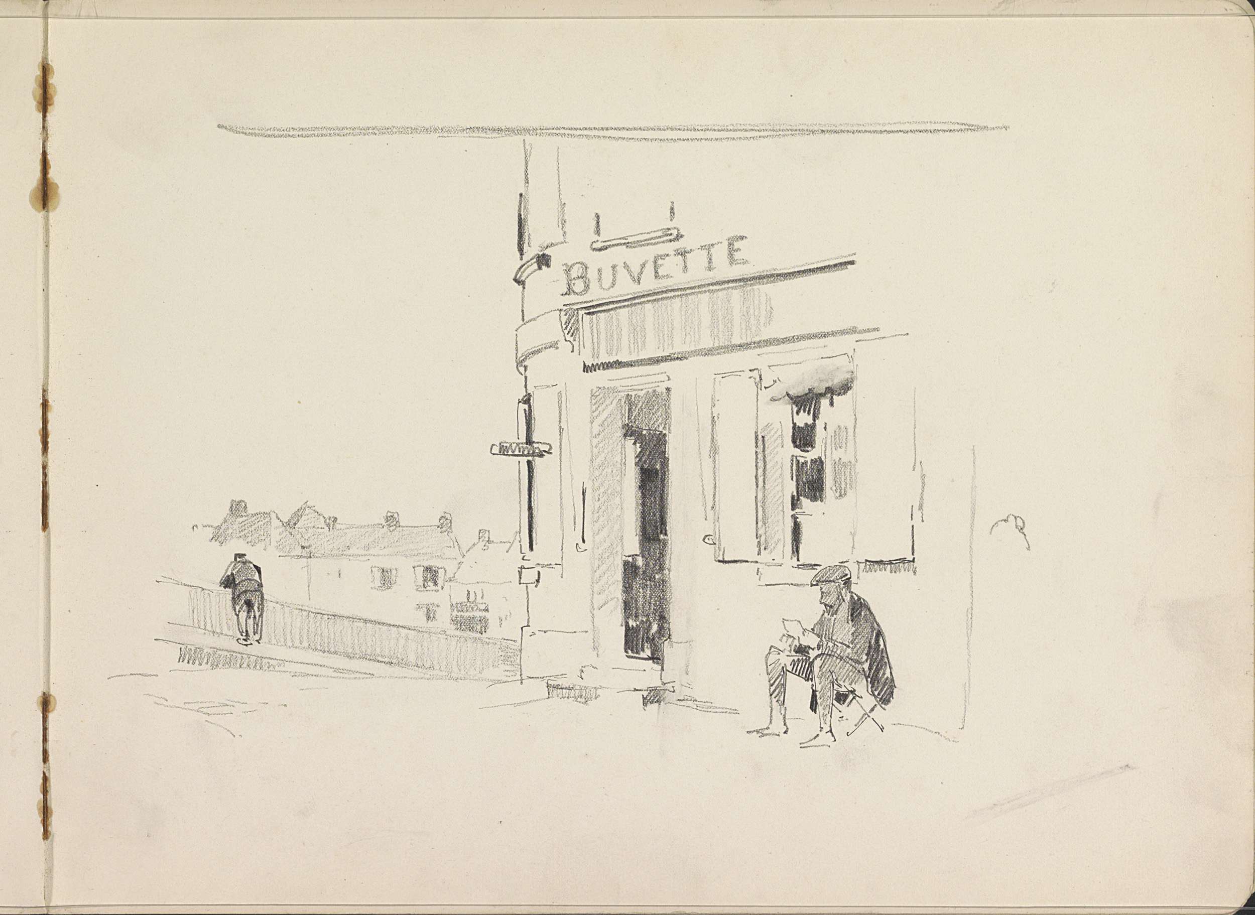 Lezende man op een kruk voor een kuursaal