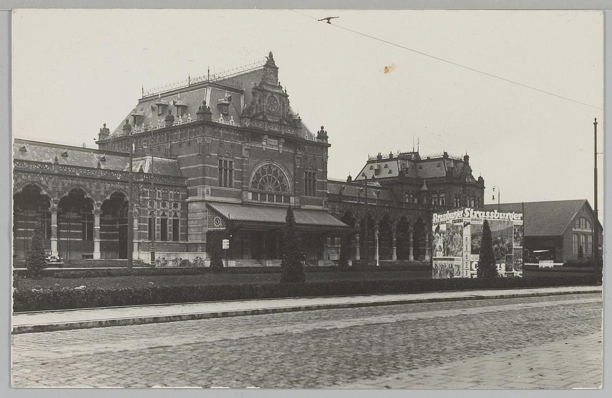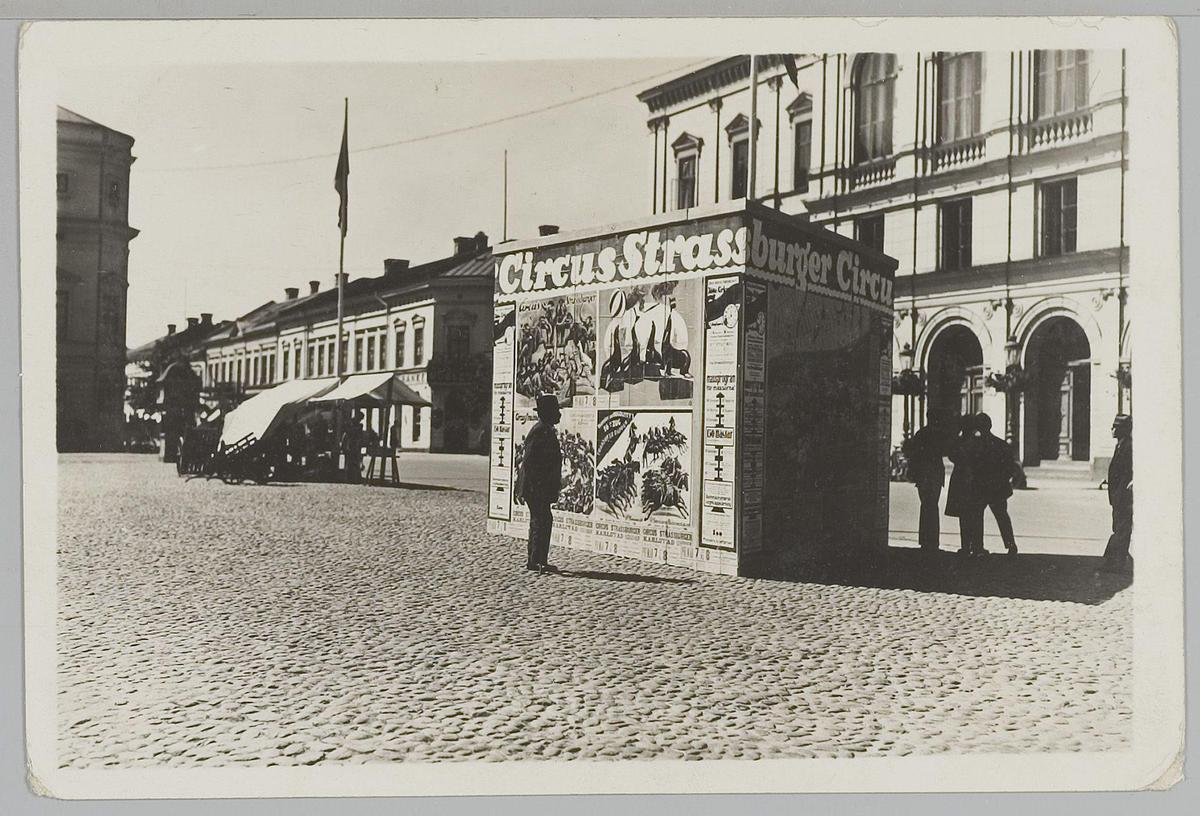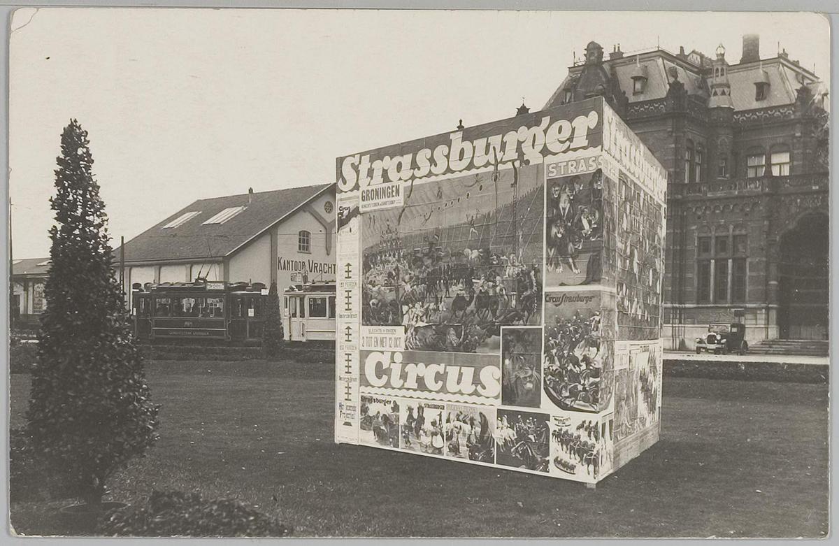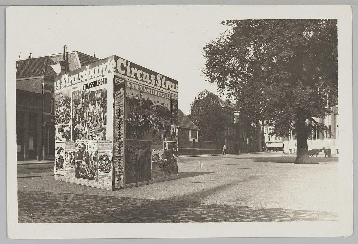 Straatbeeld met affiches van Circus Strassburger