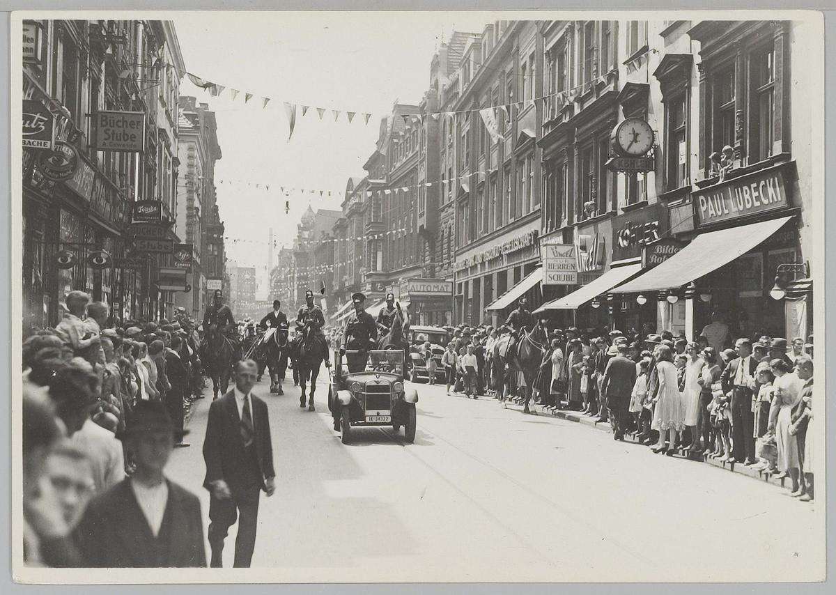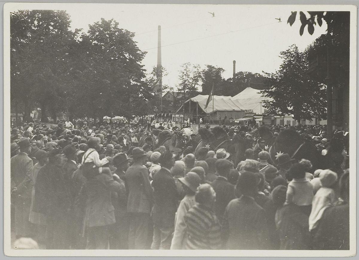 Mensenmassa bij optocht Circus Strassburger, 1928. L...