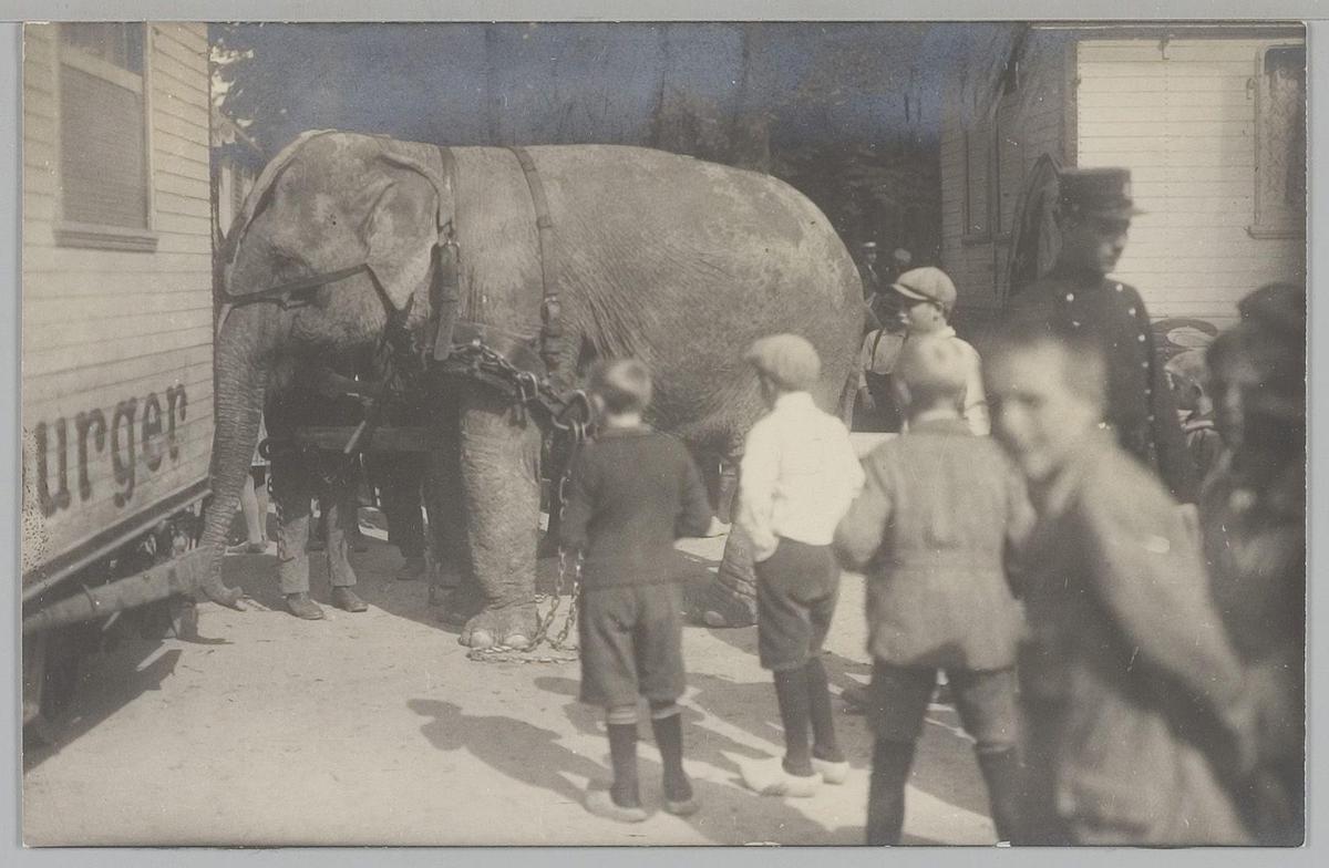 Jongens kijken naar olifant bij de circuswagens van ...