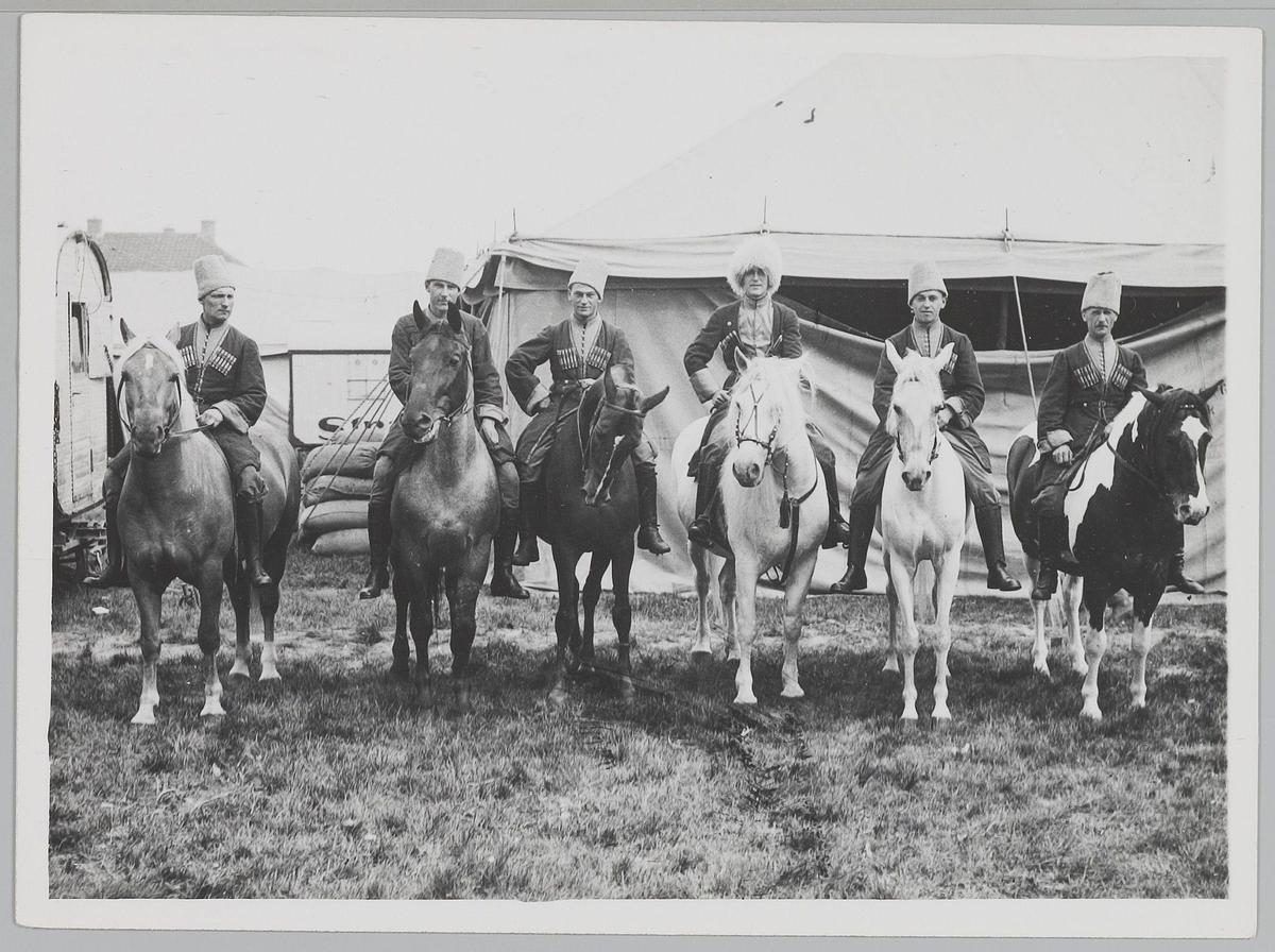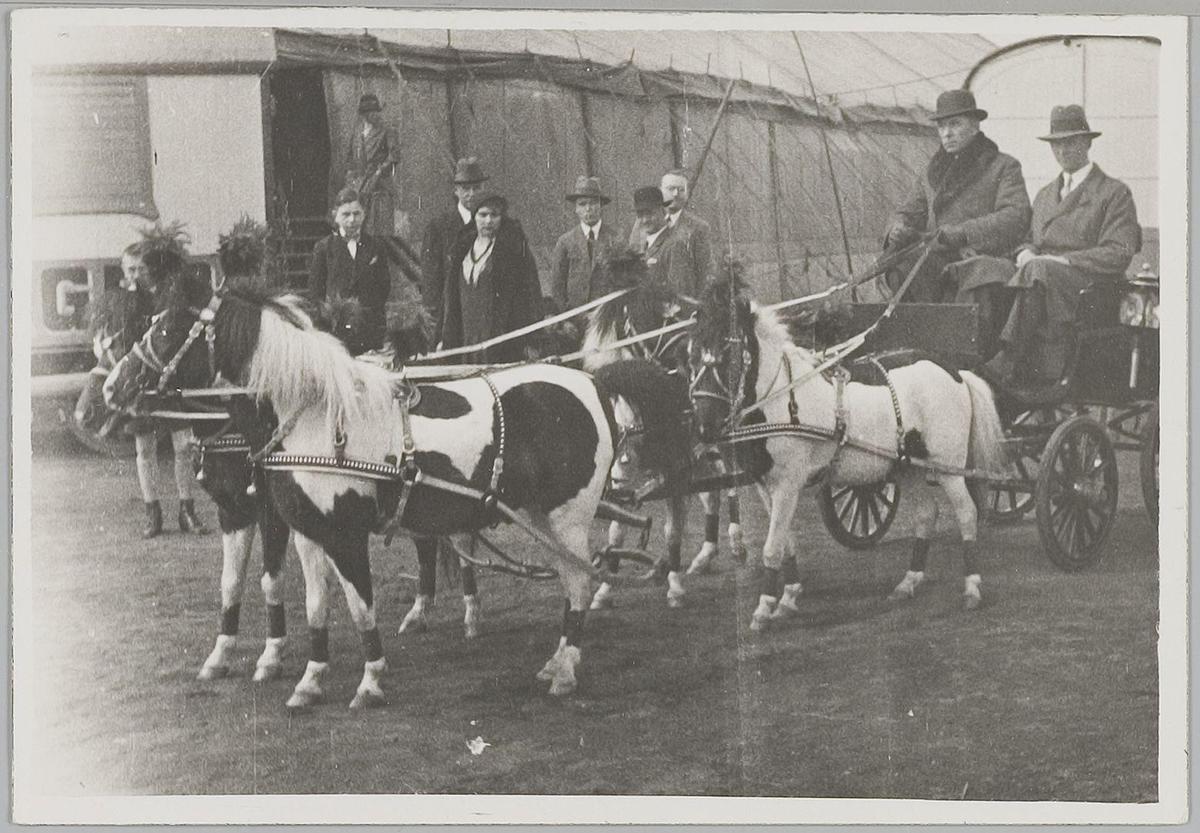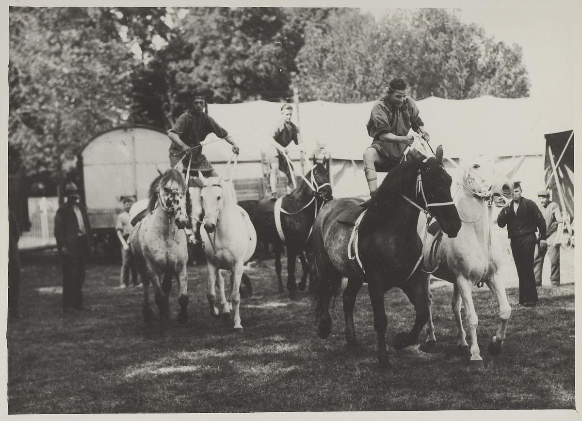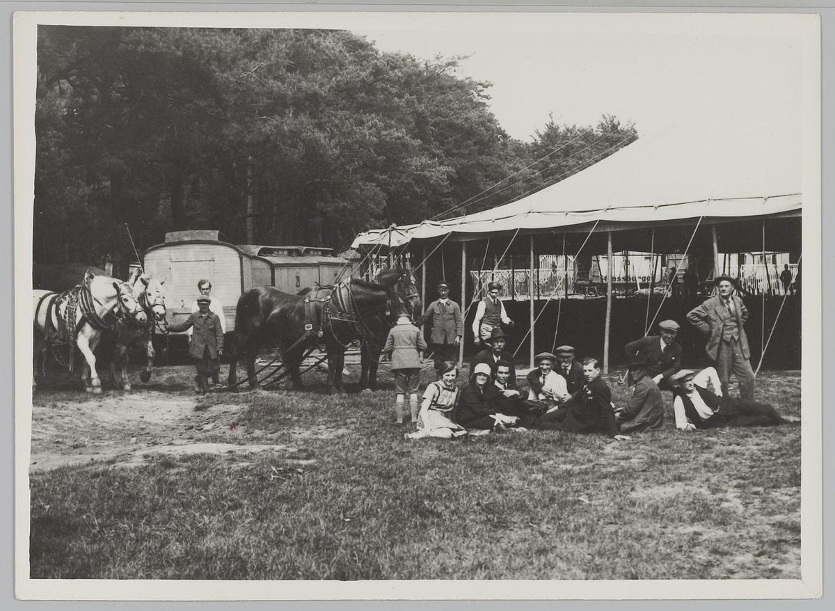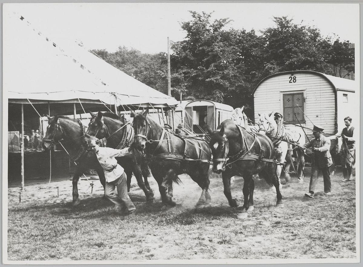 Dresseurs met paarden voor de tent van Circus Strass...
