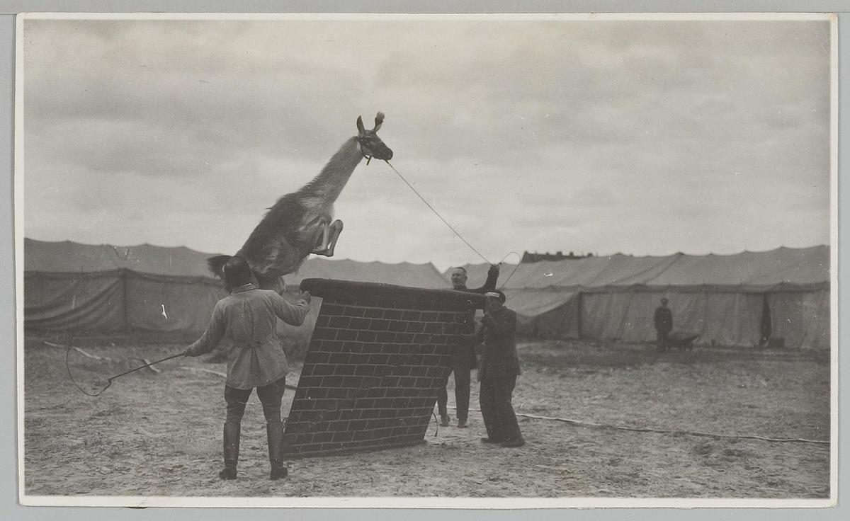 Oefening met lama die over hindernis springt, Circus...