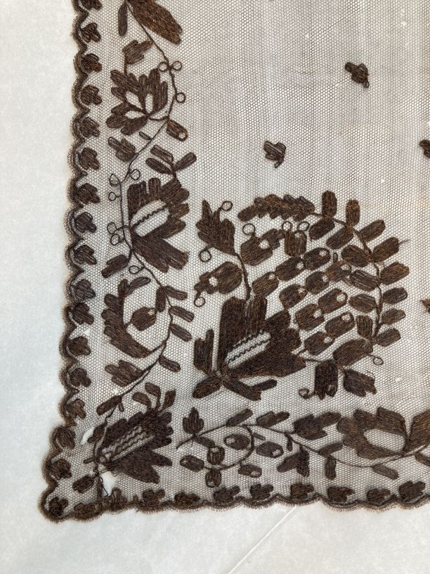 Zwarte tulen fichu-kraag, florale motieven getamboer...