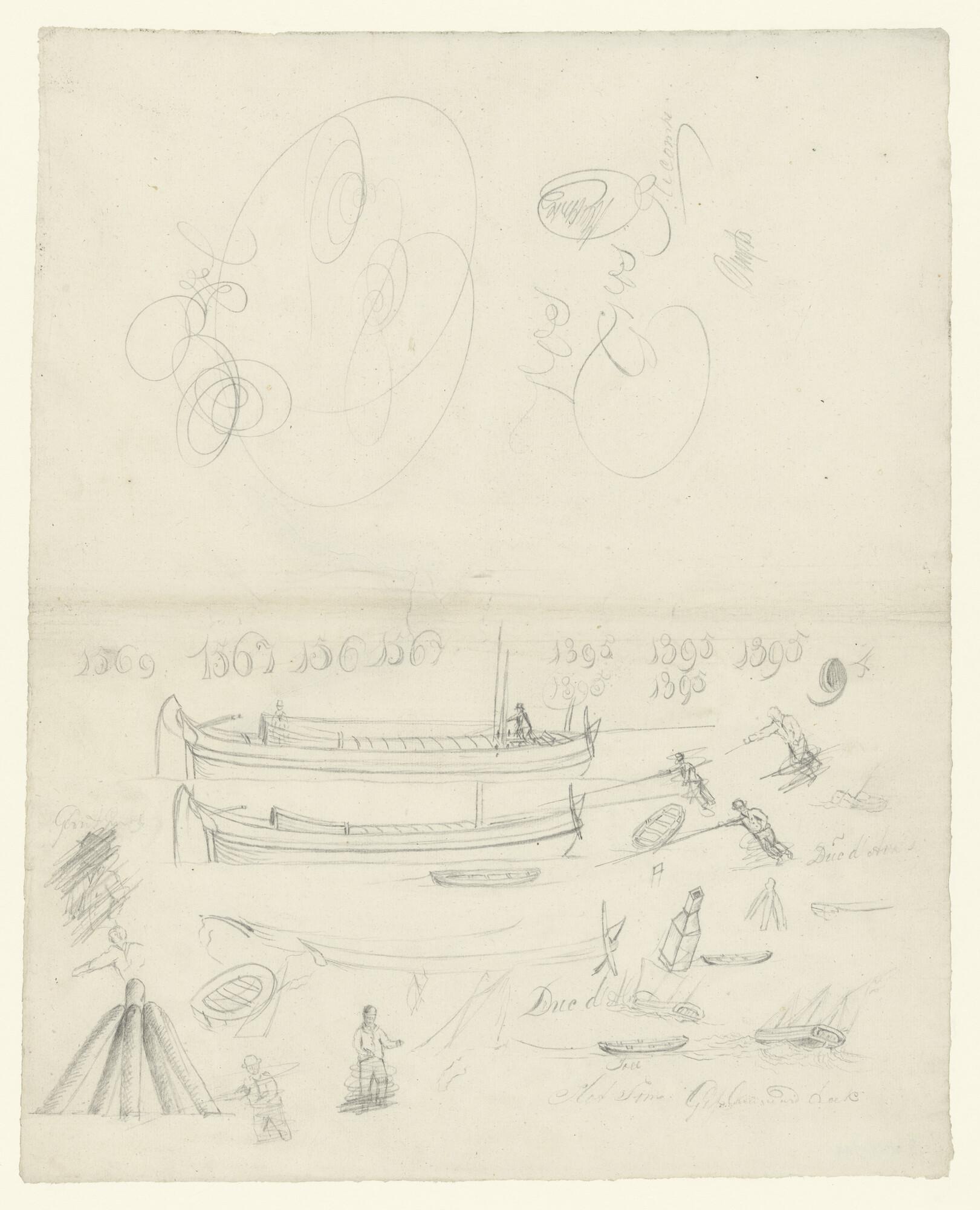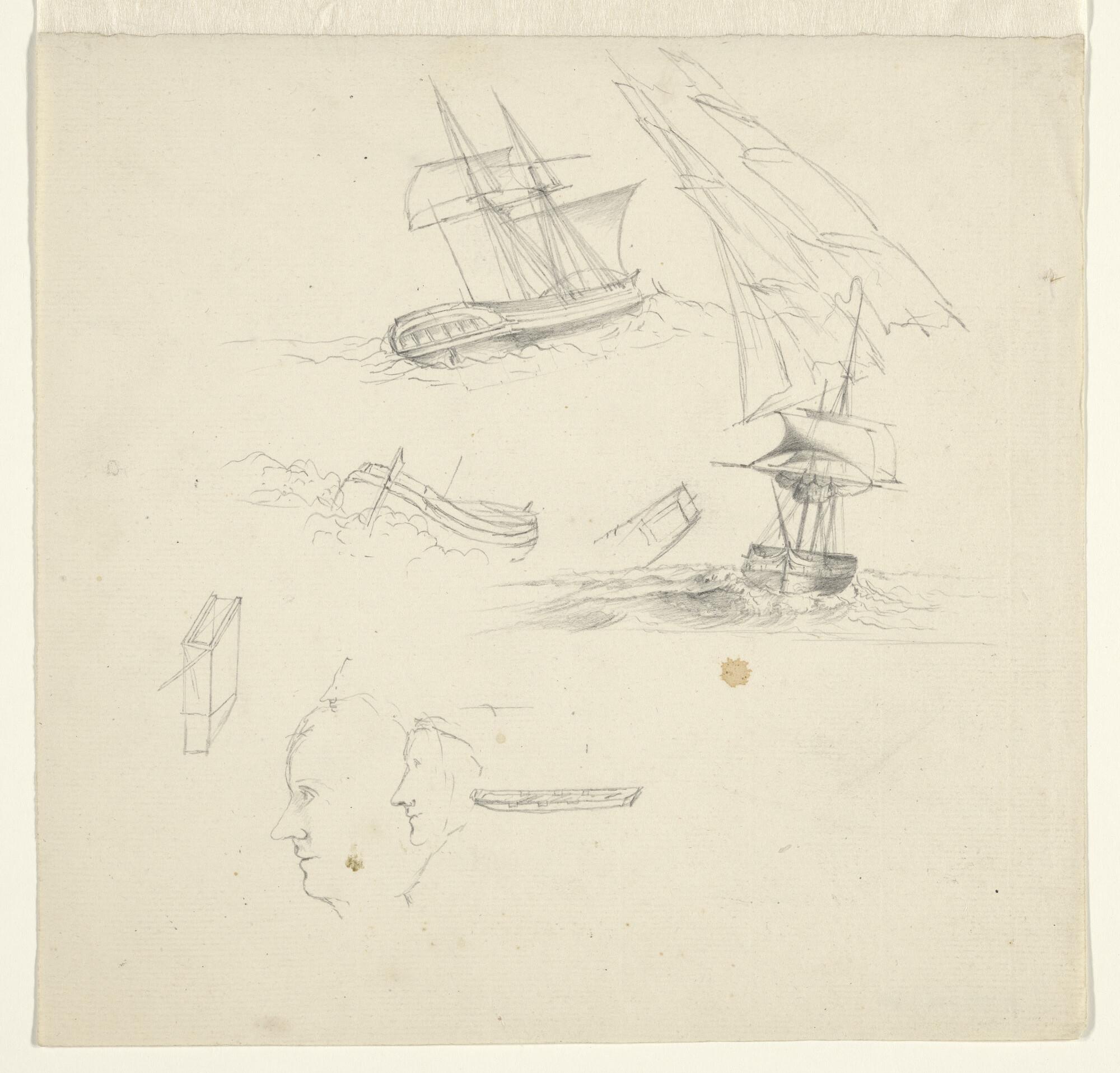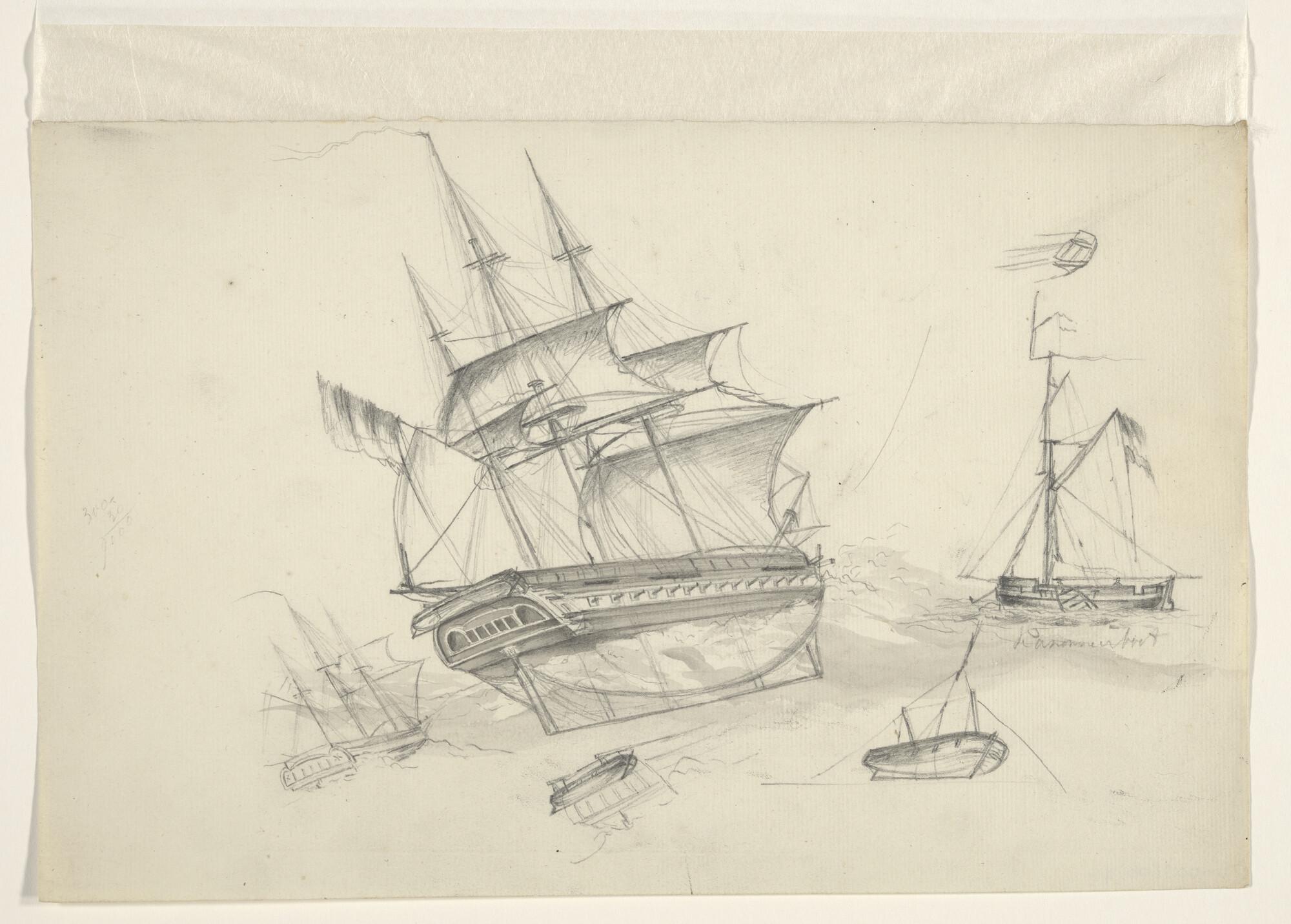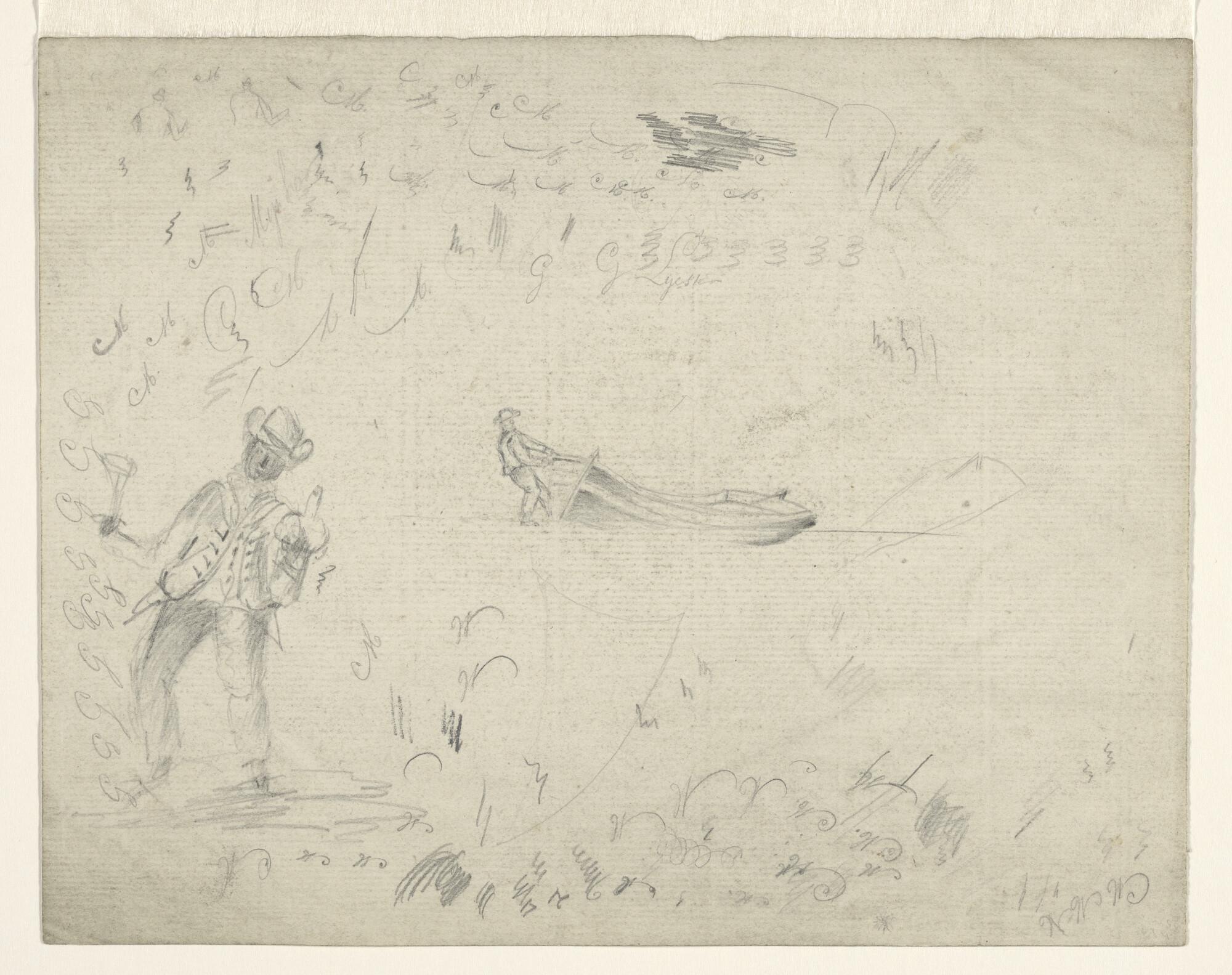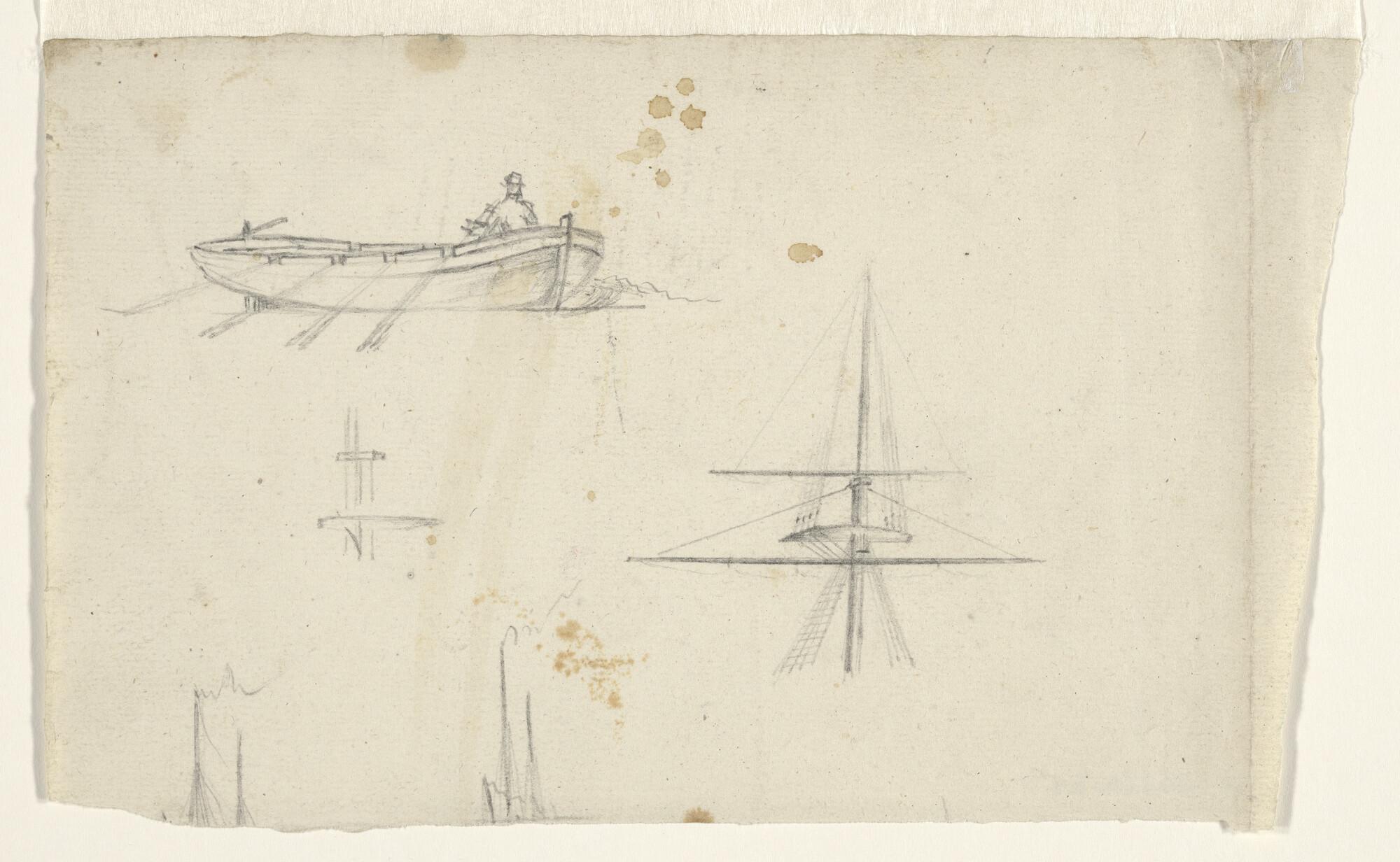 Schetsblad met roei- en zeilschepen en een soldaat m...
