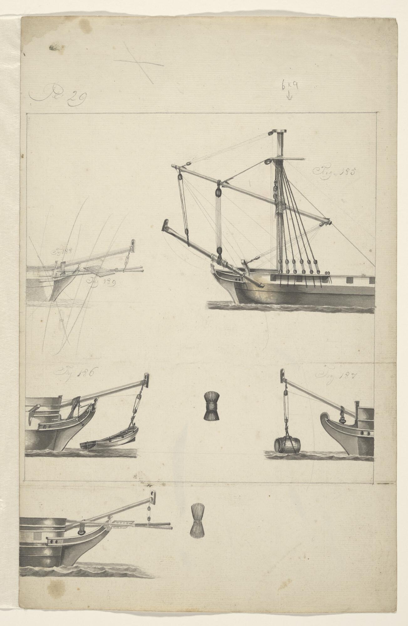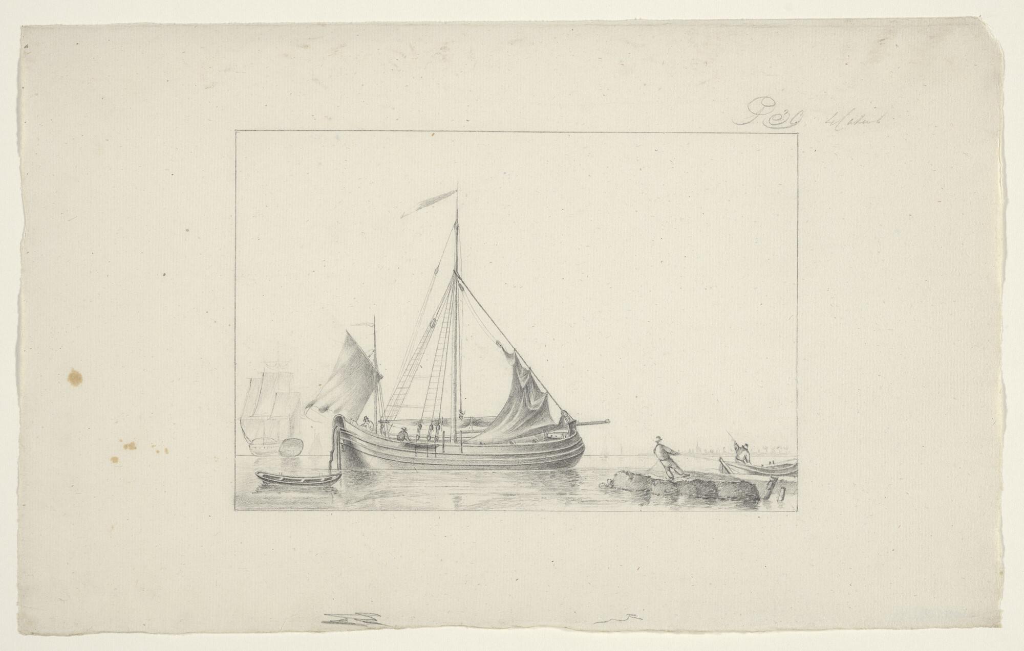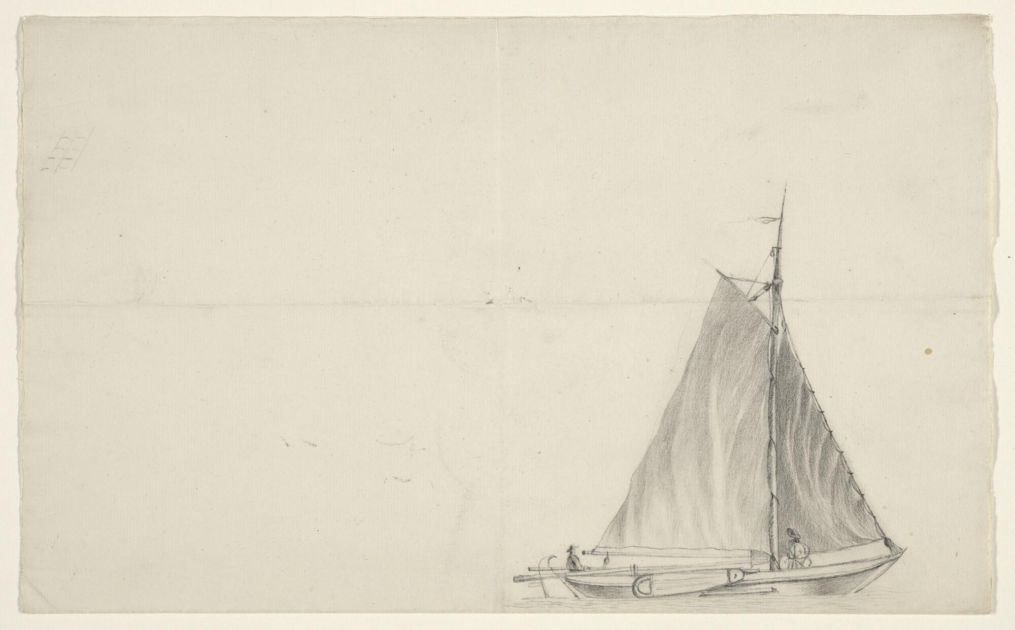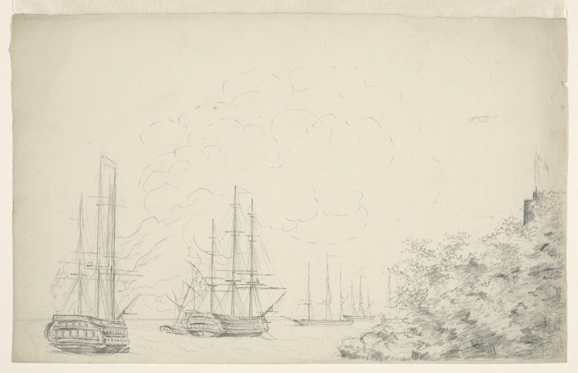 Schetsblad met roei- en zeilschepen en een soldaat m...