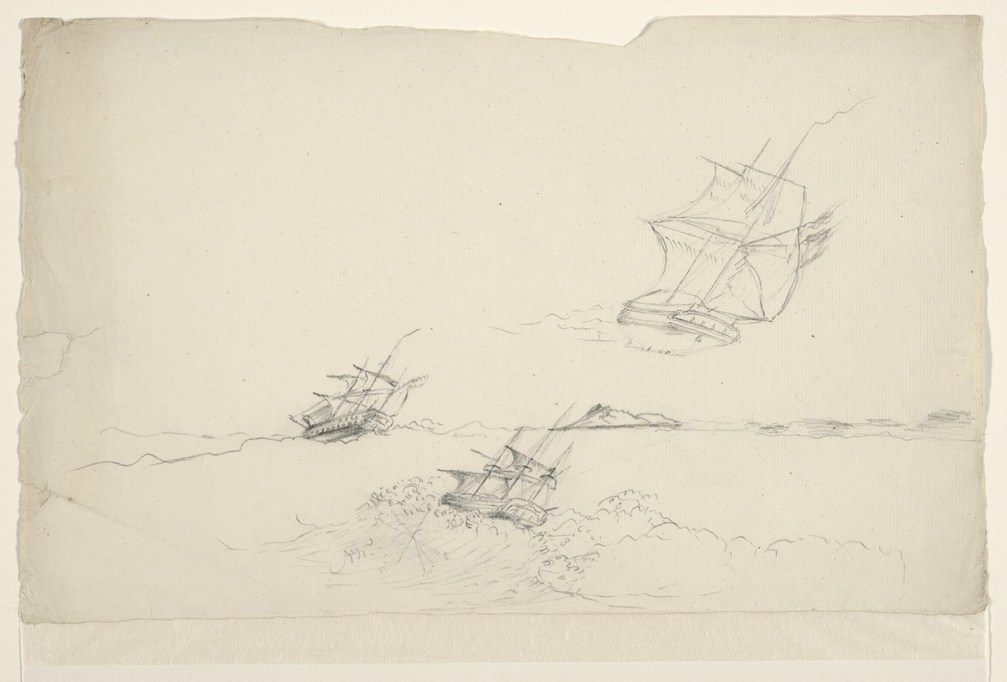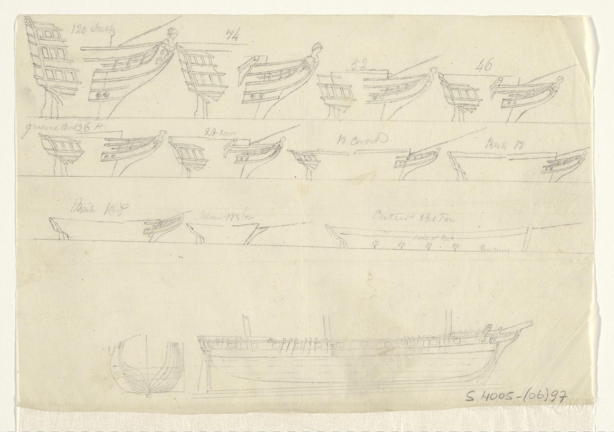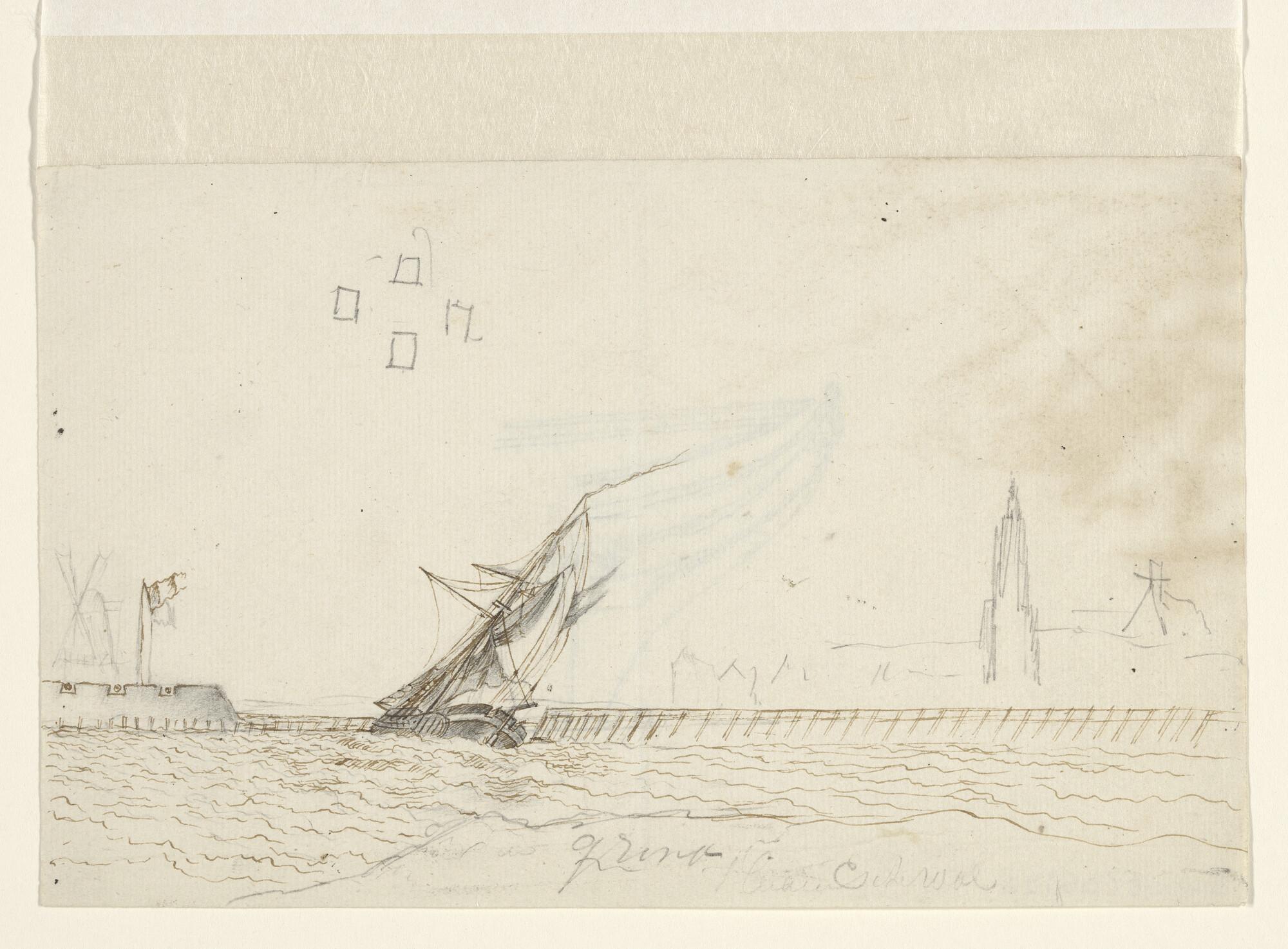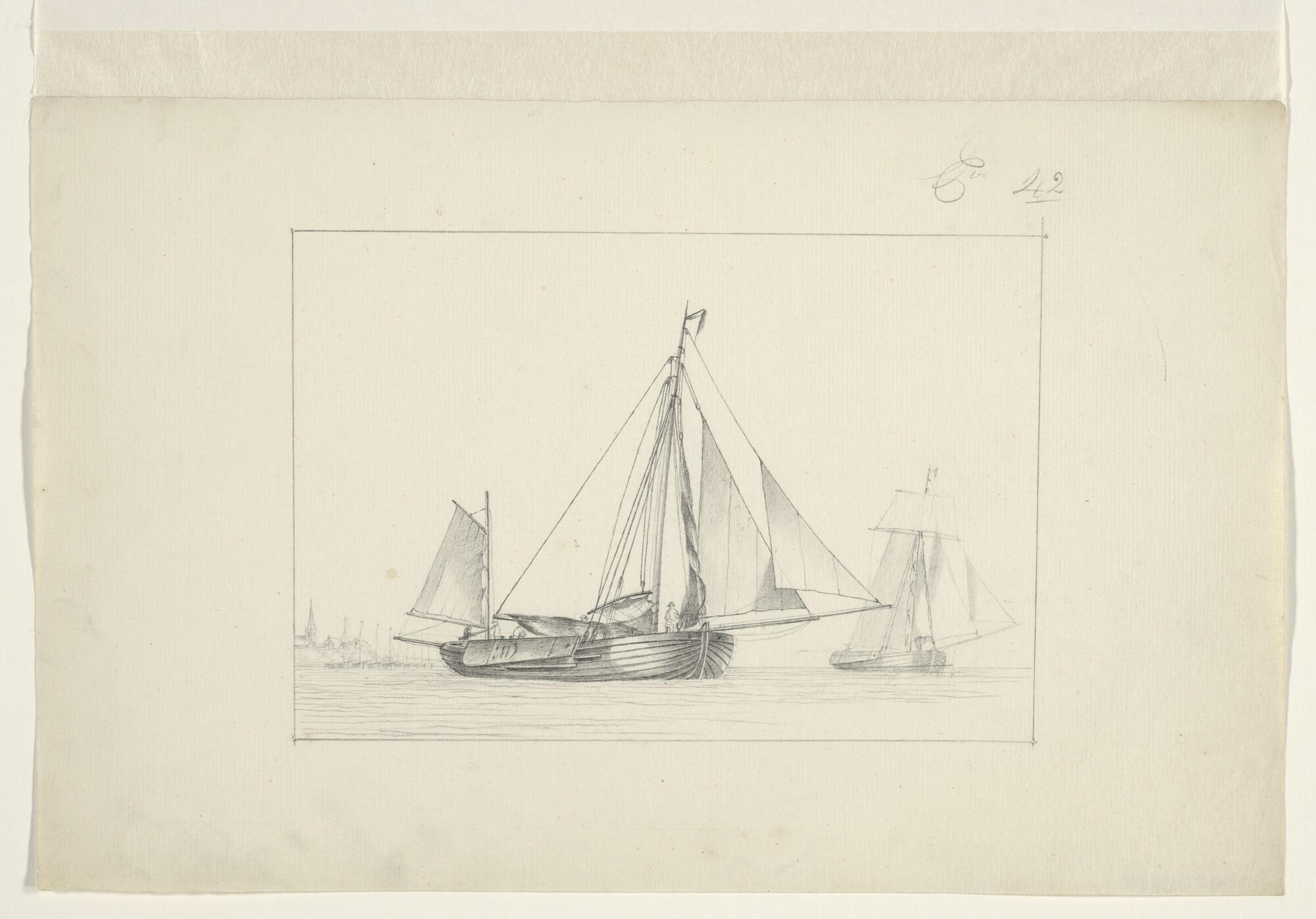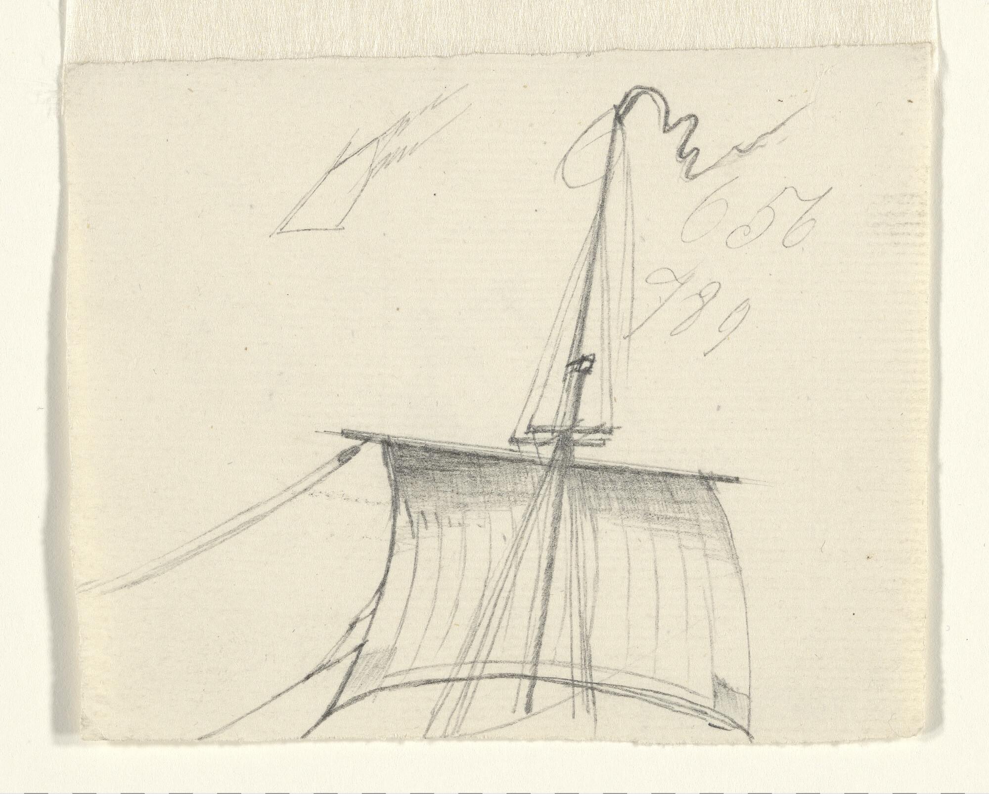 Schetsblad met roei- en zeilschepen en een soldaat m...