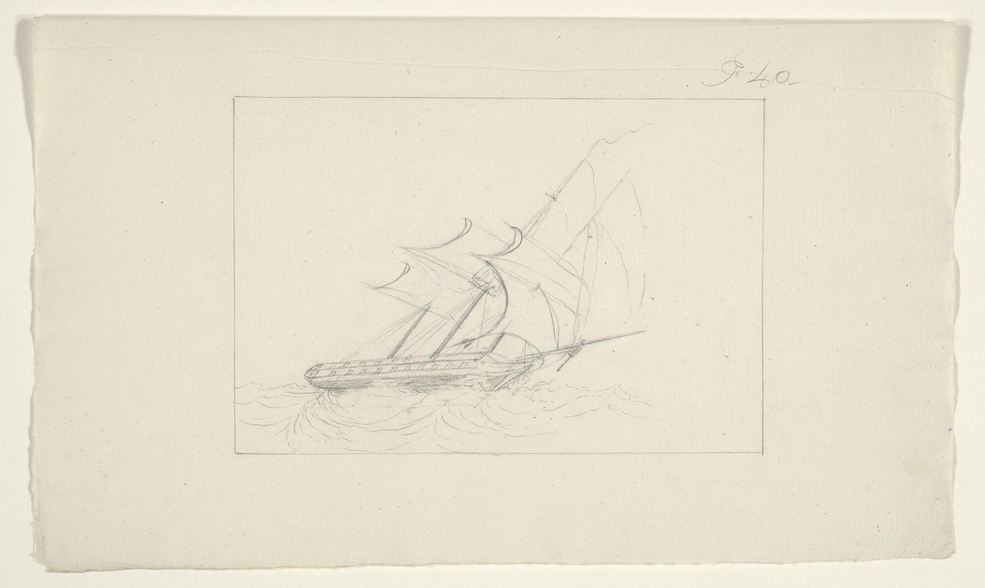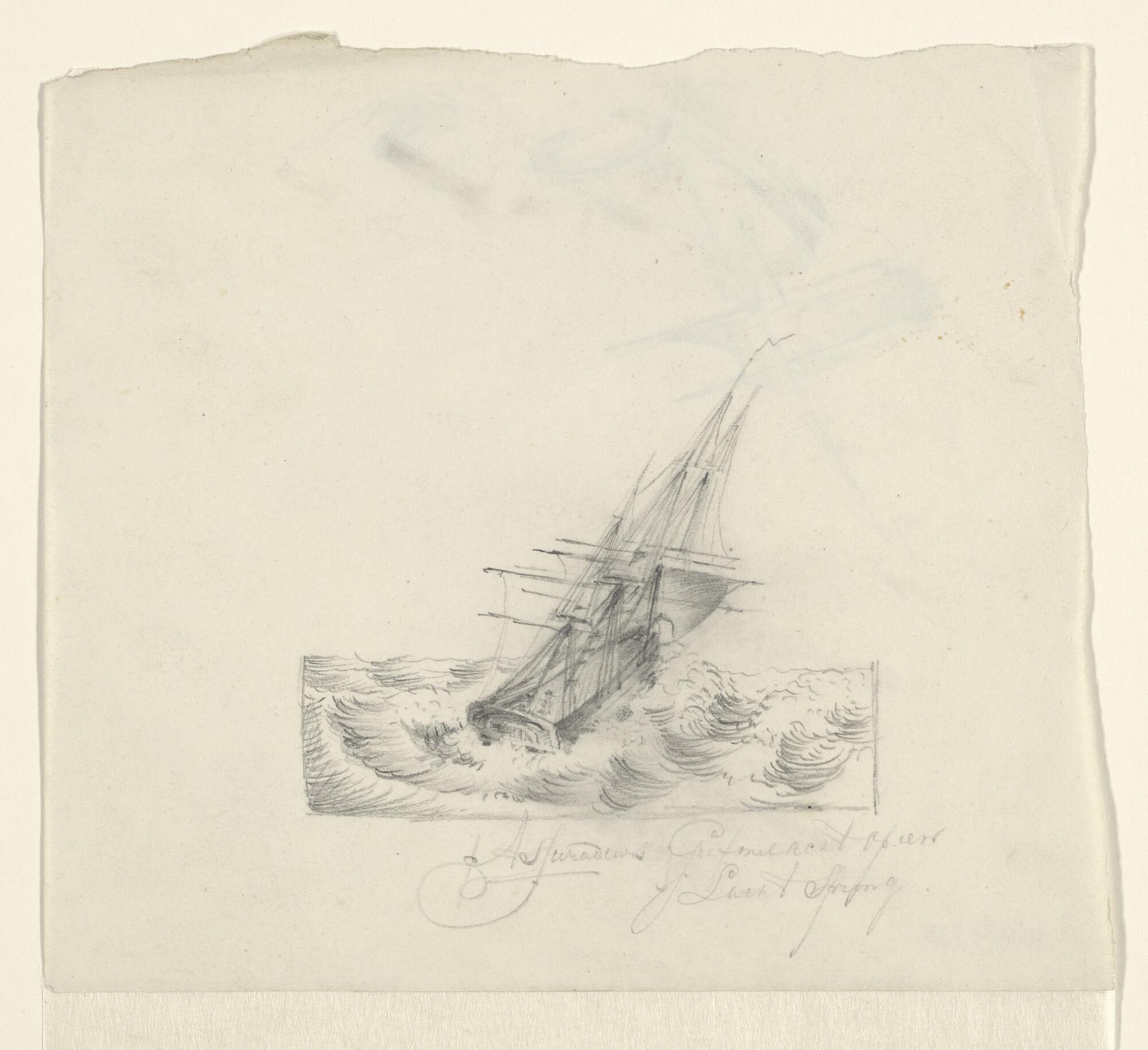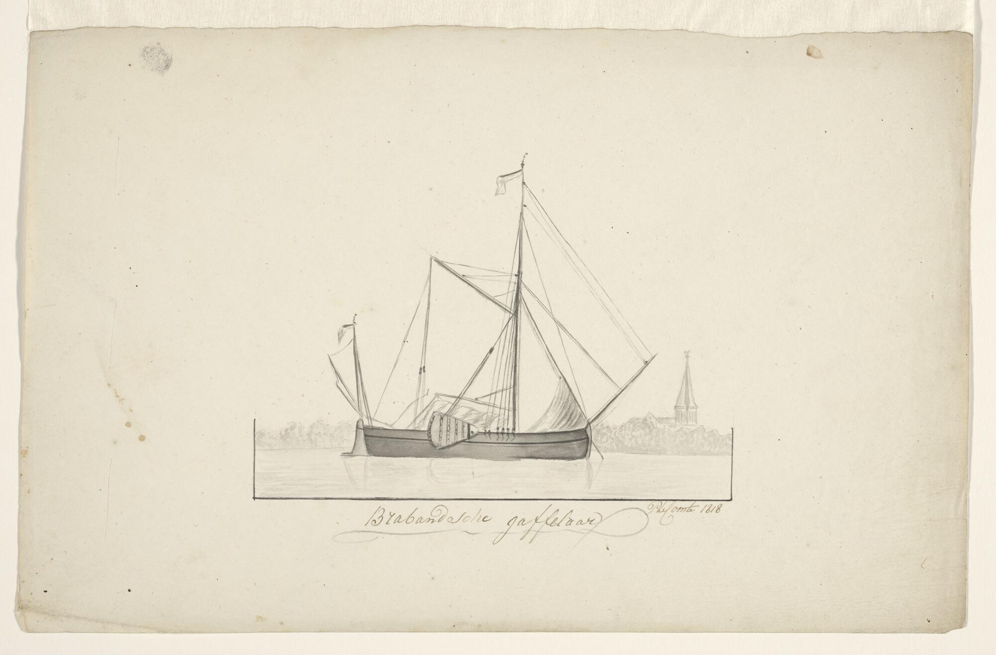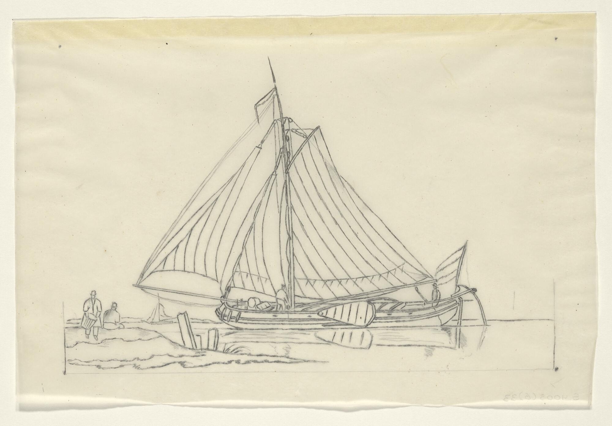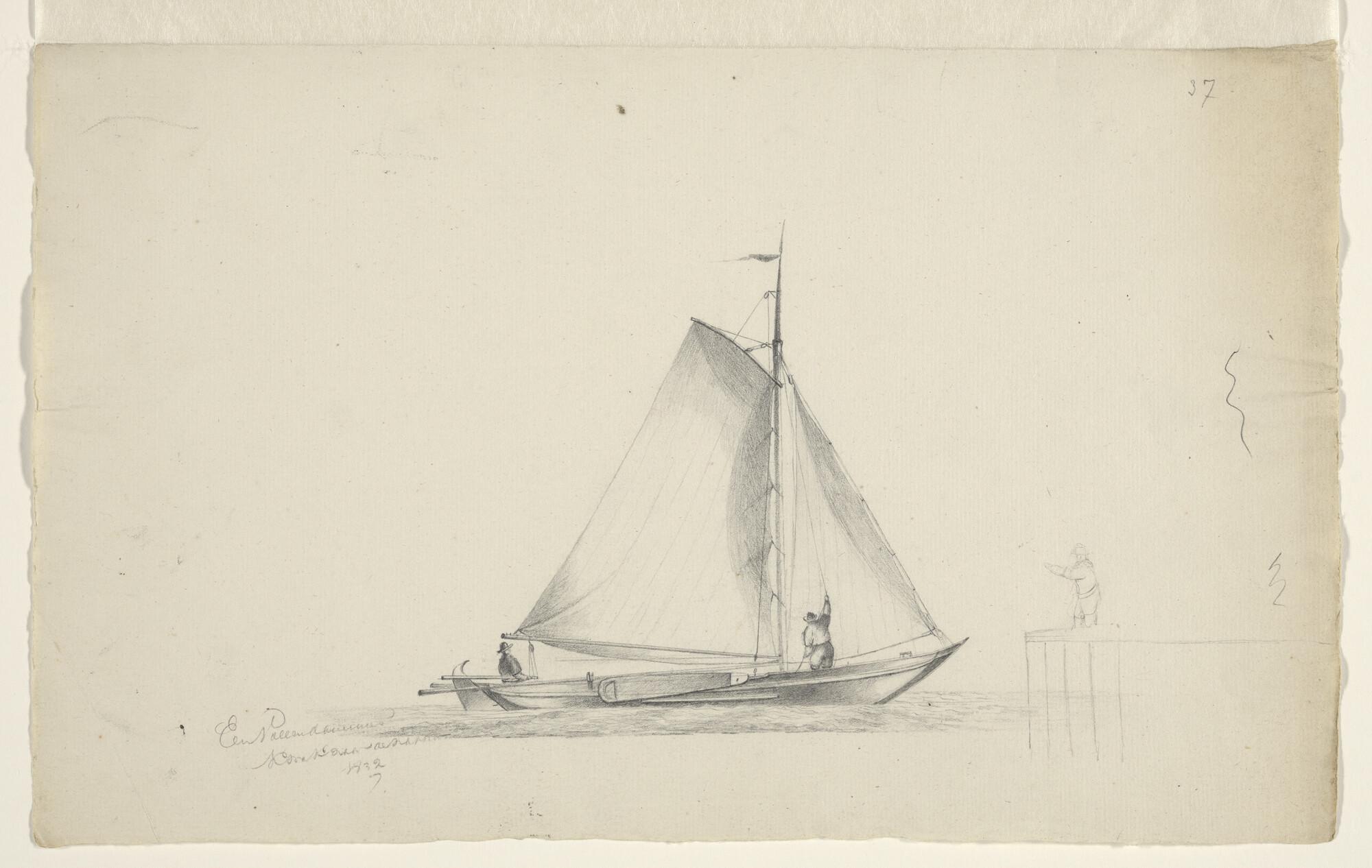Schetsblad met roei- en zeilschepen en een soldaat m...