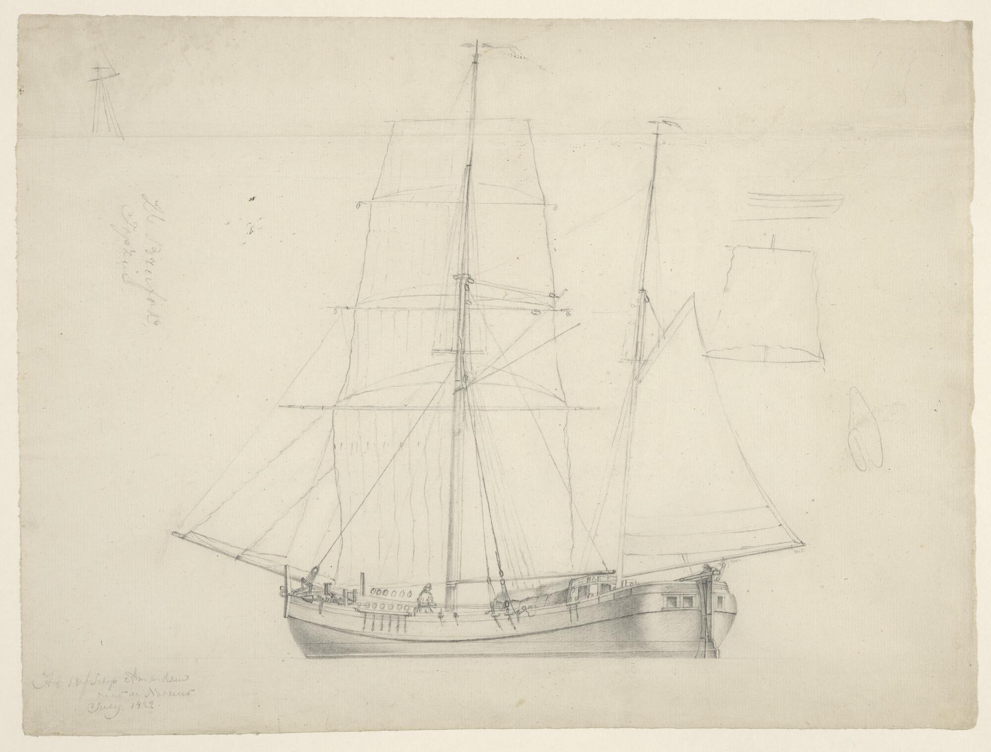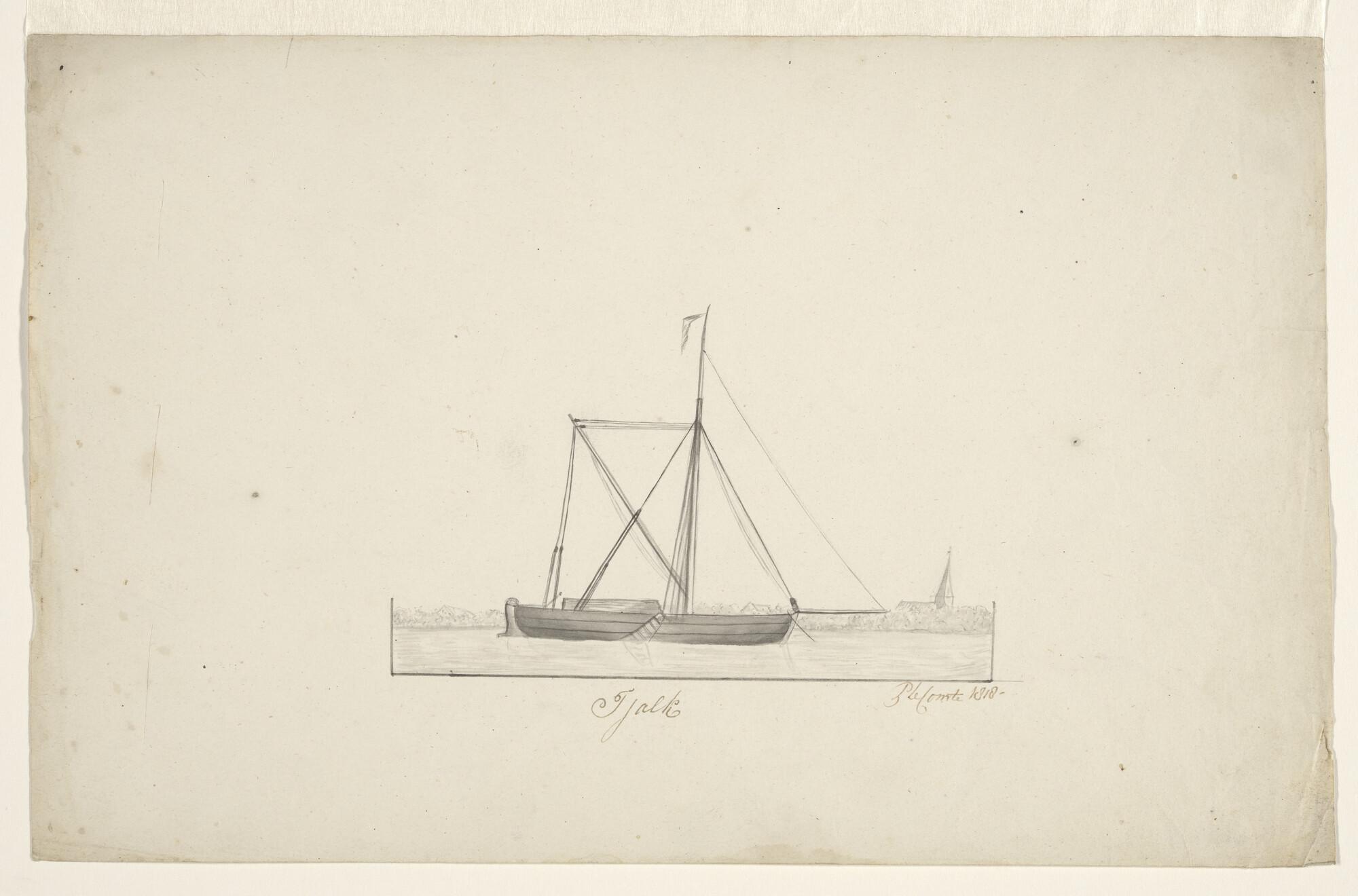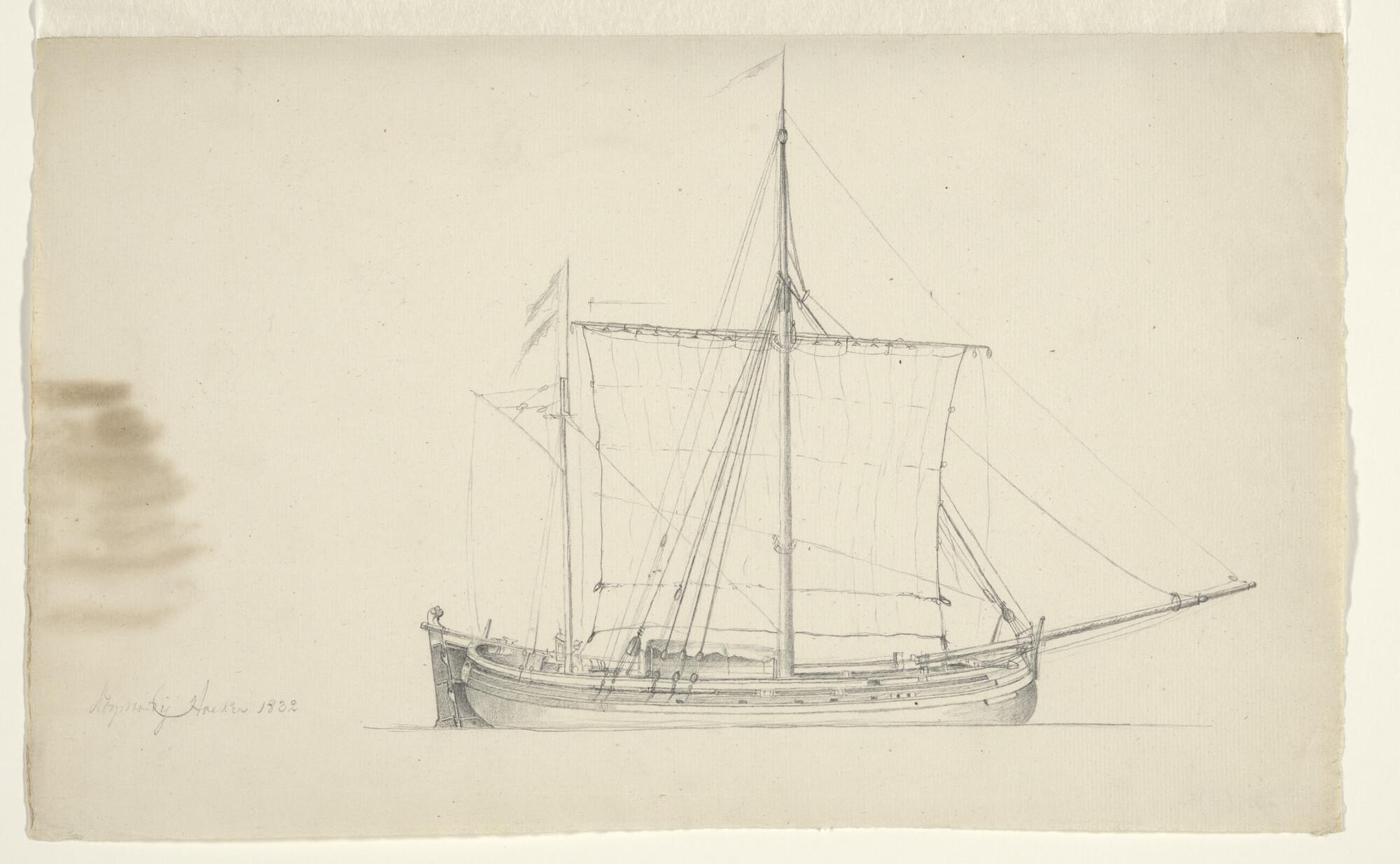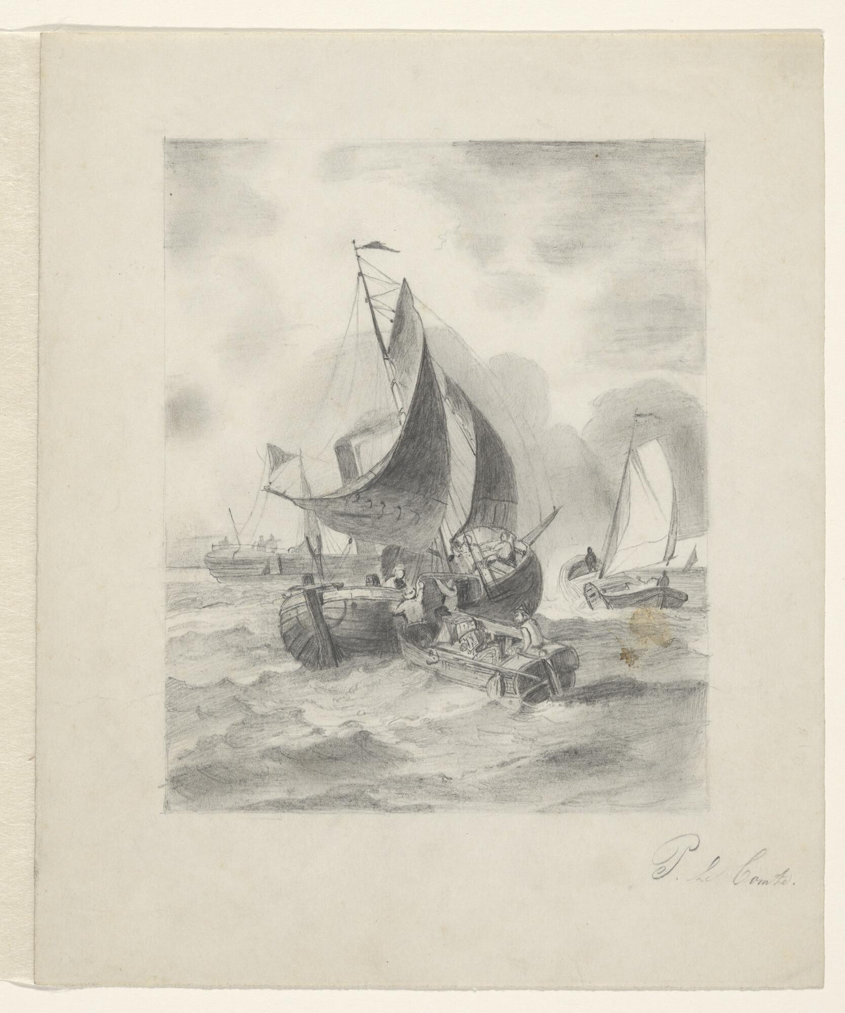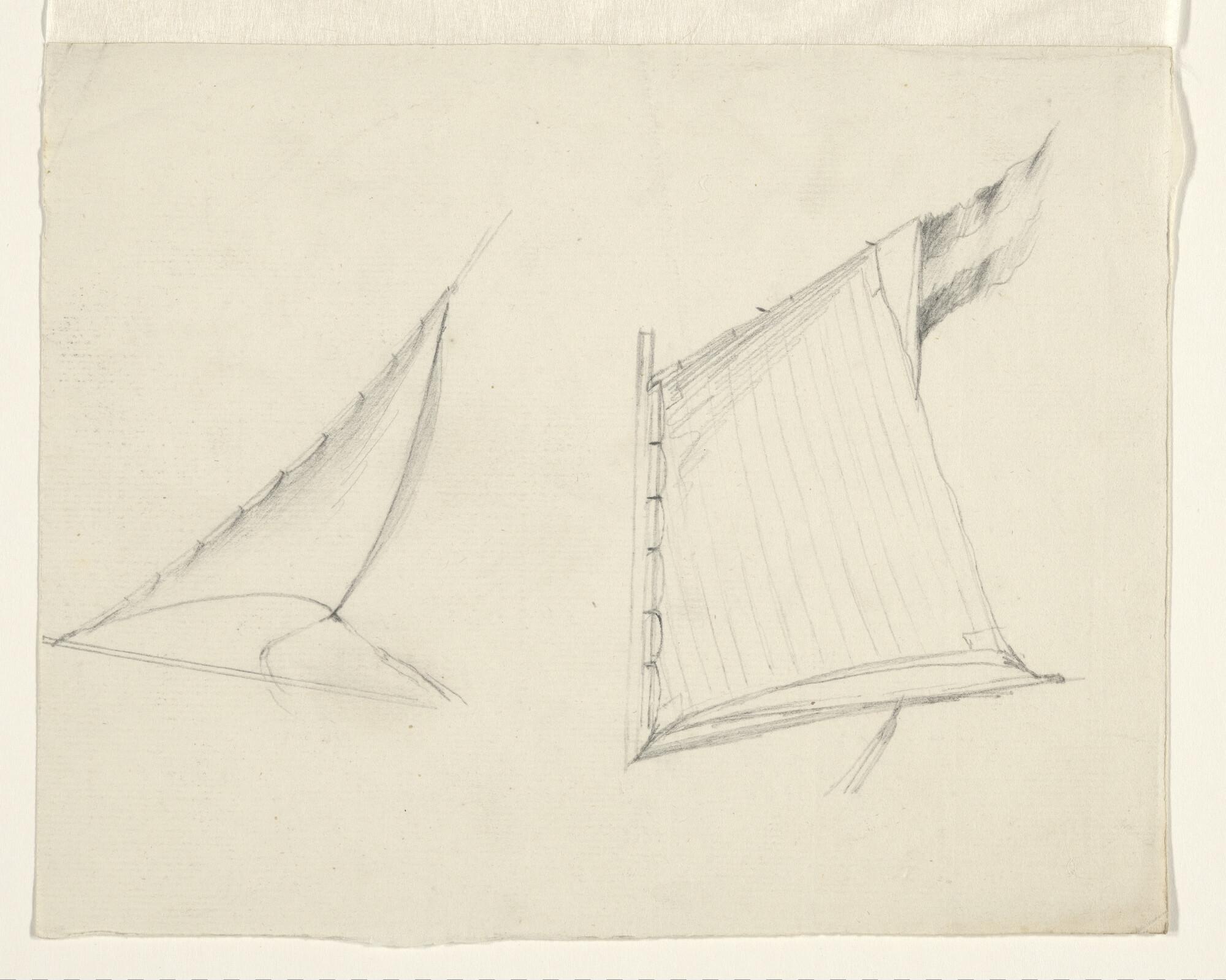 Schetsblad met roei- en zeilschepen en een soldaat m...