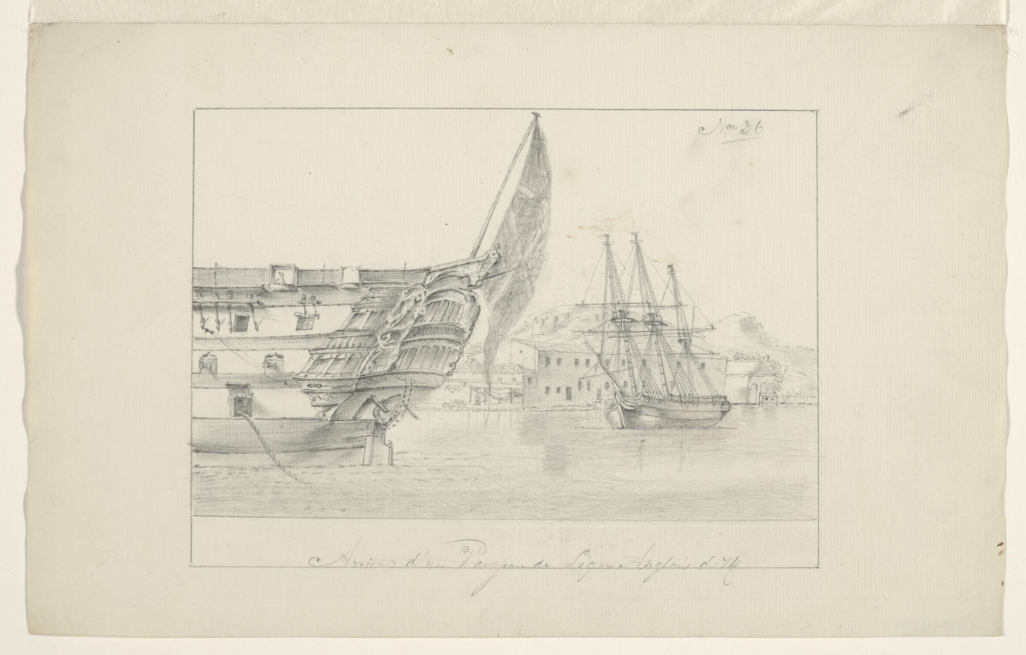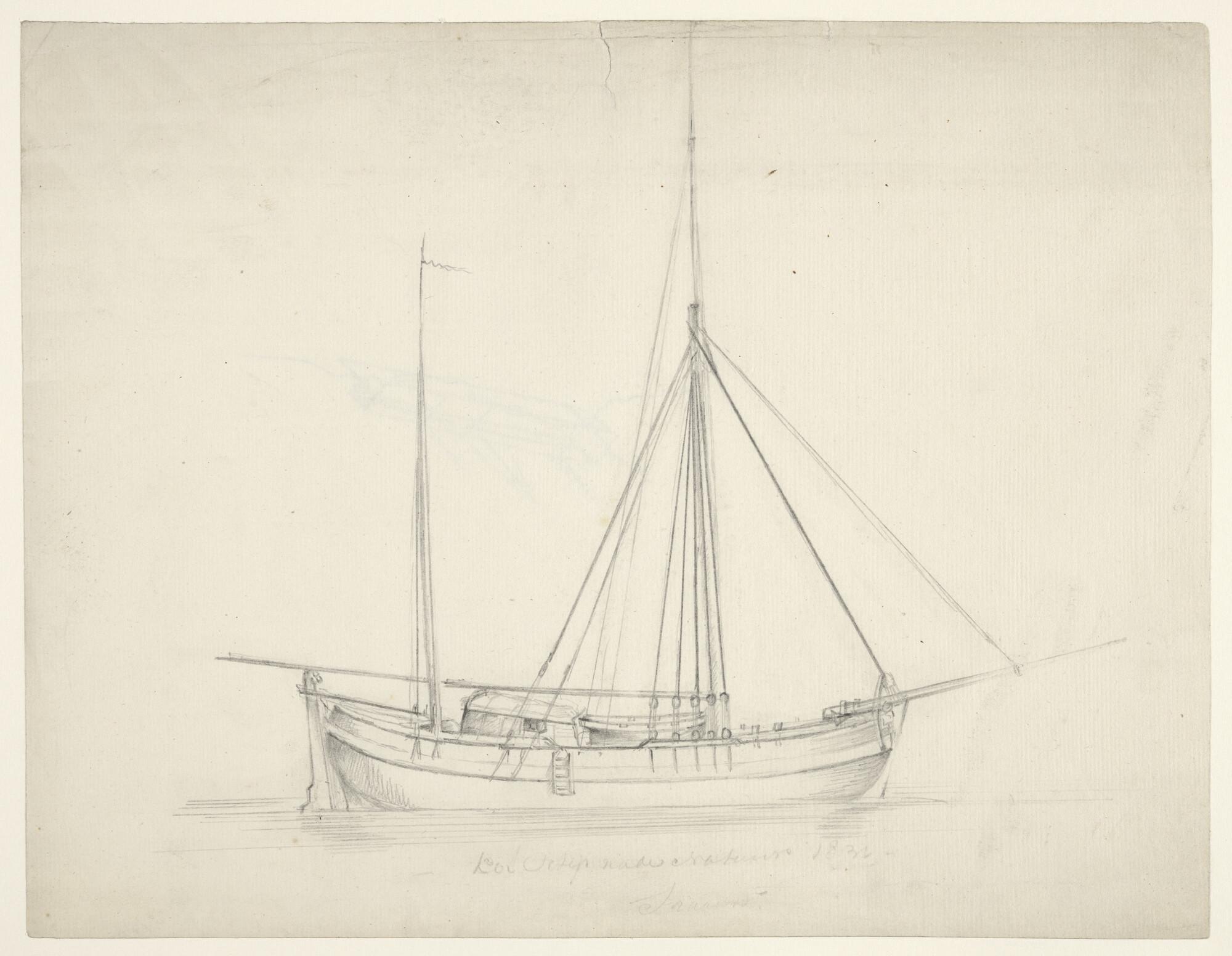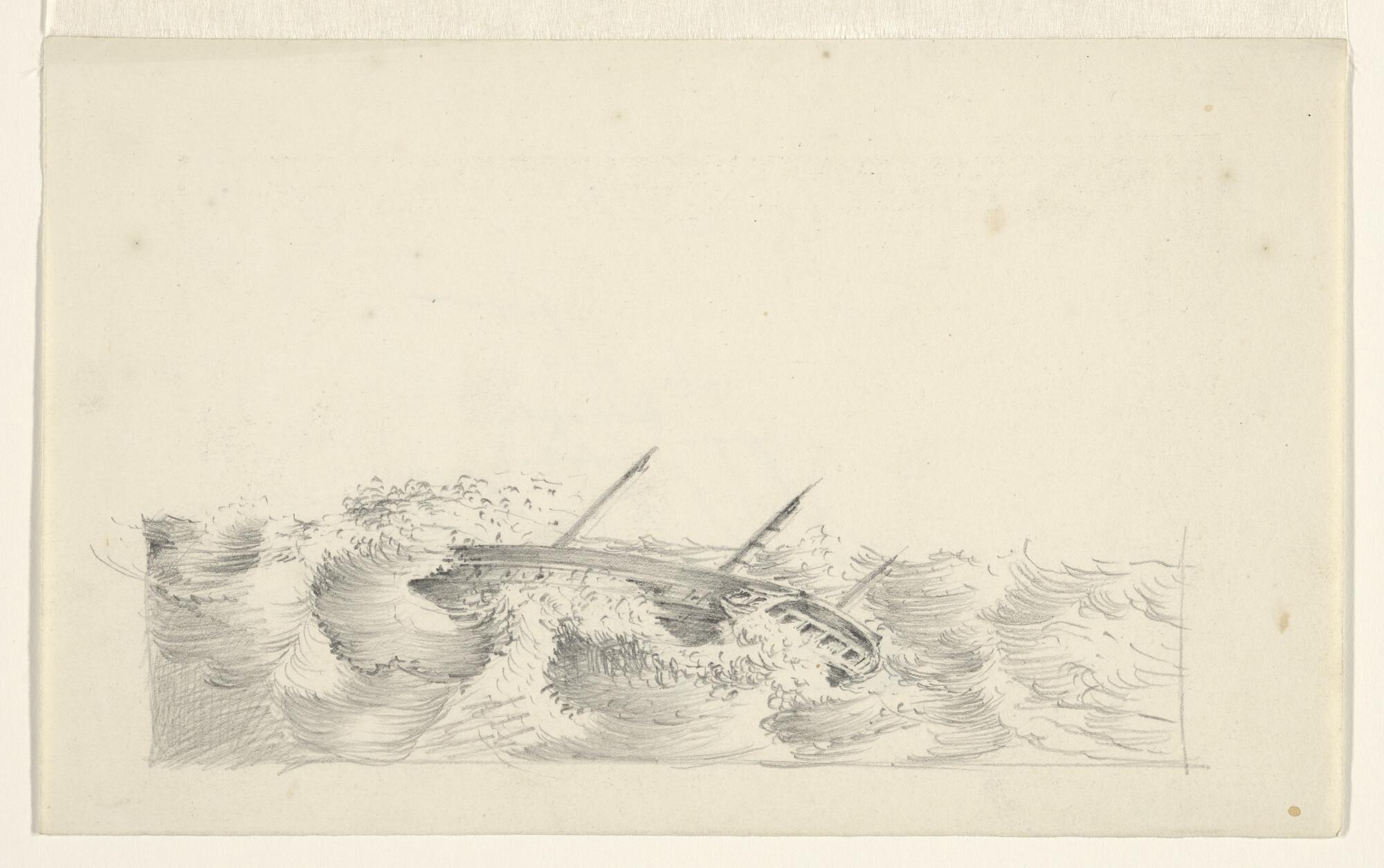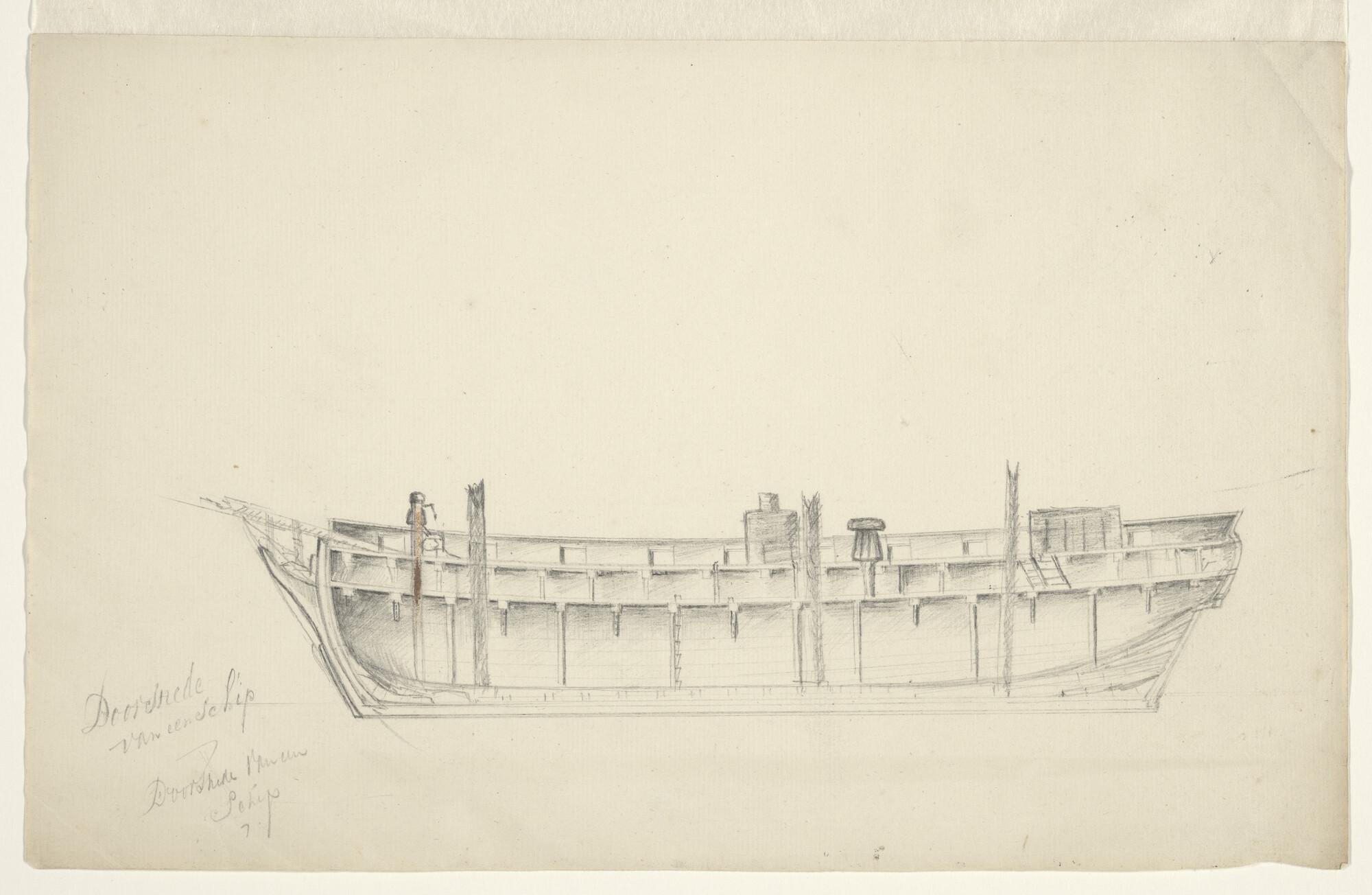 Schetsblad met roei- en zeilschepen en een soldaat m...