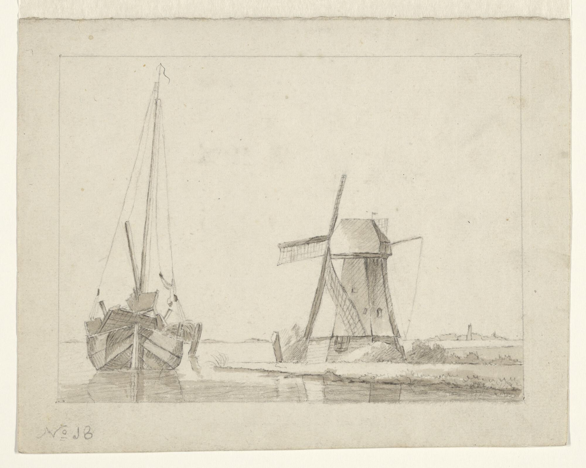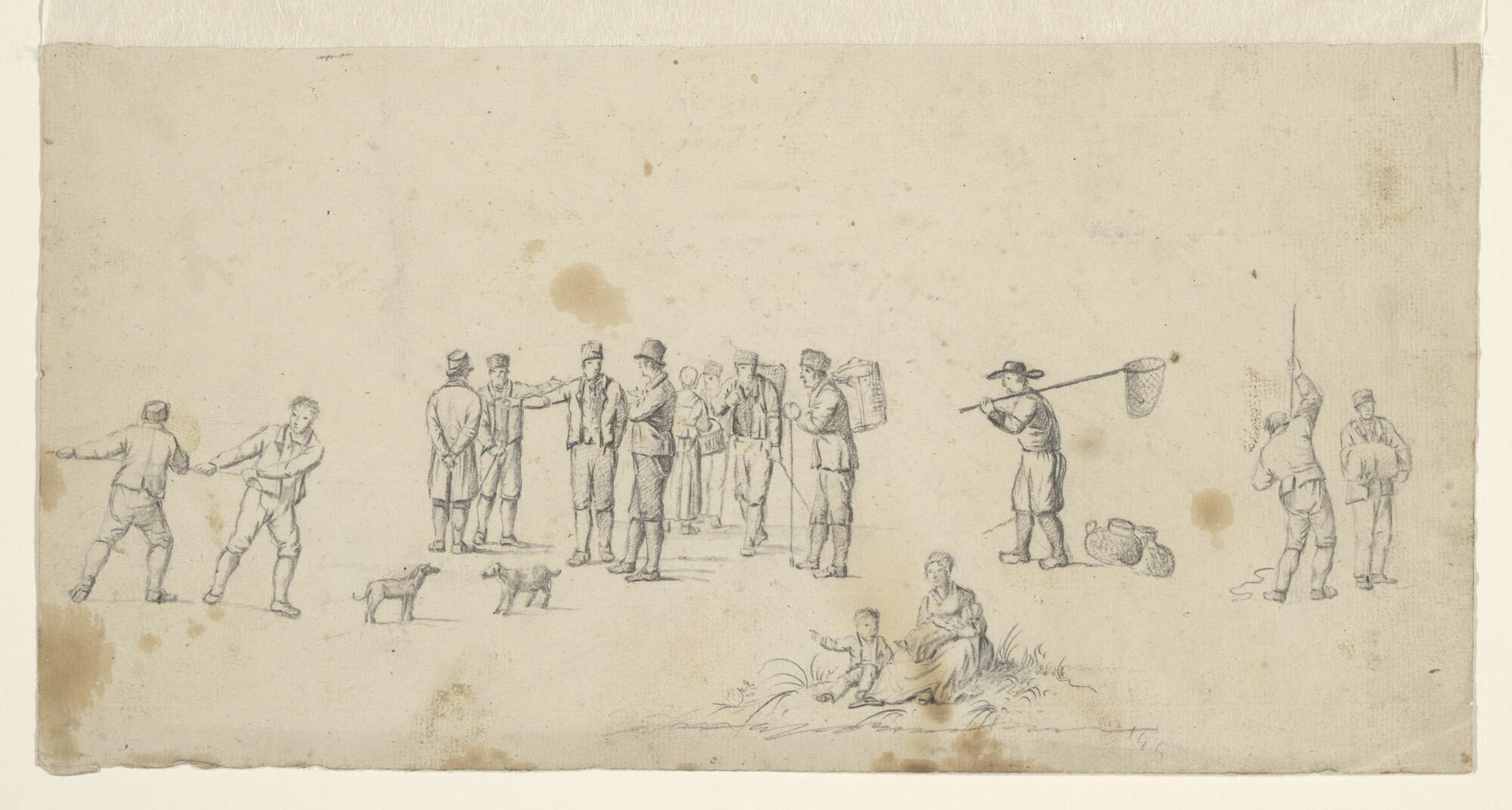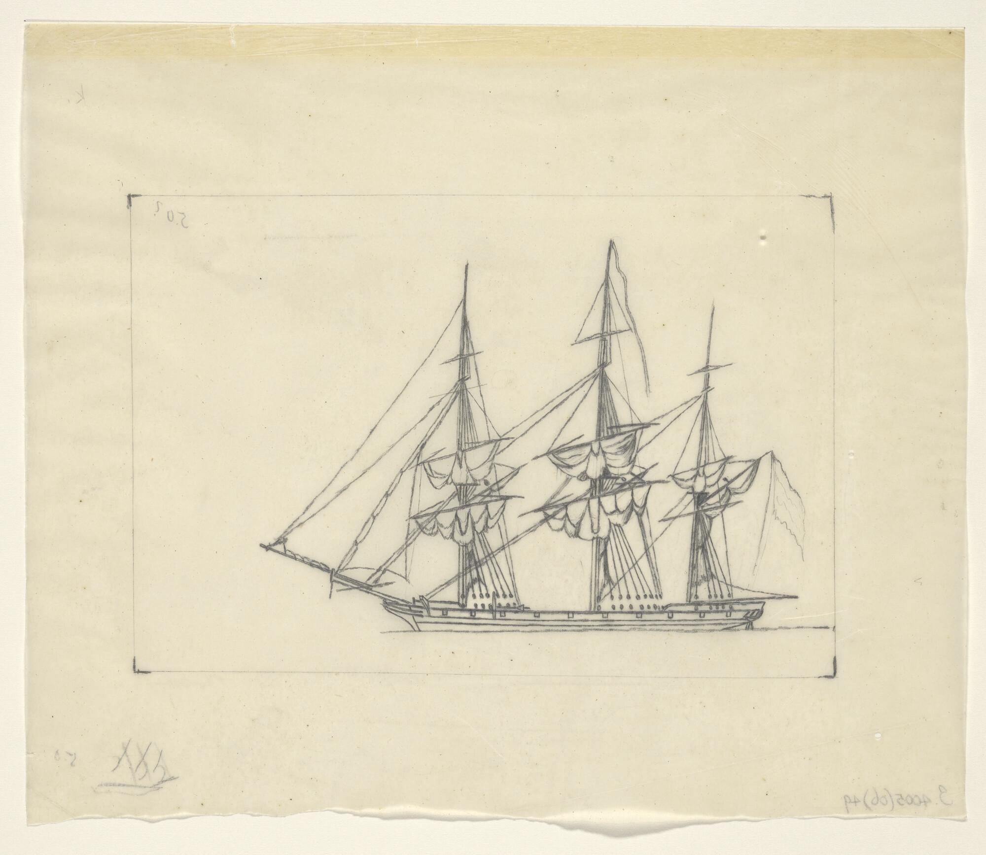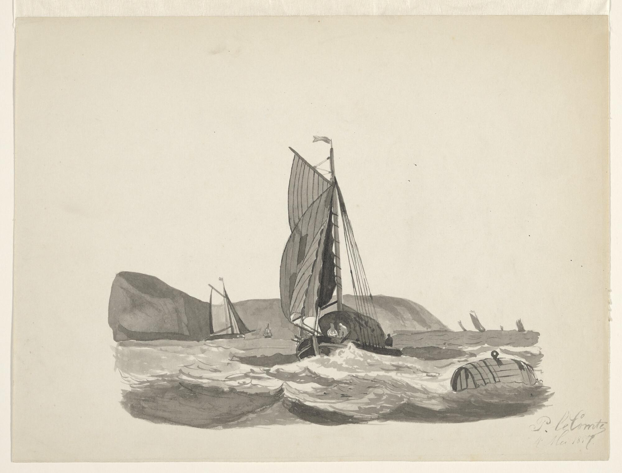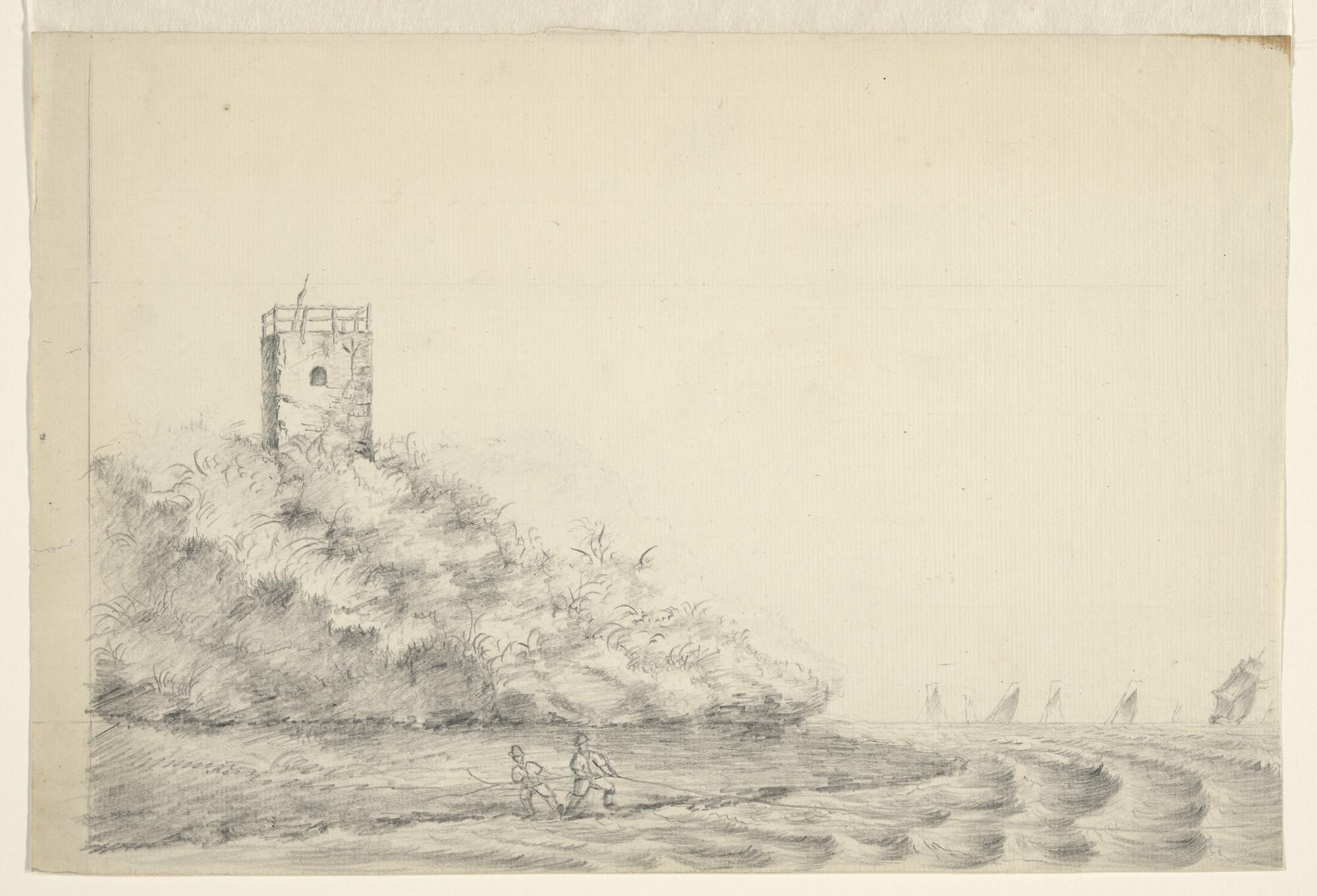 Schetsblad met roei- en zeilschepen en een soldaat m...