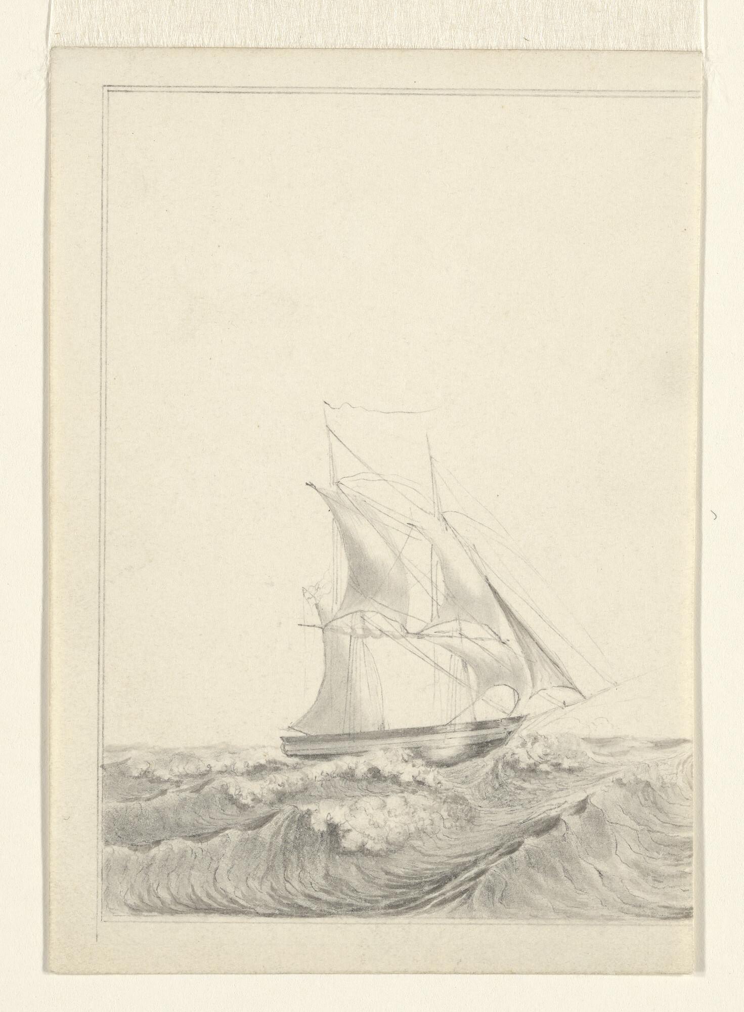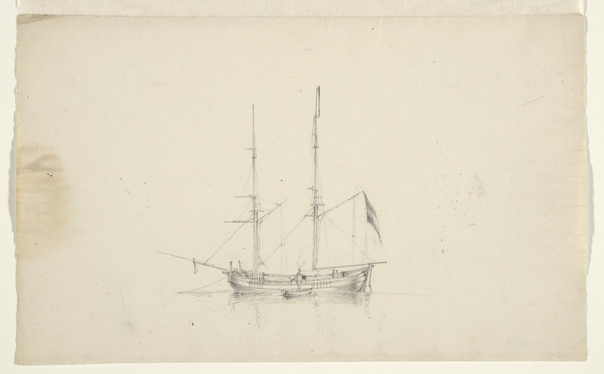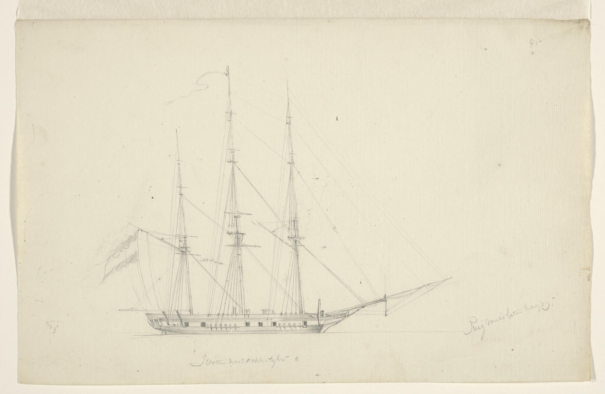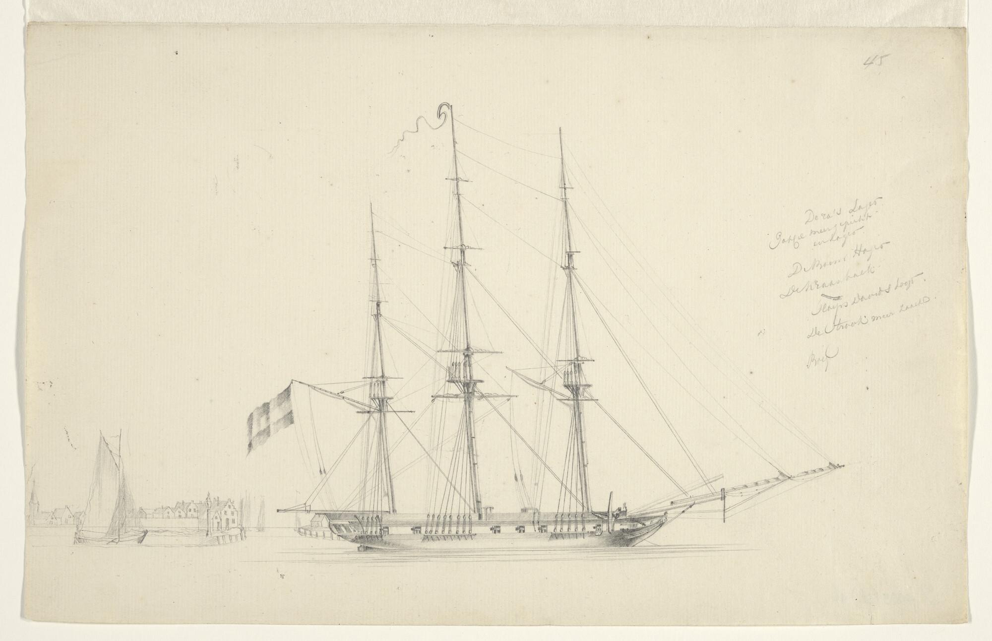 Een oorlogsschoener voor anker op een rede in Nederl...