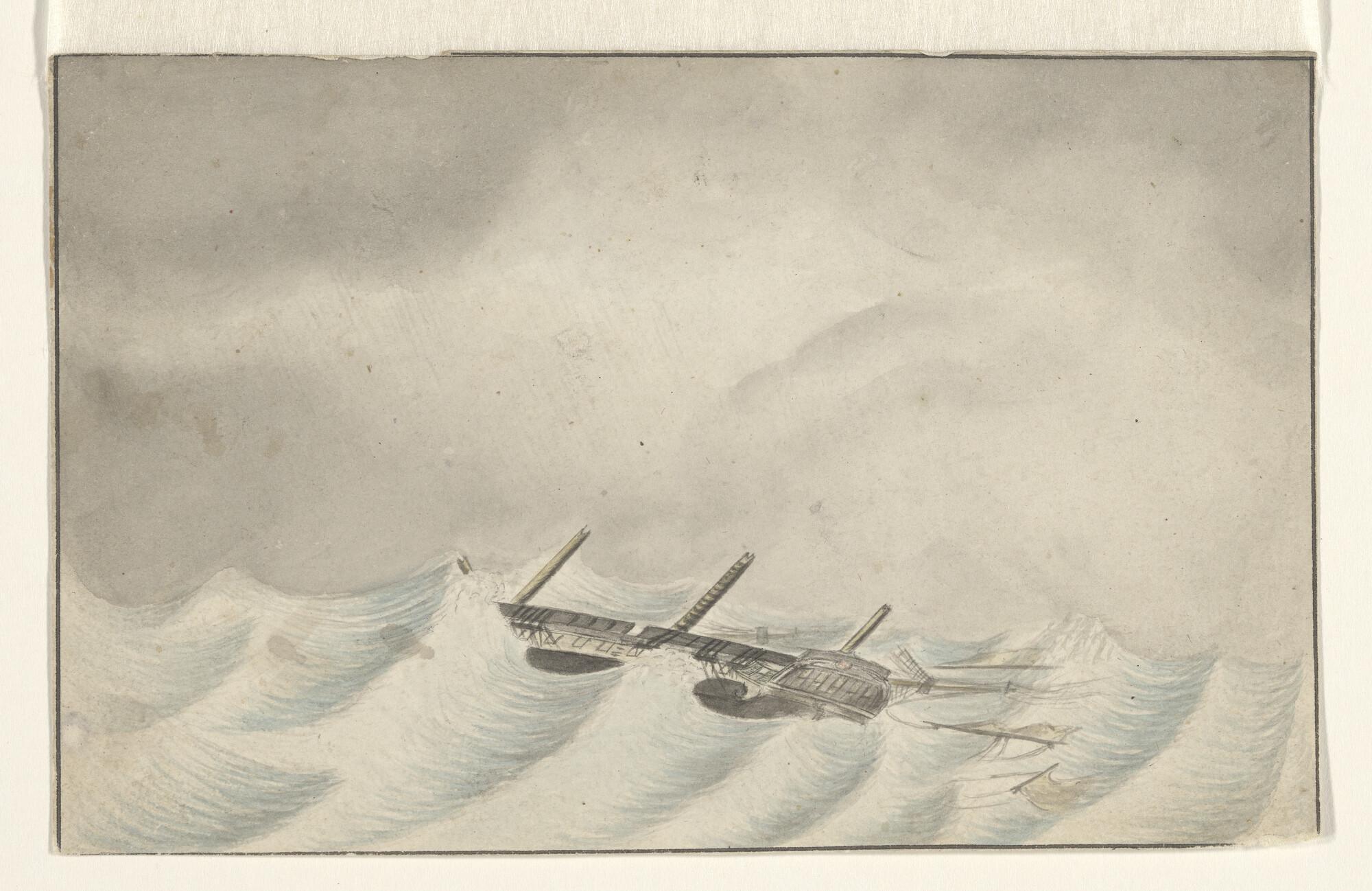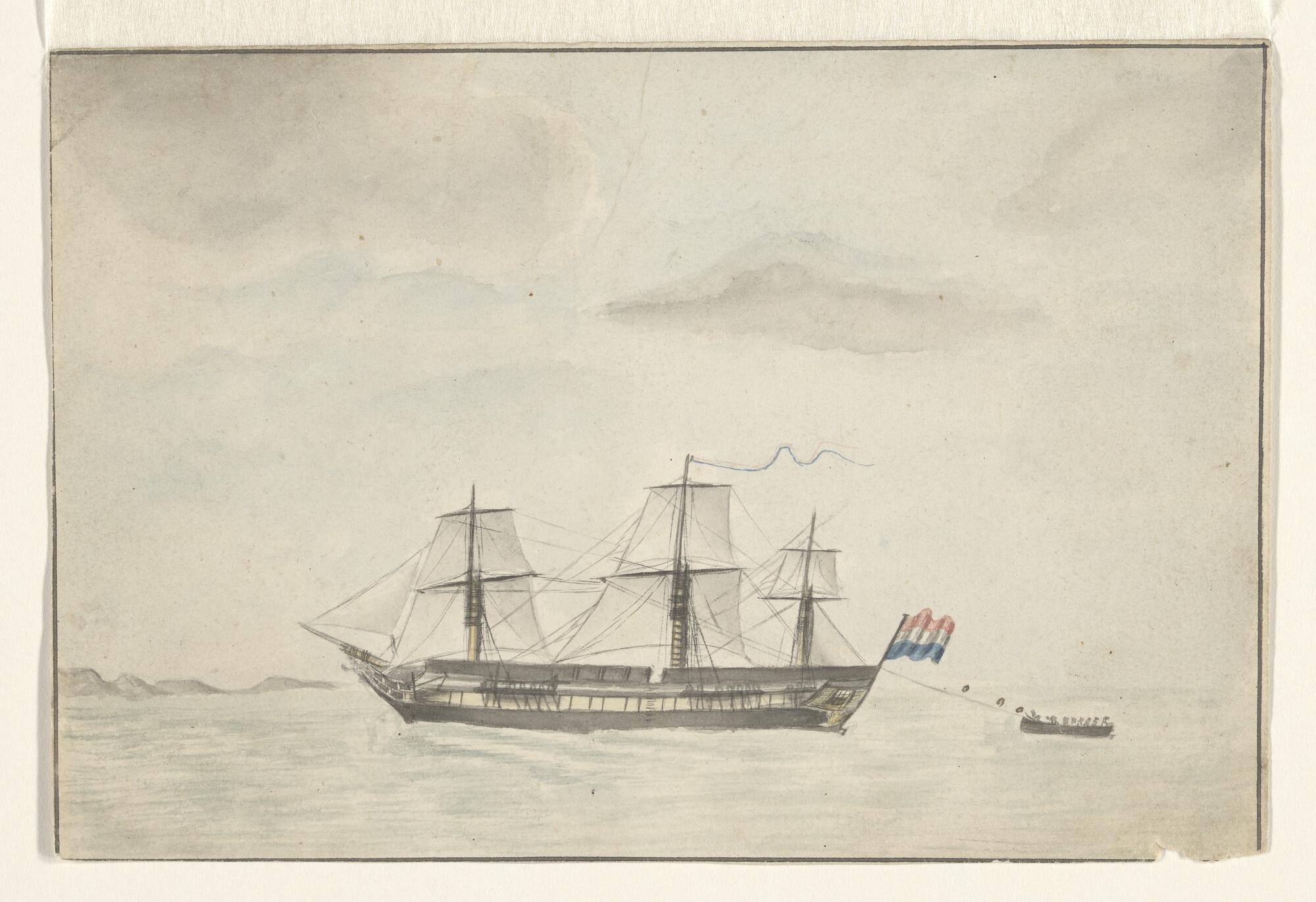 Een oorlogsfregat onder noodtuig, een sloep slepend