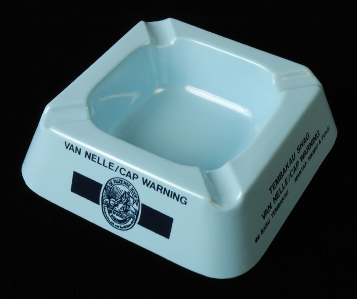 Lichtblauwe asbak "VAN NELLE / CAP WARNING"