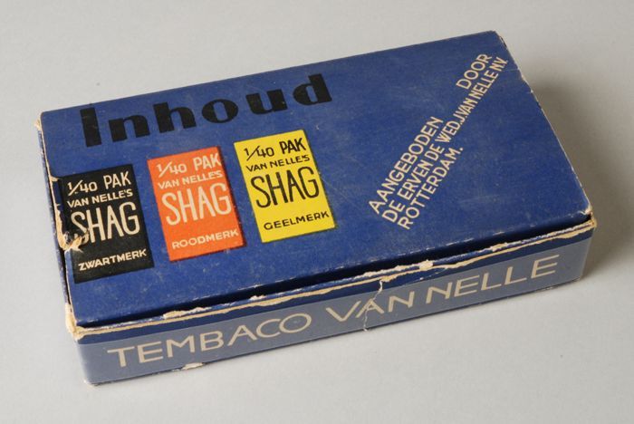Blauwe doos VAN NELLE'S TABAK, inhoud drie pakjes shag