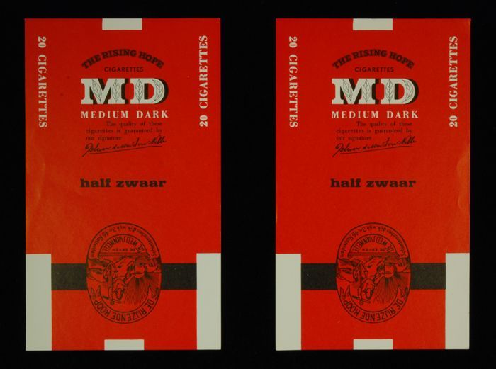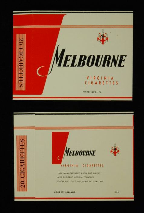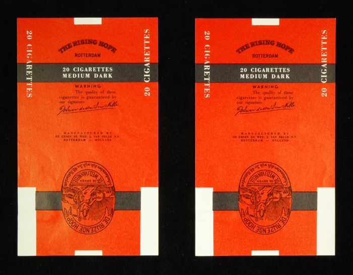 Opengesneden, wit en rood pakje sigaretten VAN NELLE...