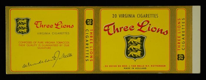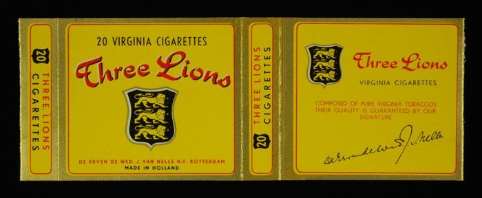 Geel, kartonnen pakje VAN NELLE THREE LIONS, 20 siga...