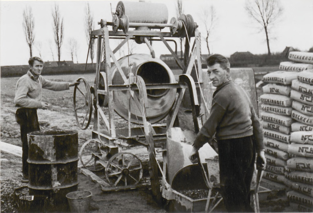 Woningbouw in Tiel-West, twee personen maken cement ...