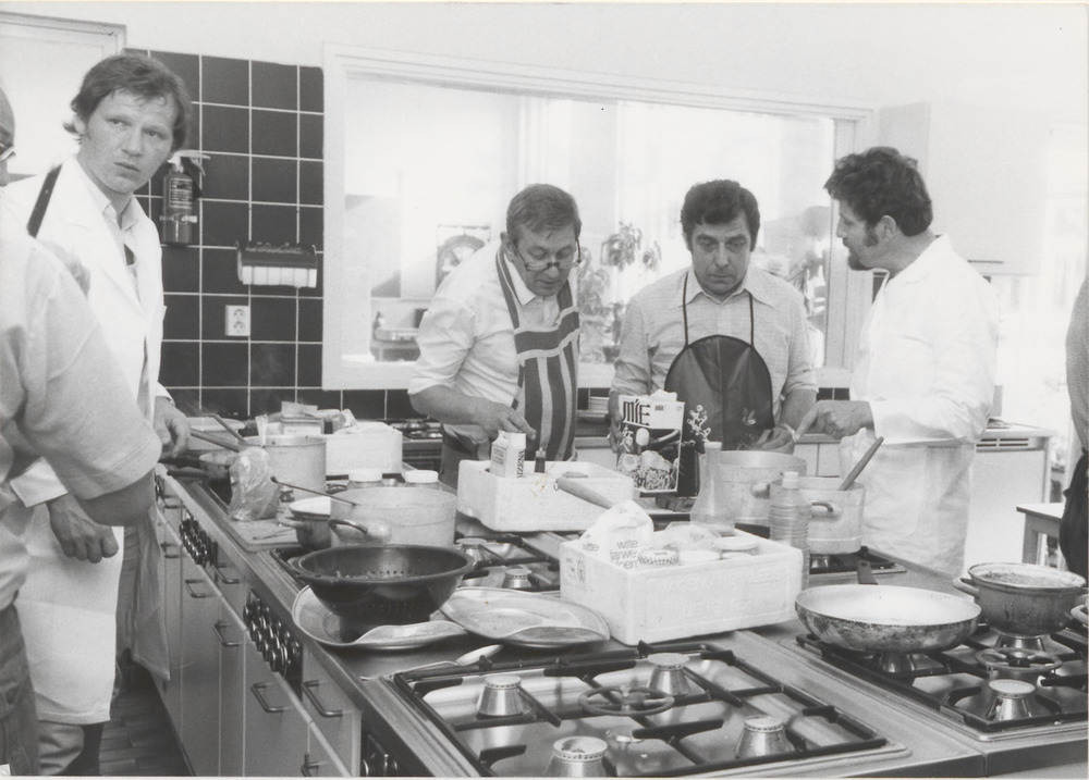Kookcursus Heren, gezellig groepje staan om het forn...