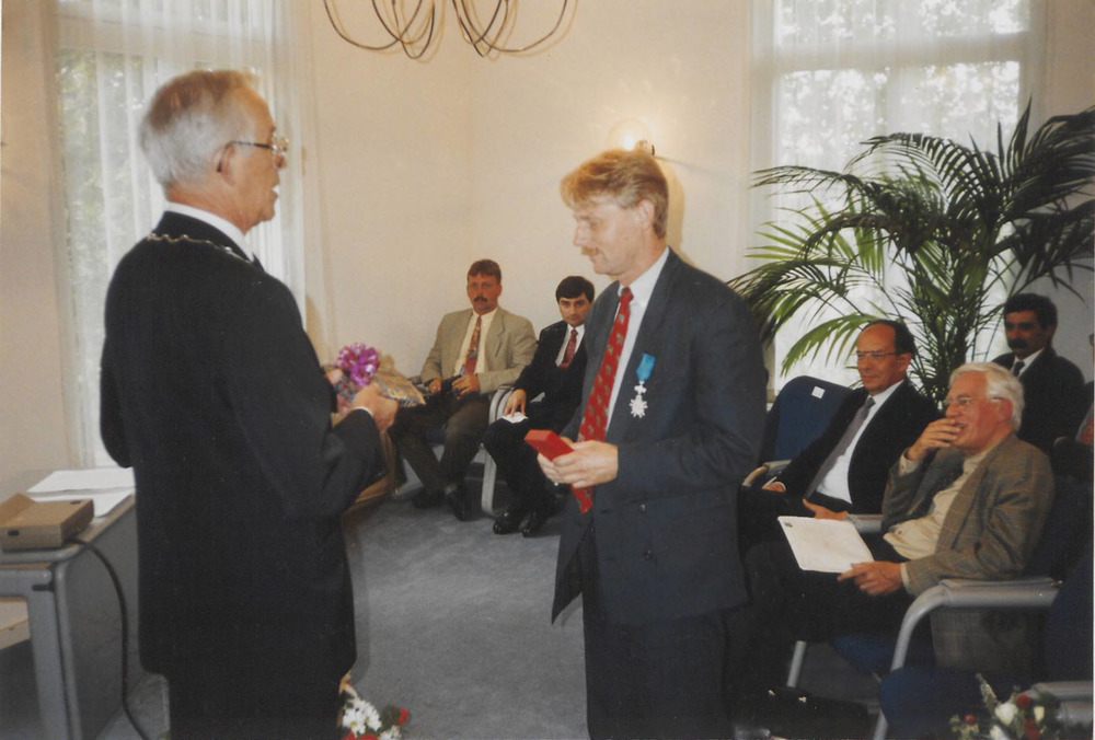 Links Wethouder Piet Schroer, hij feliciteert een man.