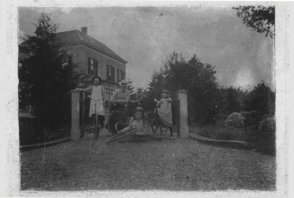 Meisjes met fiets bij toegangshek Huize De Kamp