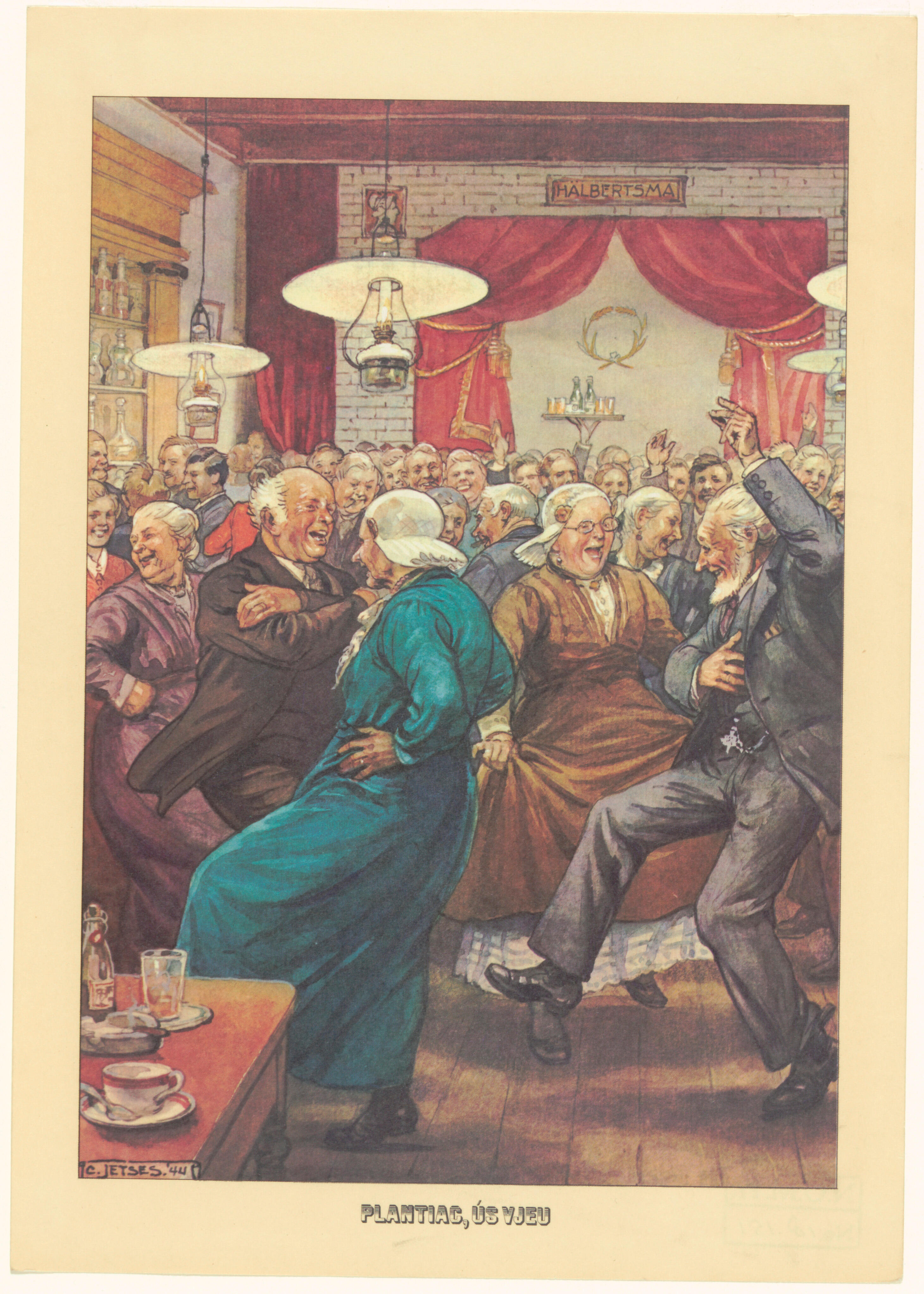 Reclameplaat van dansende mensen in een herbergzaal ...
