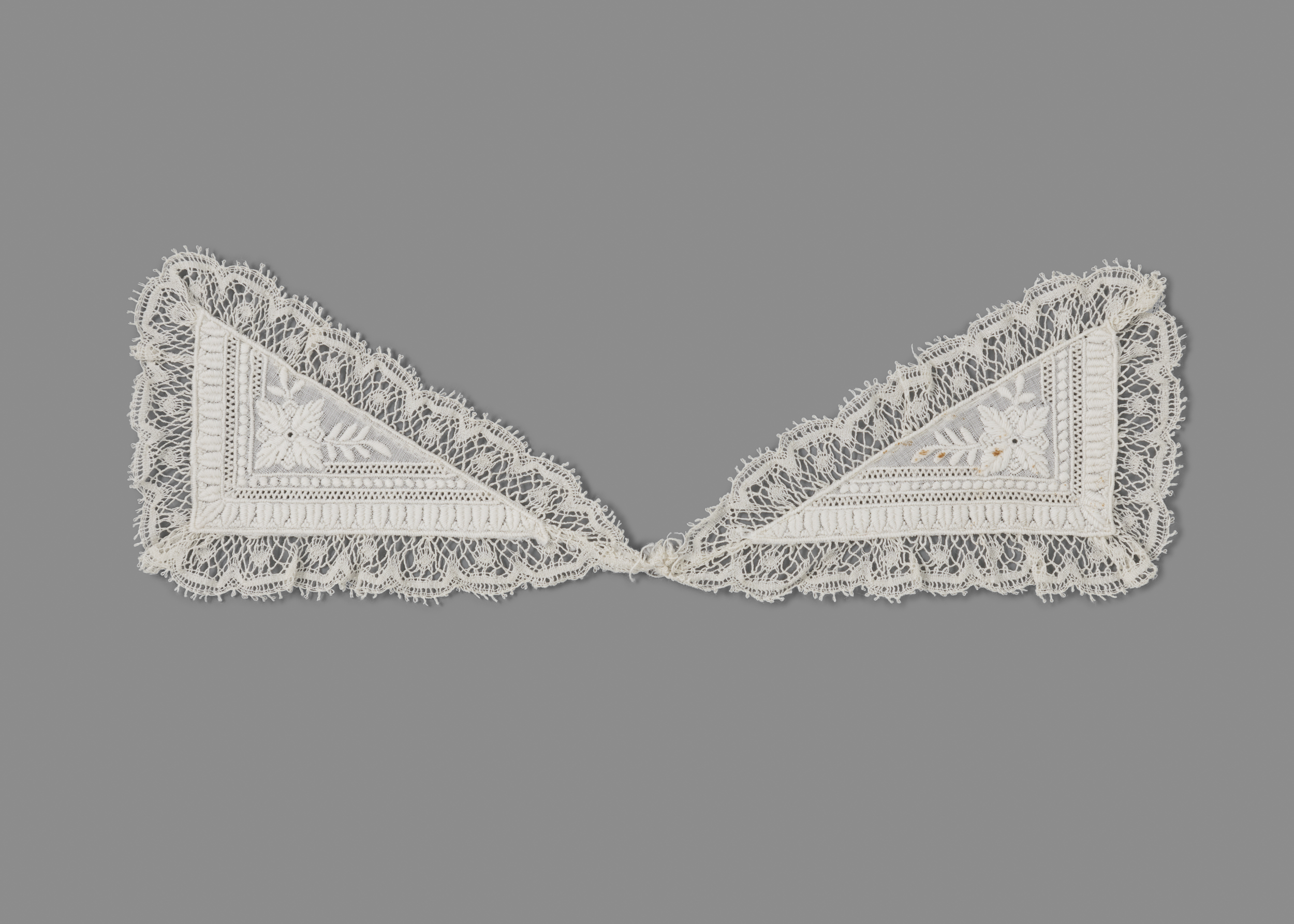 Twee aaneengenaaide driehoekige punten van batist va...
