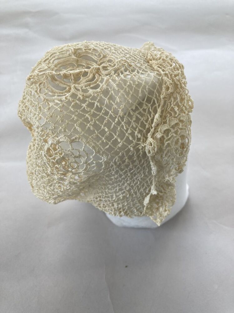 Mutsje gebreid van wit katoen met ajour ruitjes, ond...