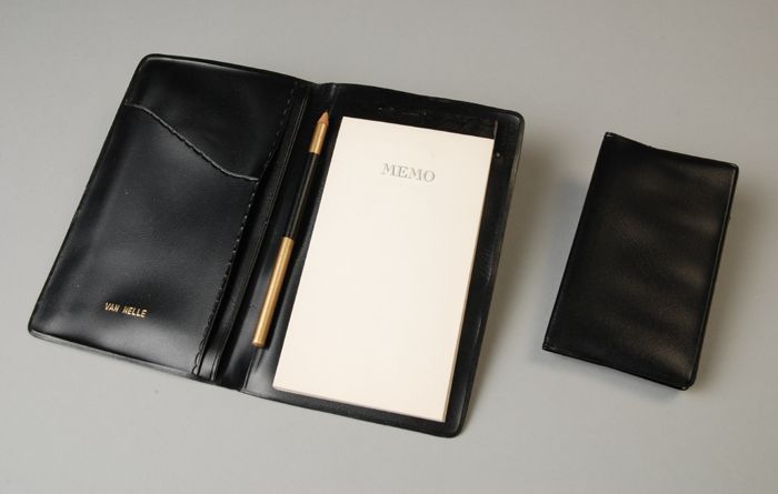 Plastic omslag van "VAN NELLE" met notitieboek, potl...