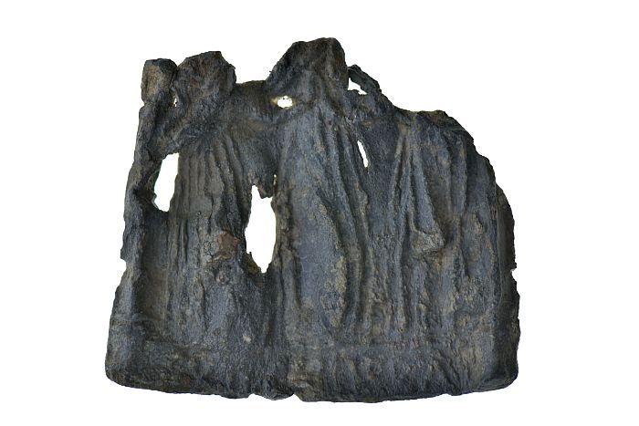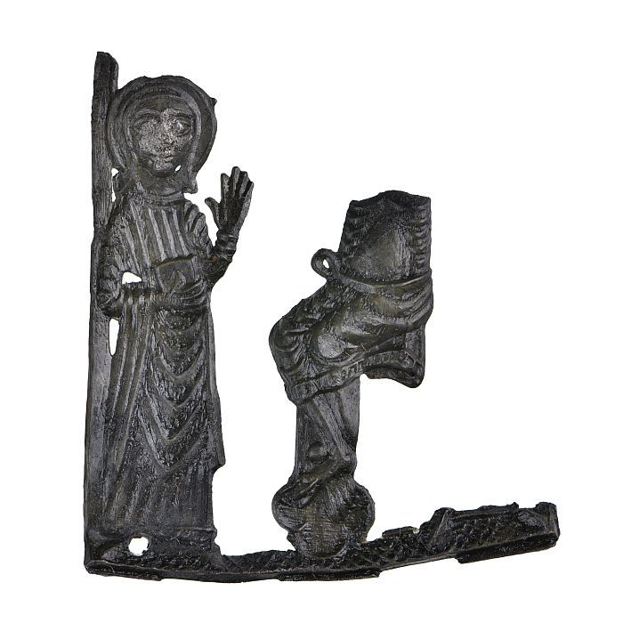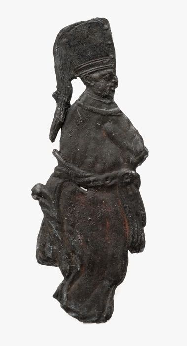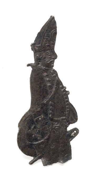 Fragment van tinnen pelgrimsinsigne, onderstuk met g...