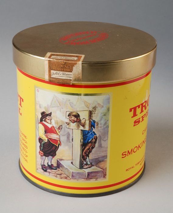 Geel tabaksblik met rode letters en los deksel, Van ...