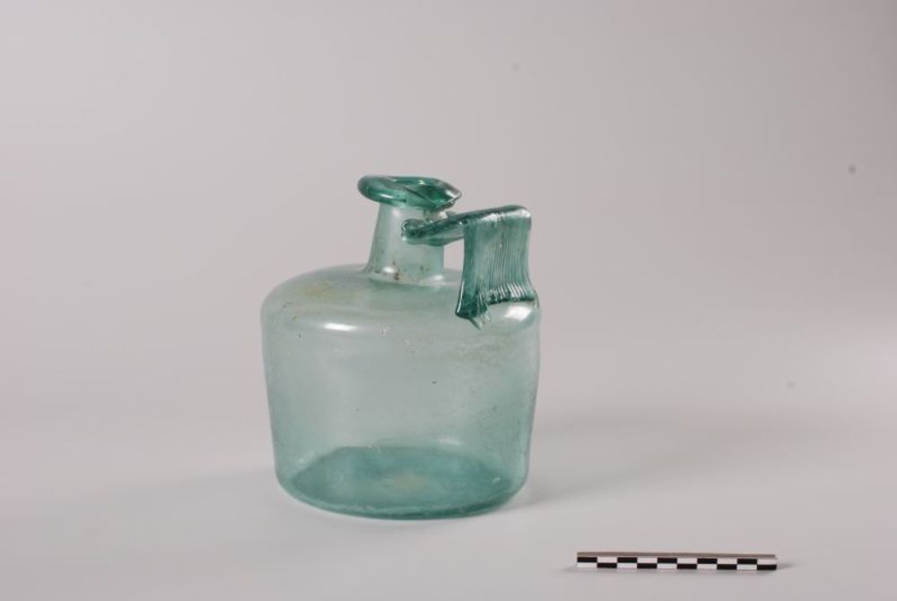 Cilindrische fles van glas uit de midden Romeinse tijd