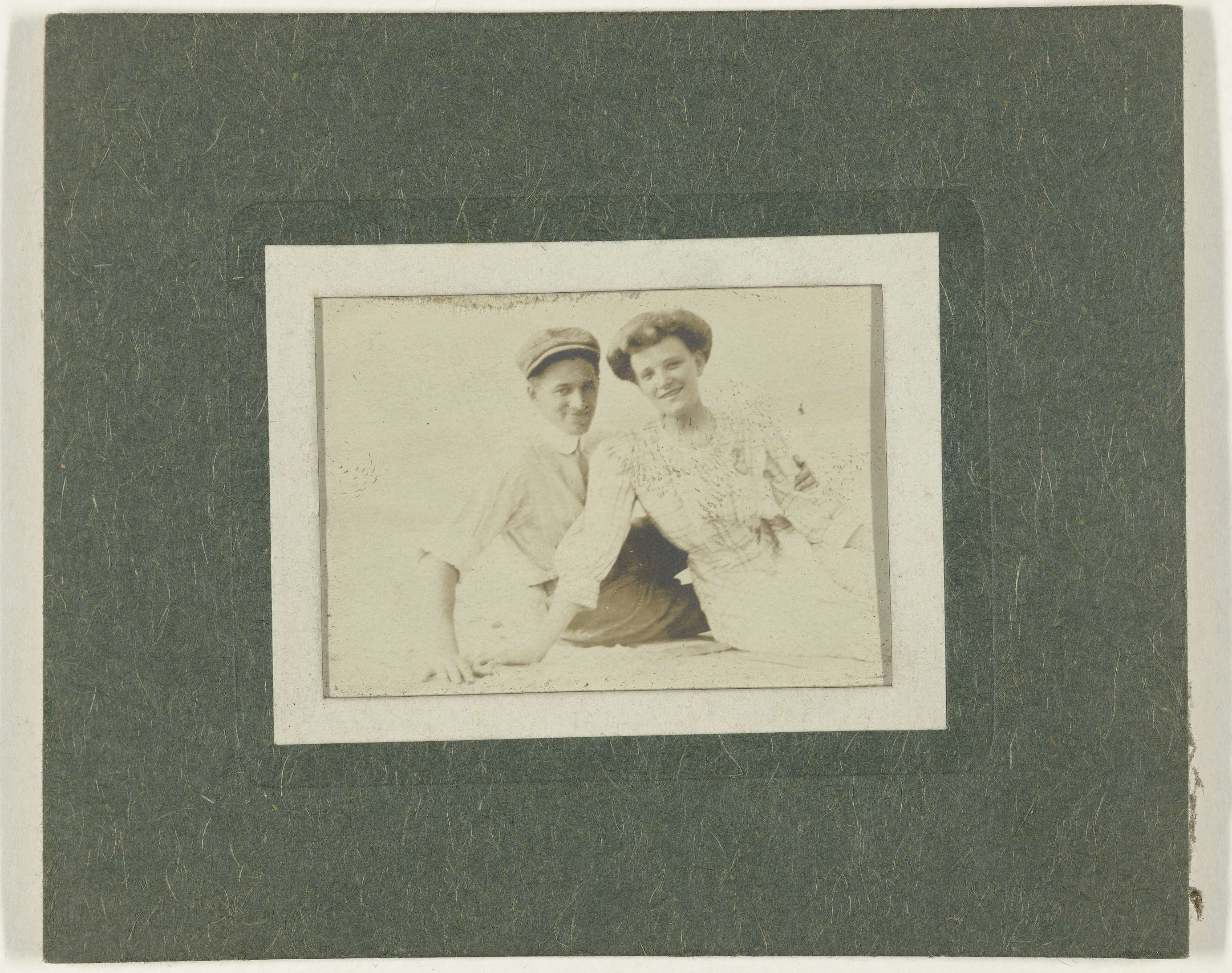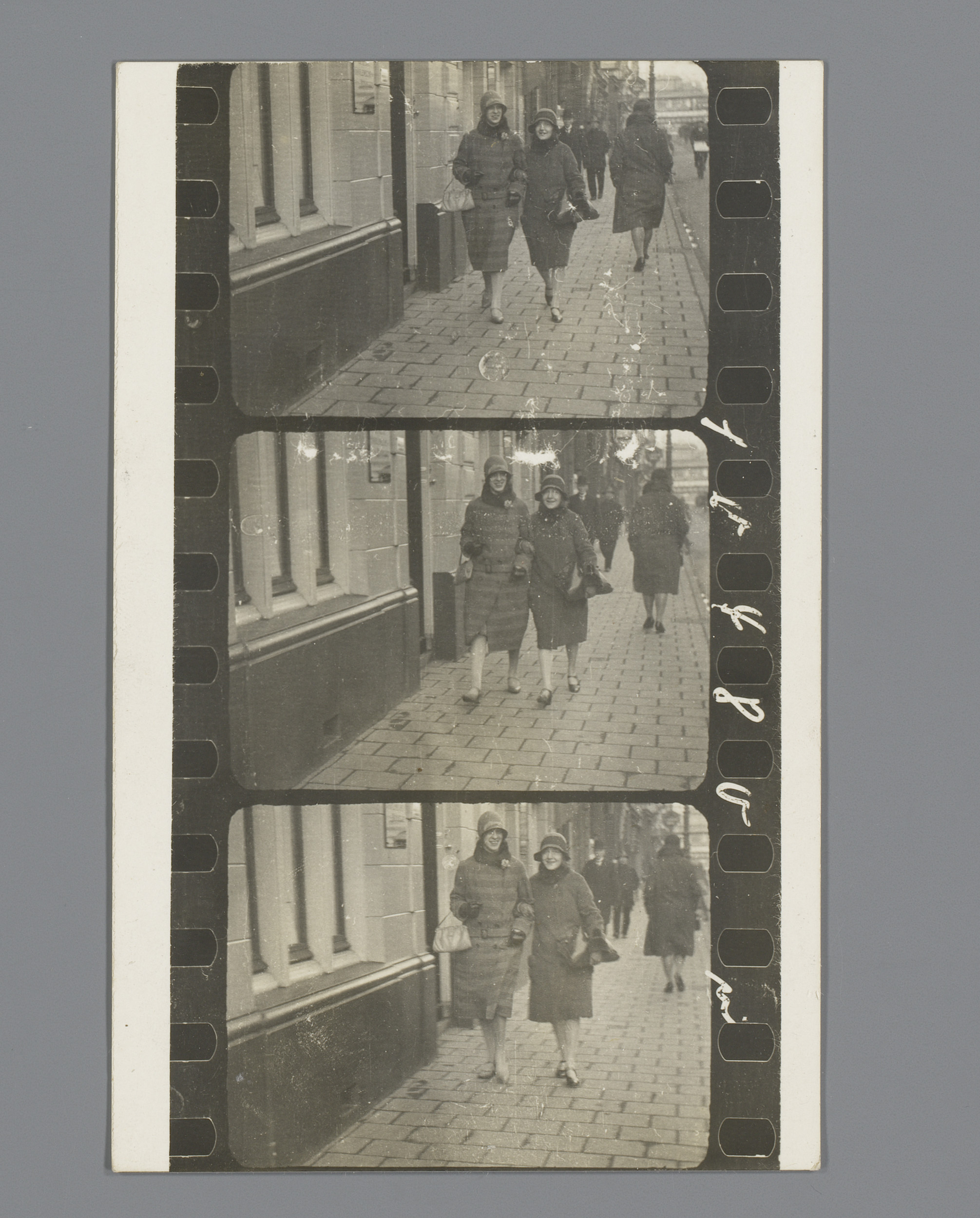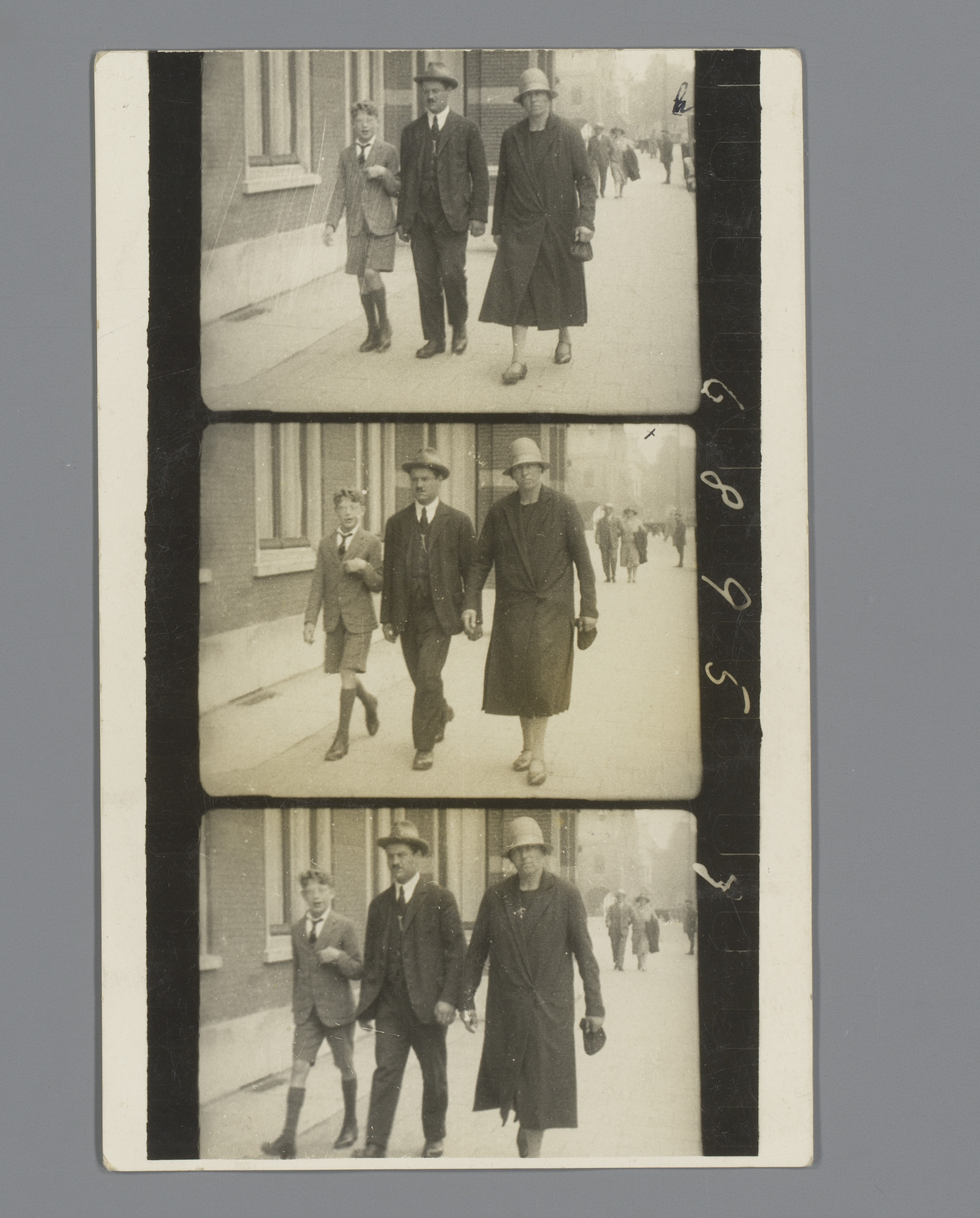 Prentbriefkaart met drie filmbeelden van twee onbeke...
