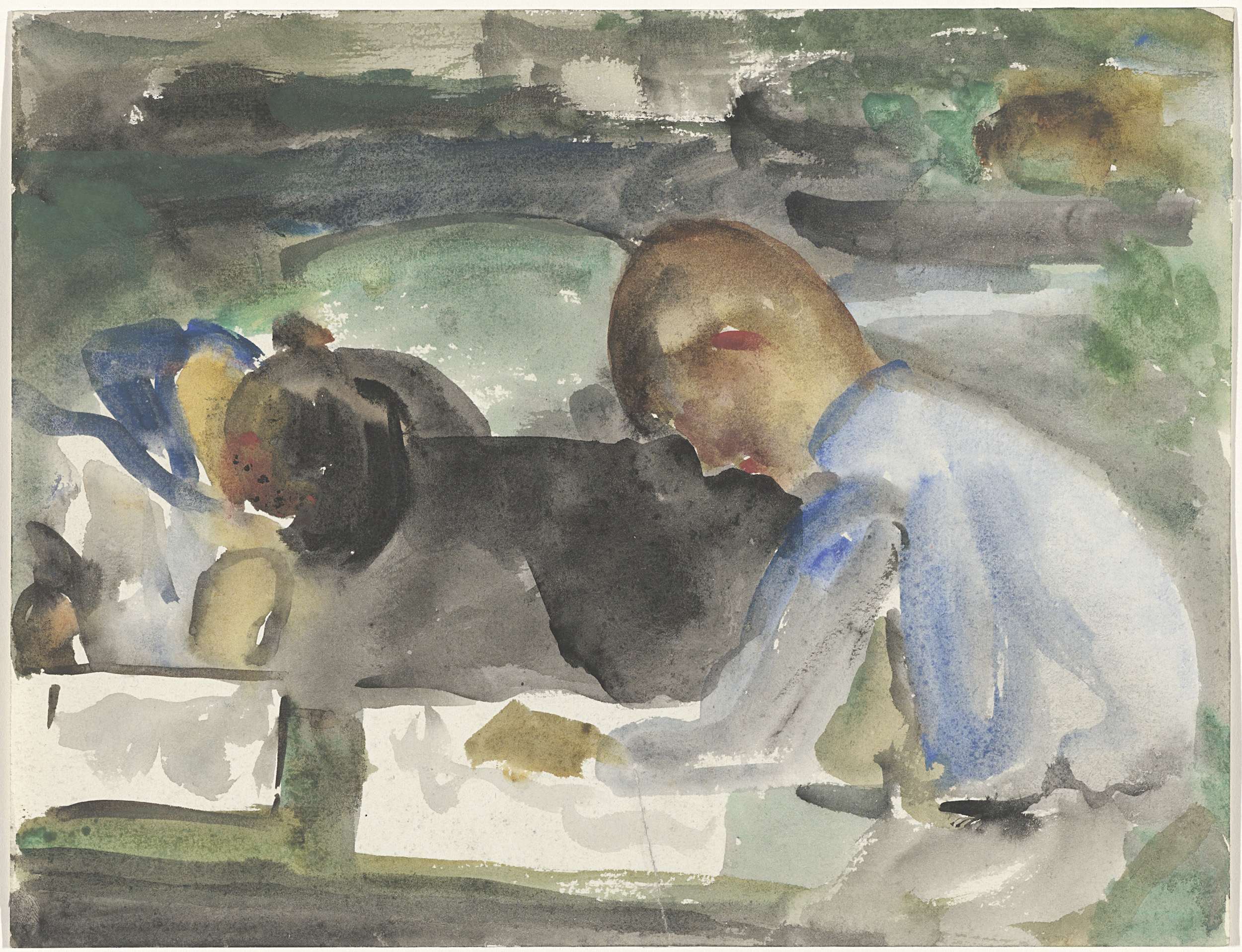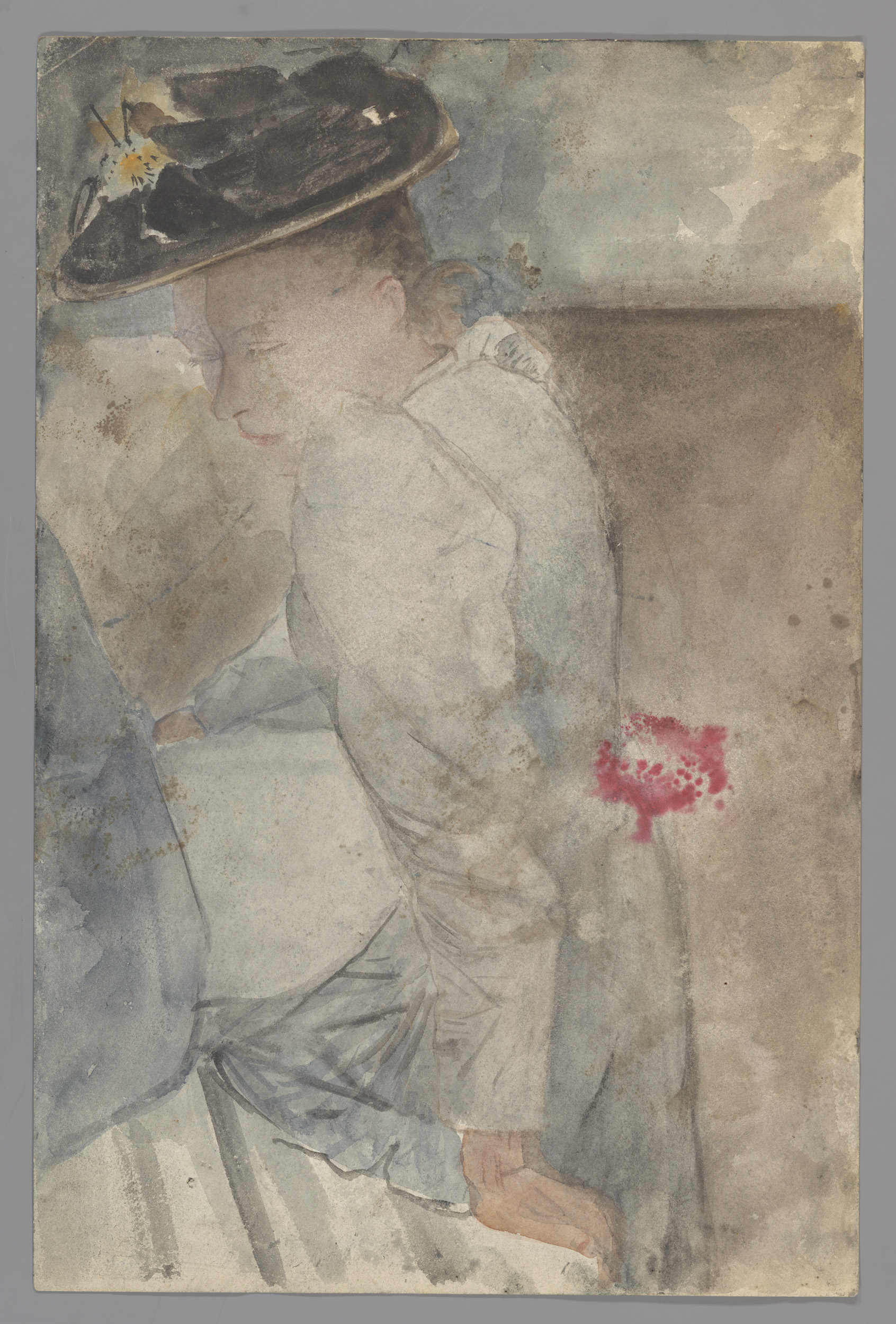 Zittende vrouw met platte hoed, steunend op haar lin...
