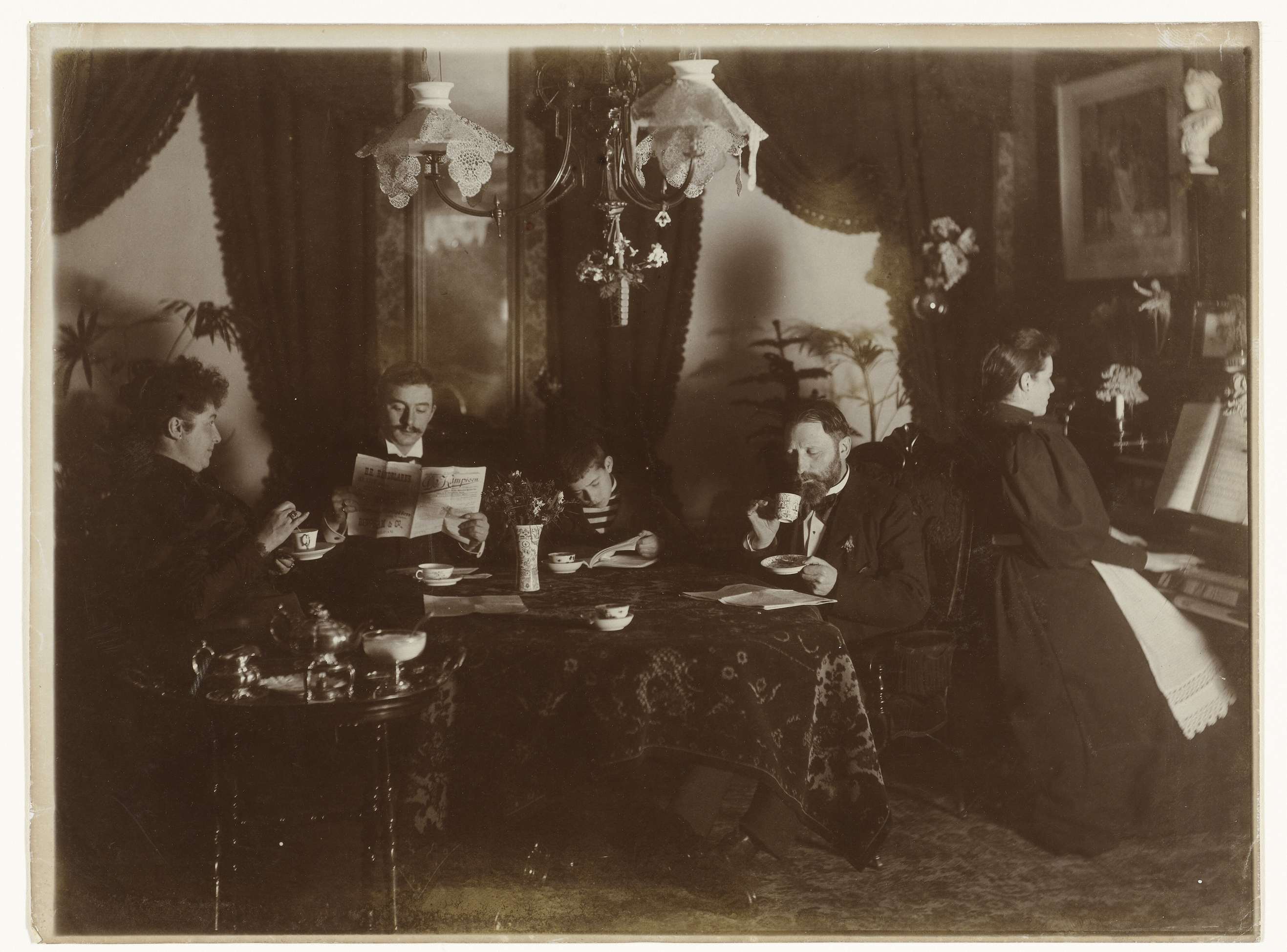 Familie aan tafel en aan de piano, thee of koffie dr...