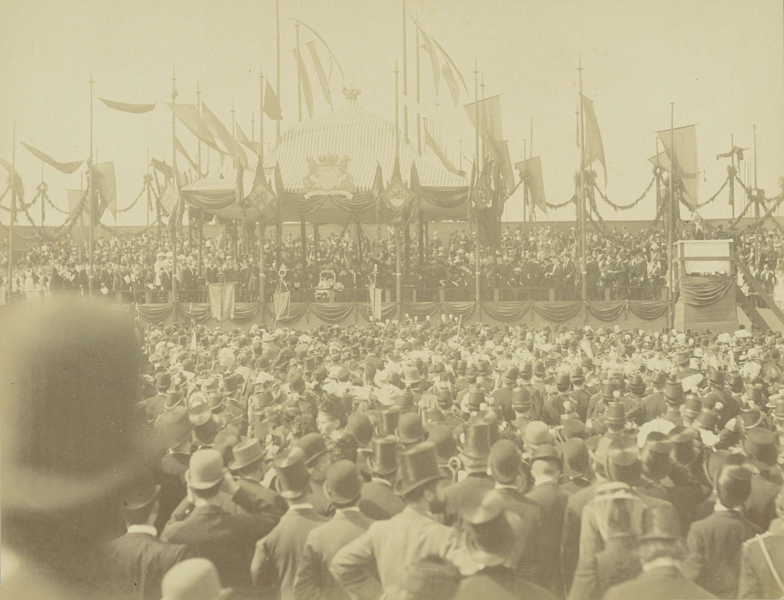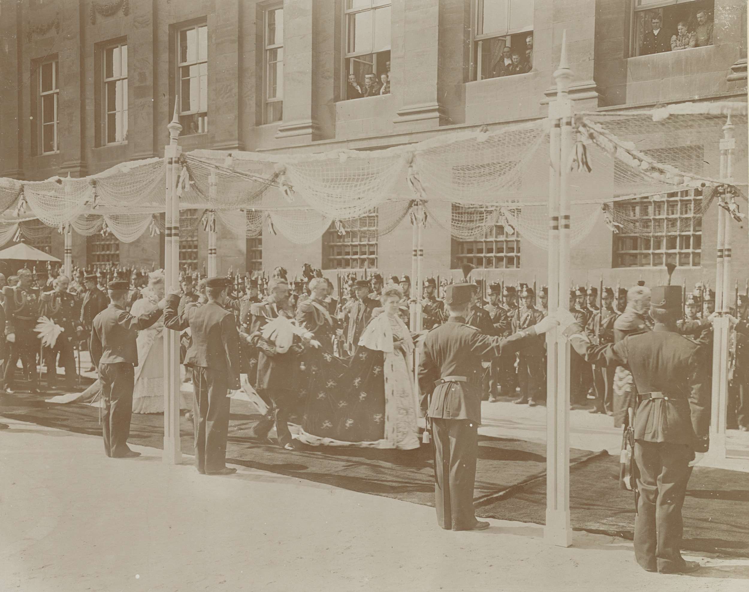 Koningin Wilhelmina en gevolg onder het baldakijn ti...