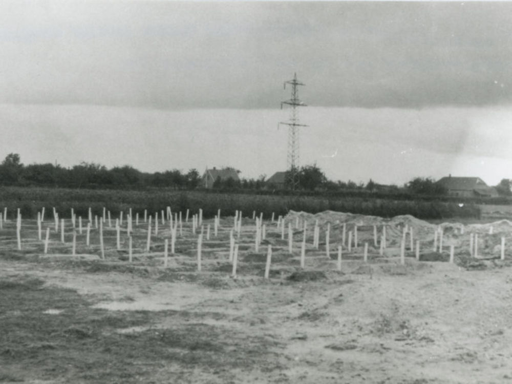 Foto van plot met oorlogsgraven voor weiland. Op de ...