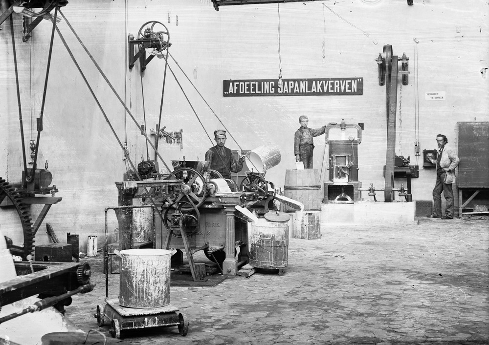 Personeel aan het werk in verffabriek Veluvine