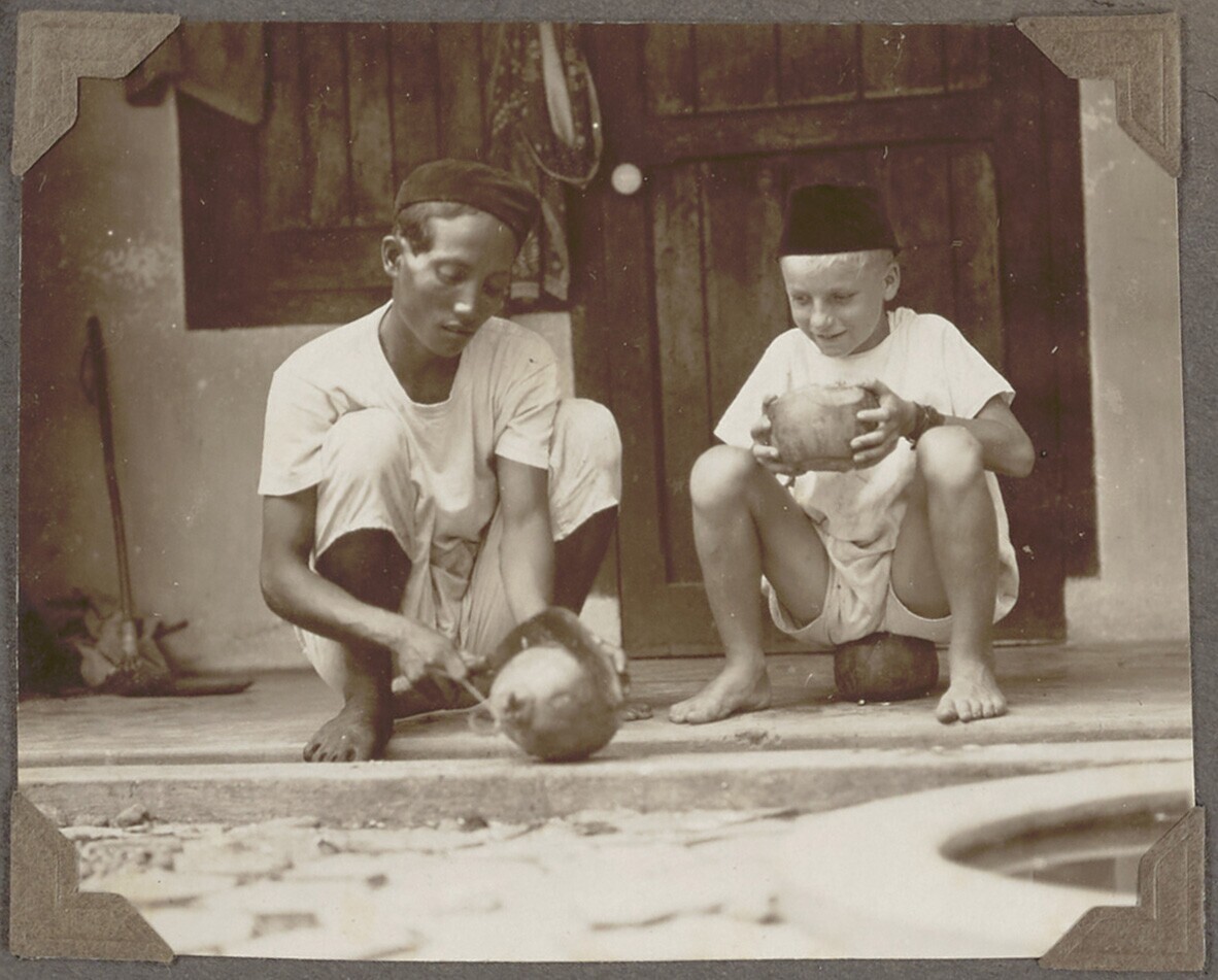 Een Europese jongen met een Javaan die een cocosnoot...