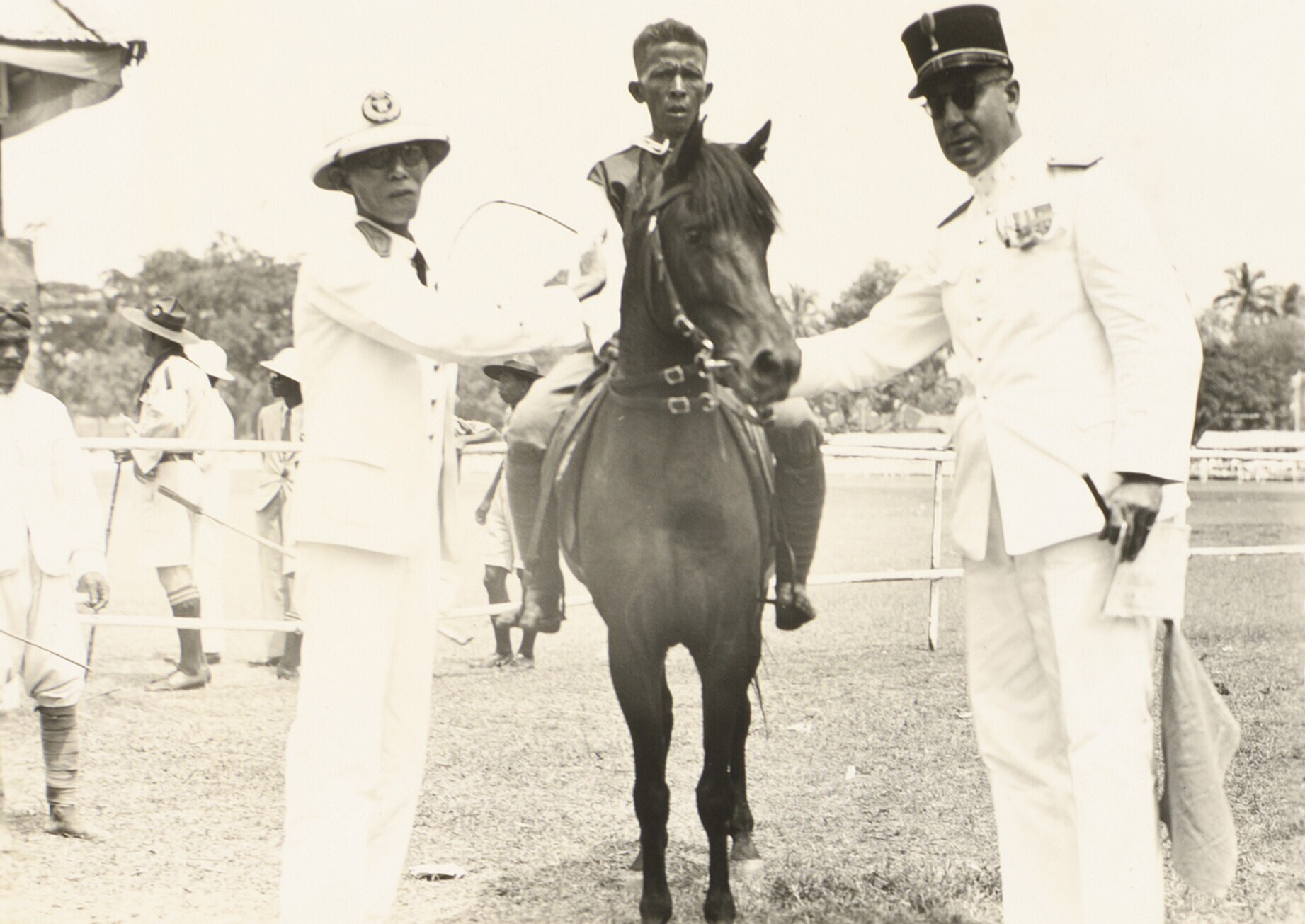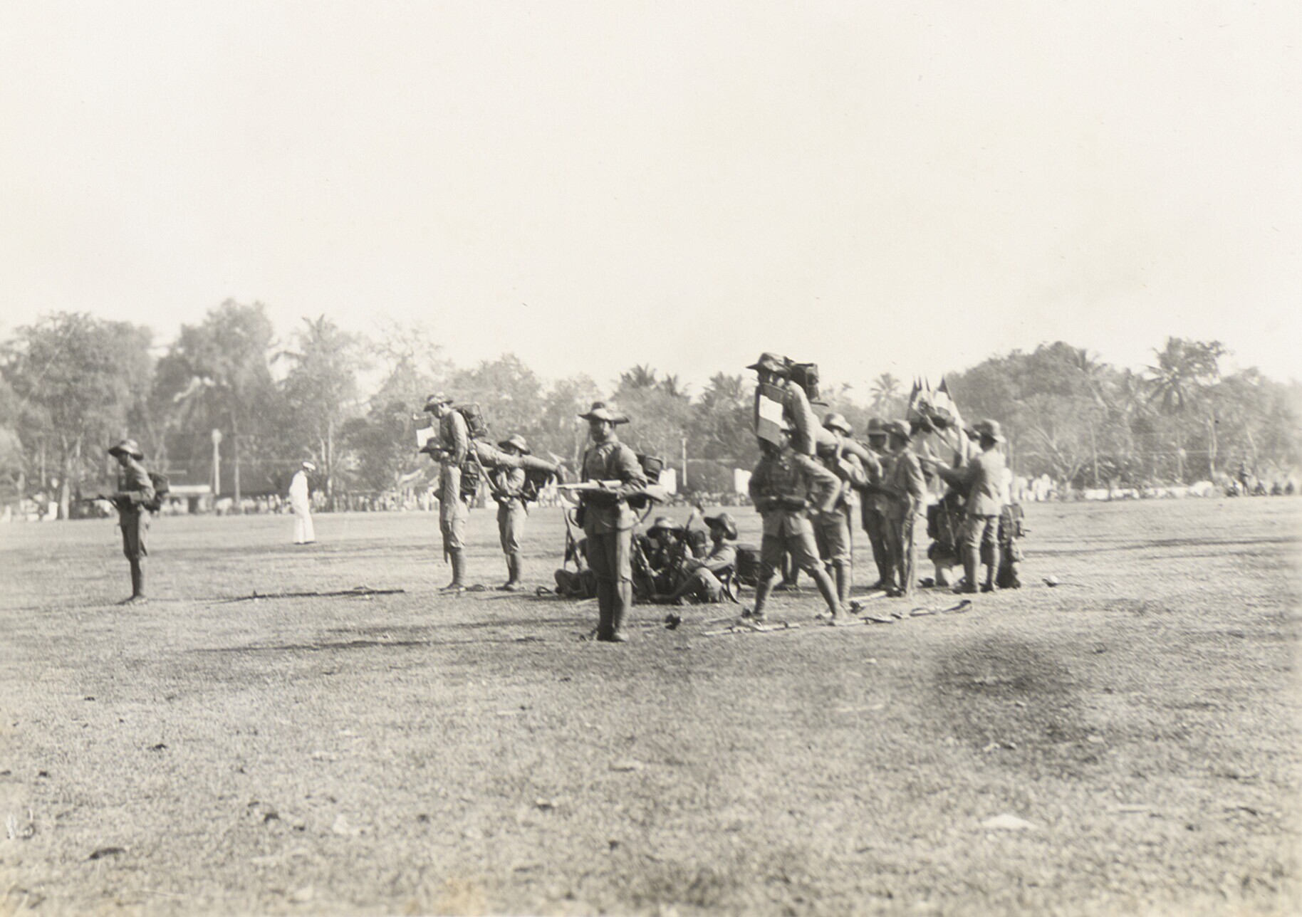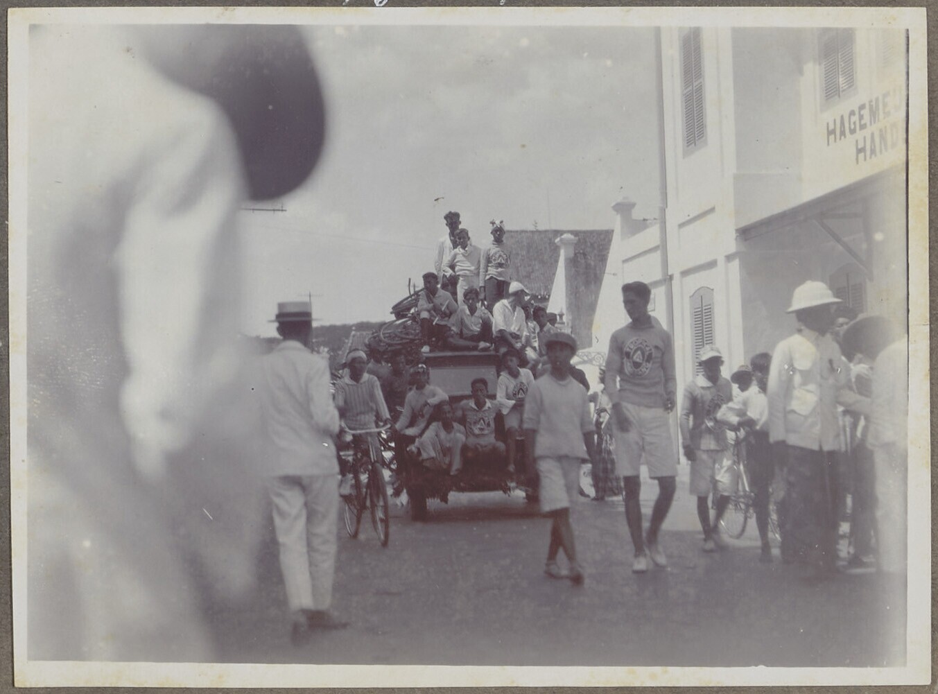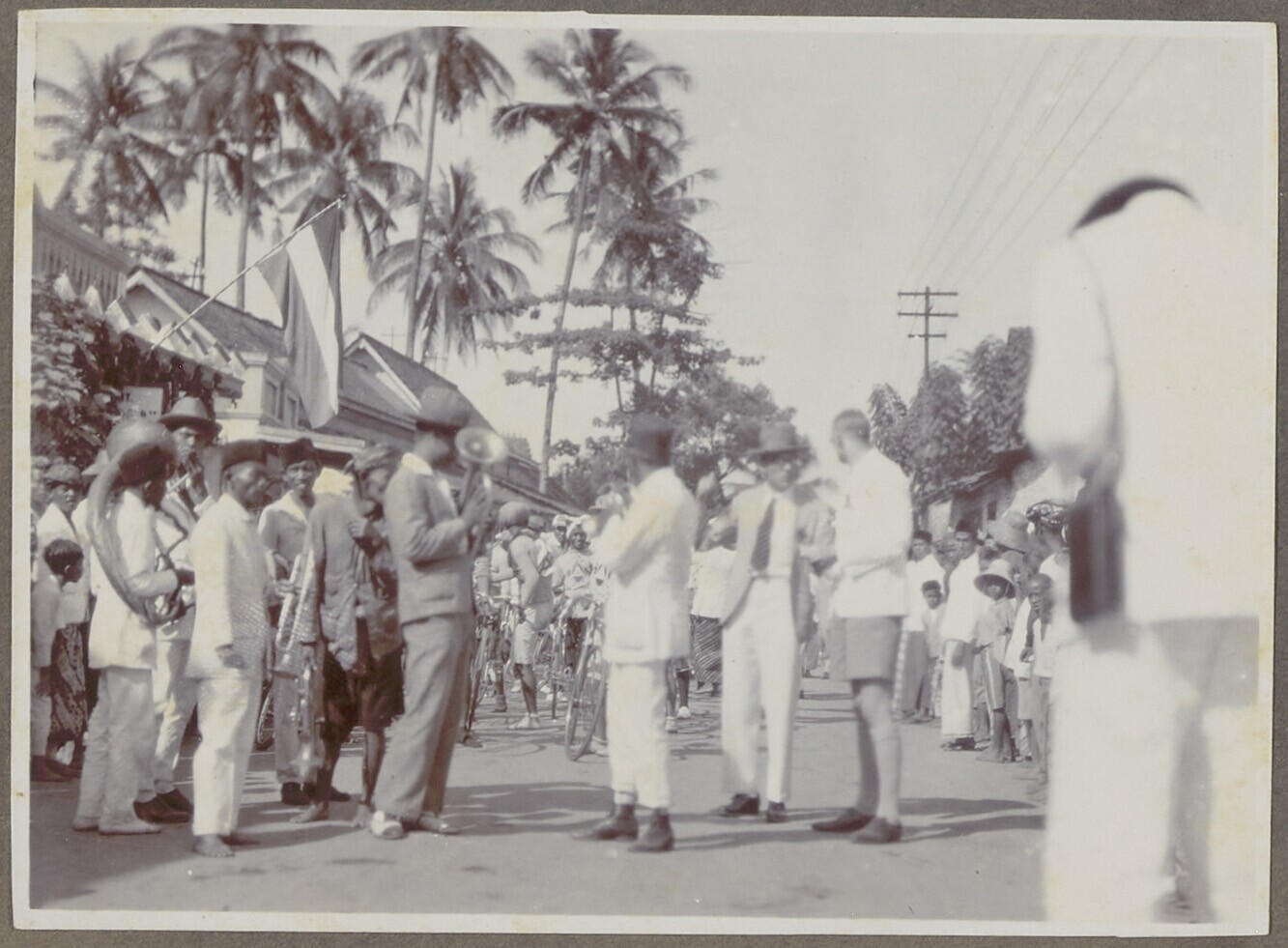Een groep Europese en javaanse mannen op straat bij ...