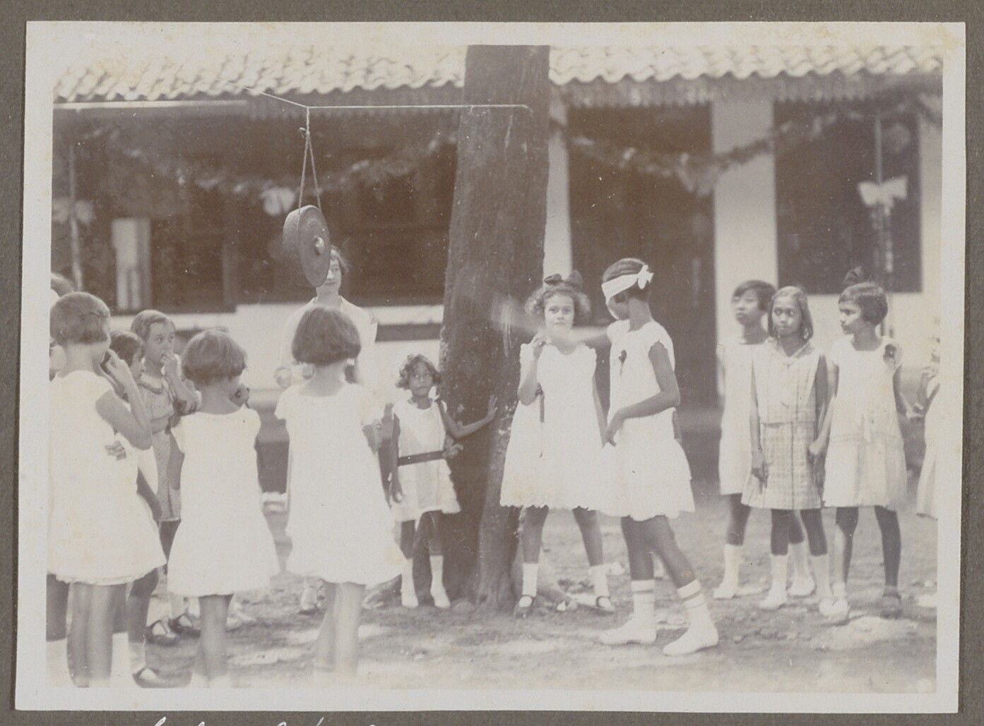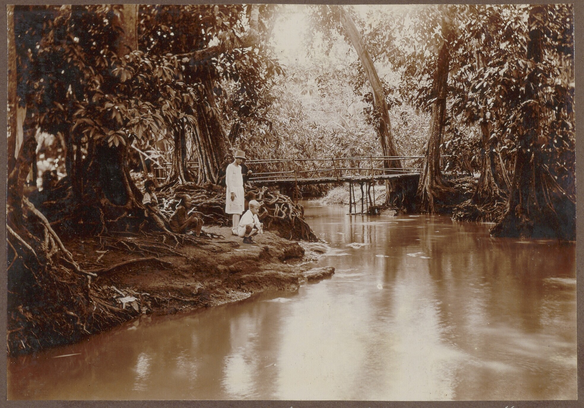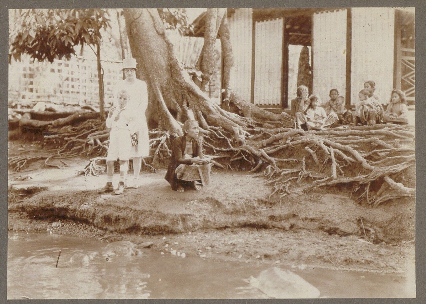 Europese en Javaanse jongens bij een stenen muurtje