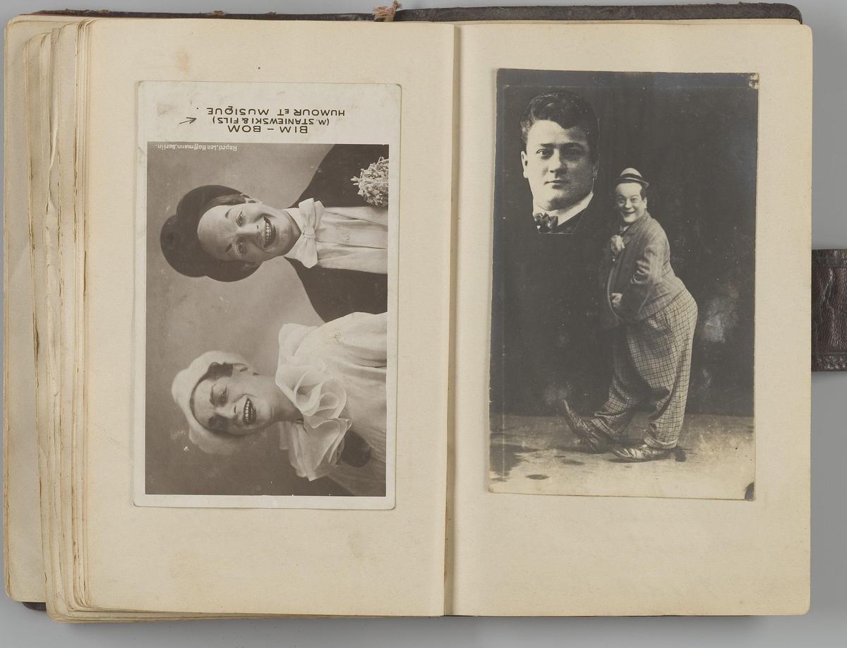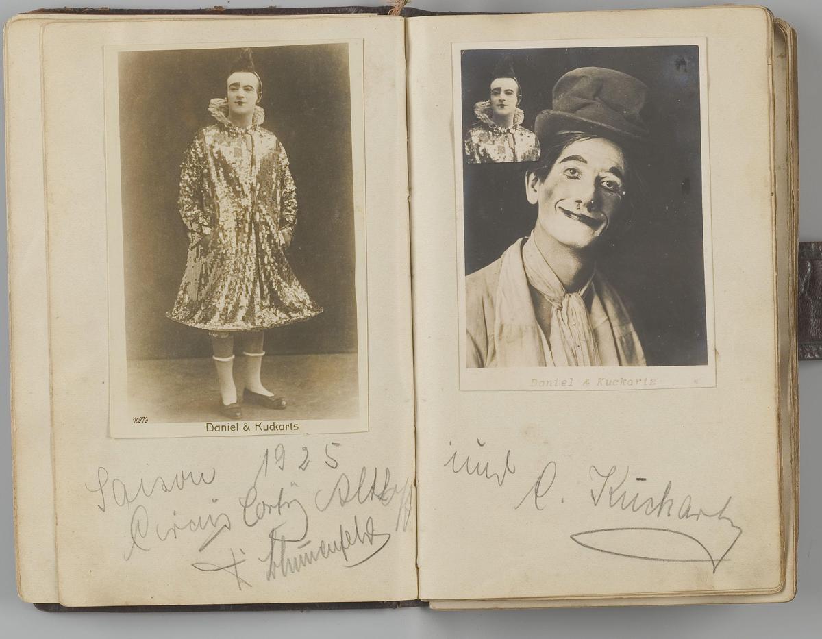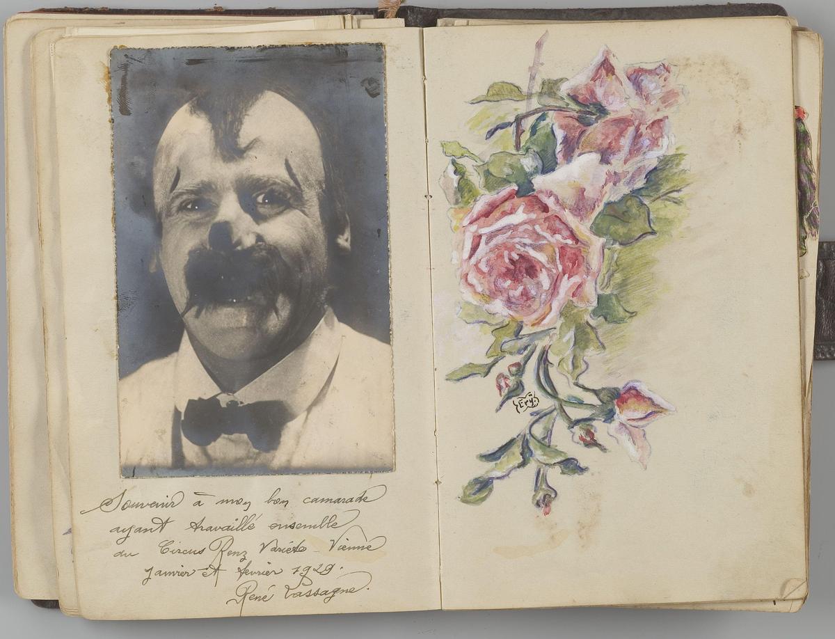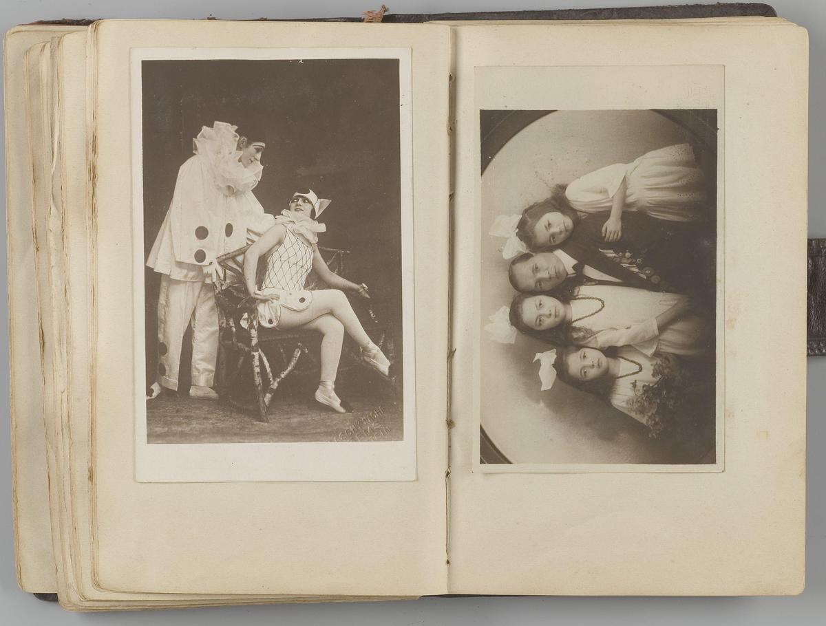 Opengeslagen fotoalbum, met foto's van clowns. Album...