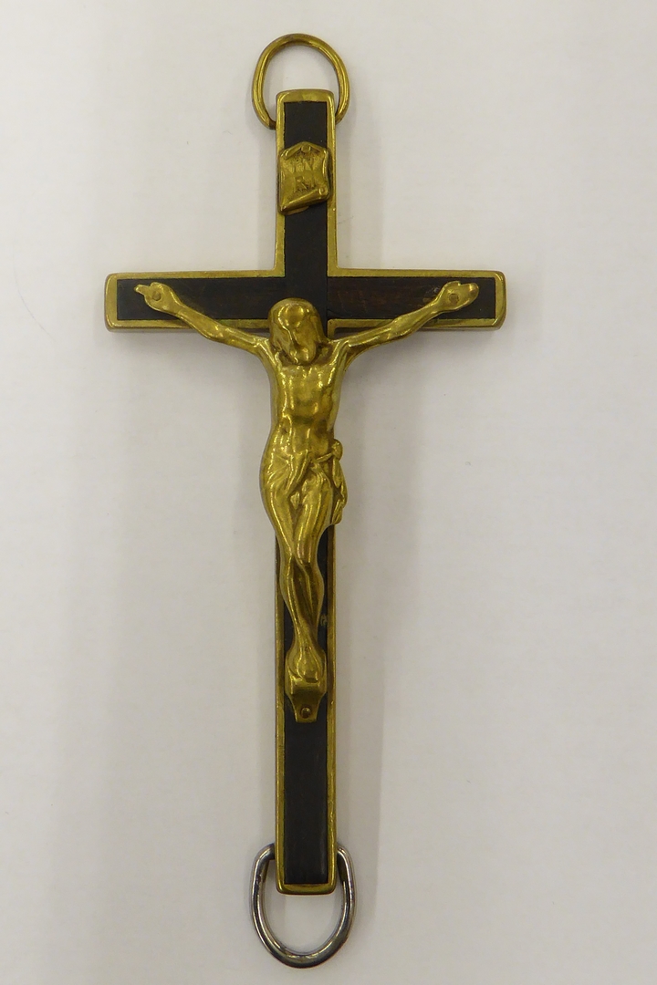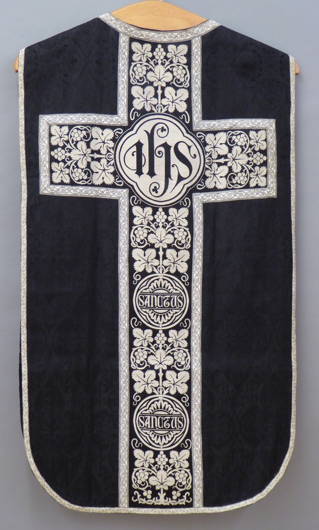 Zwart kazuifel met geweven sierstrook en kruis met I...