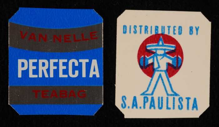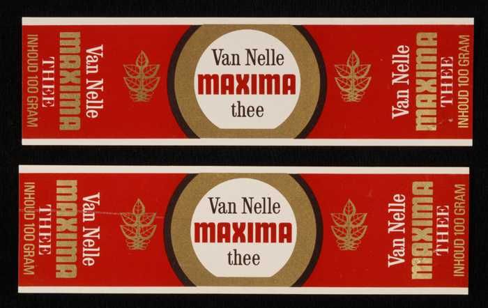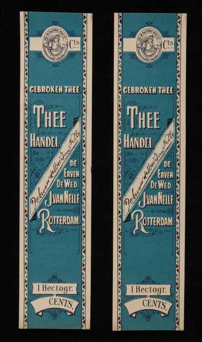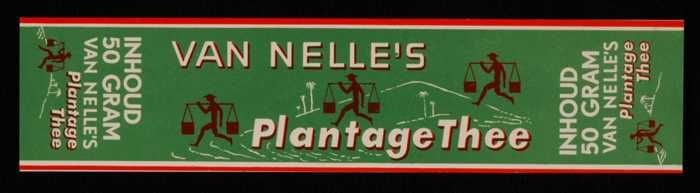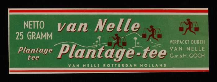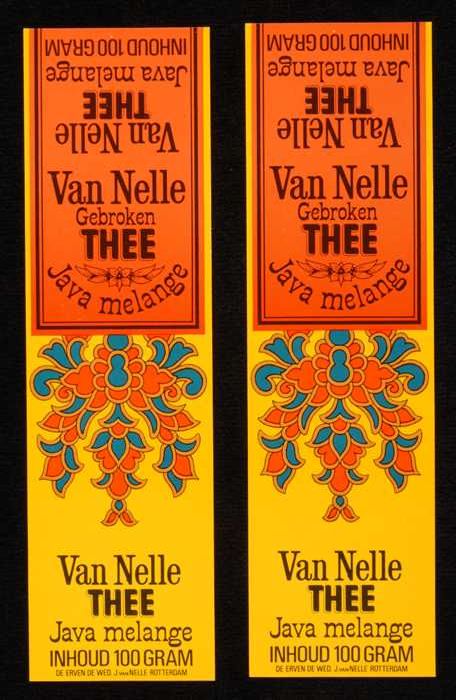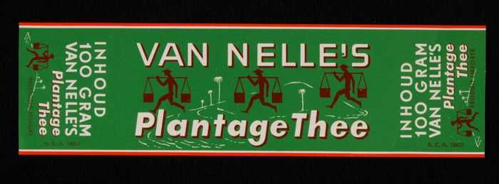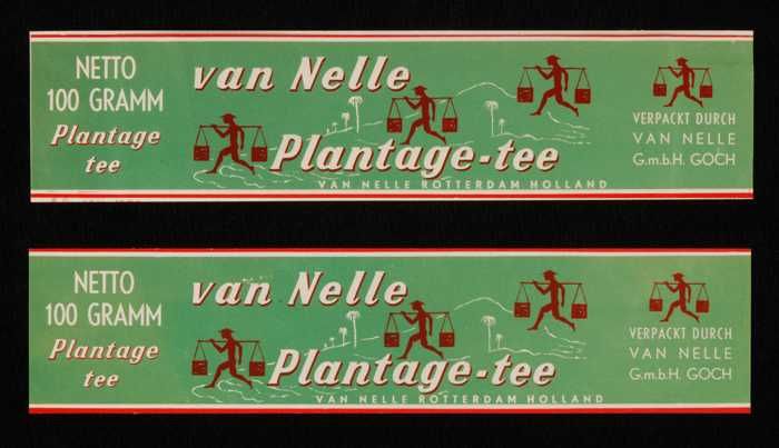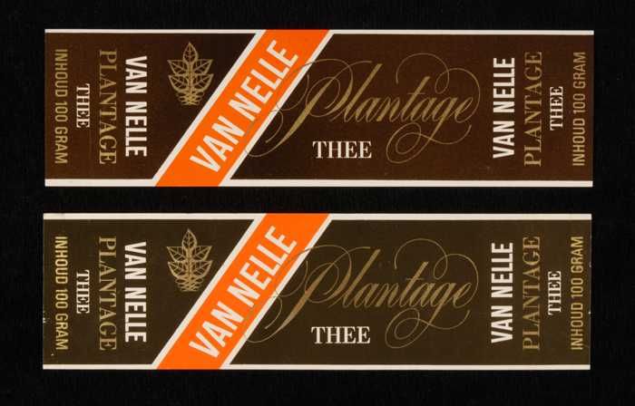 Twee bruine labels VAN NELLE PLANTAGE THEE, 100 gram