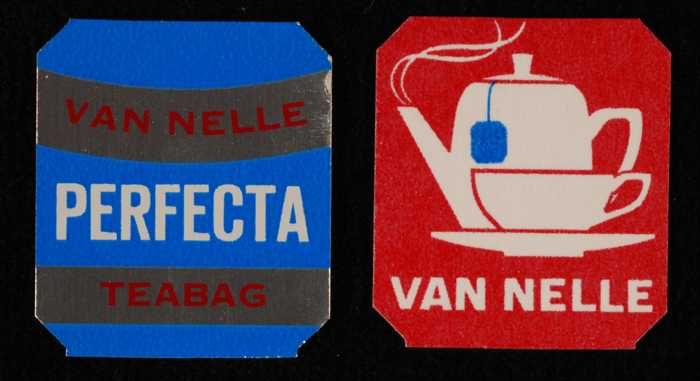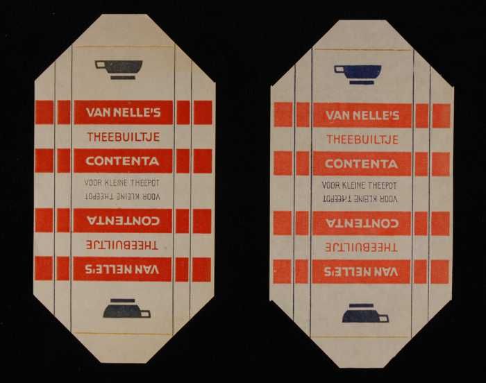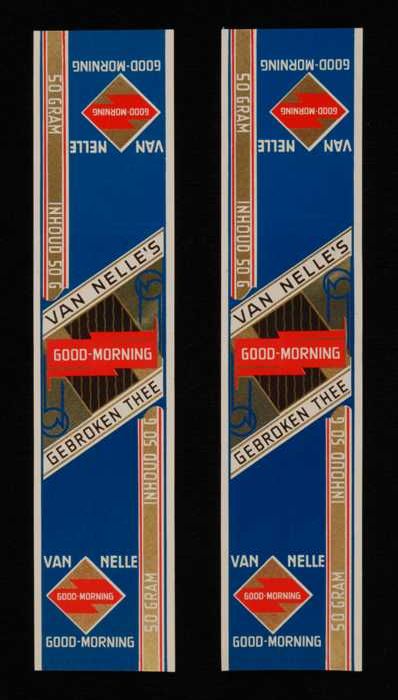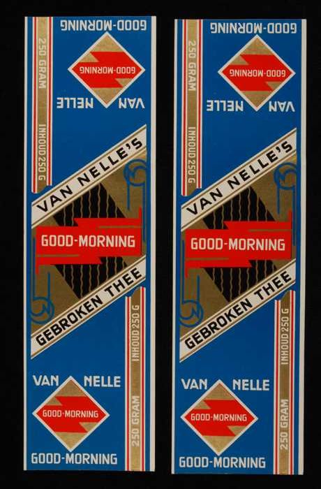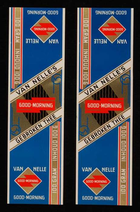 Twee blauw, goud en rode labels VAN NELLE'S GOOD-MOR...