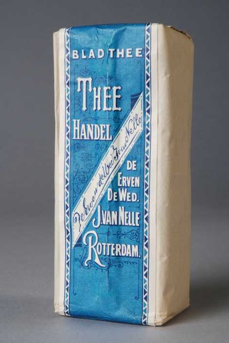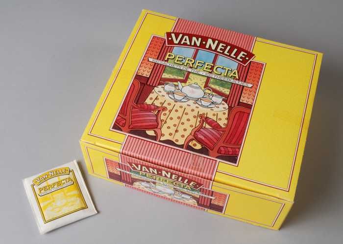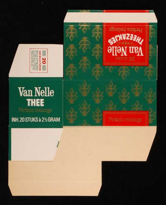 Wit, papieren pak VAN NELLE THEE, met blauw en grijs...
