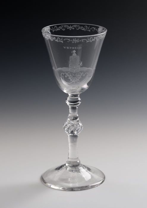 Kelkglas gegraveerd met vogelkooi, vogeltje en "Vrij...