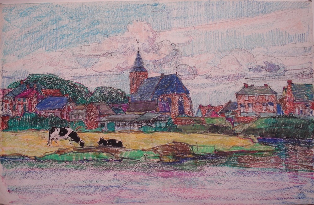 krijttekening op papier 'Dorpsgezicht' (onbekend) ni...
